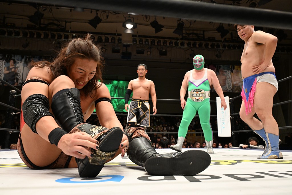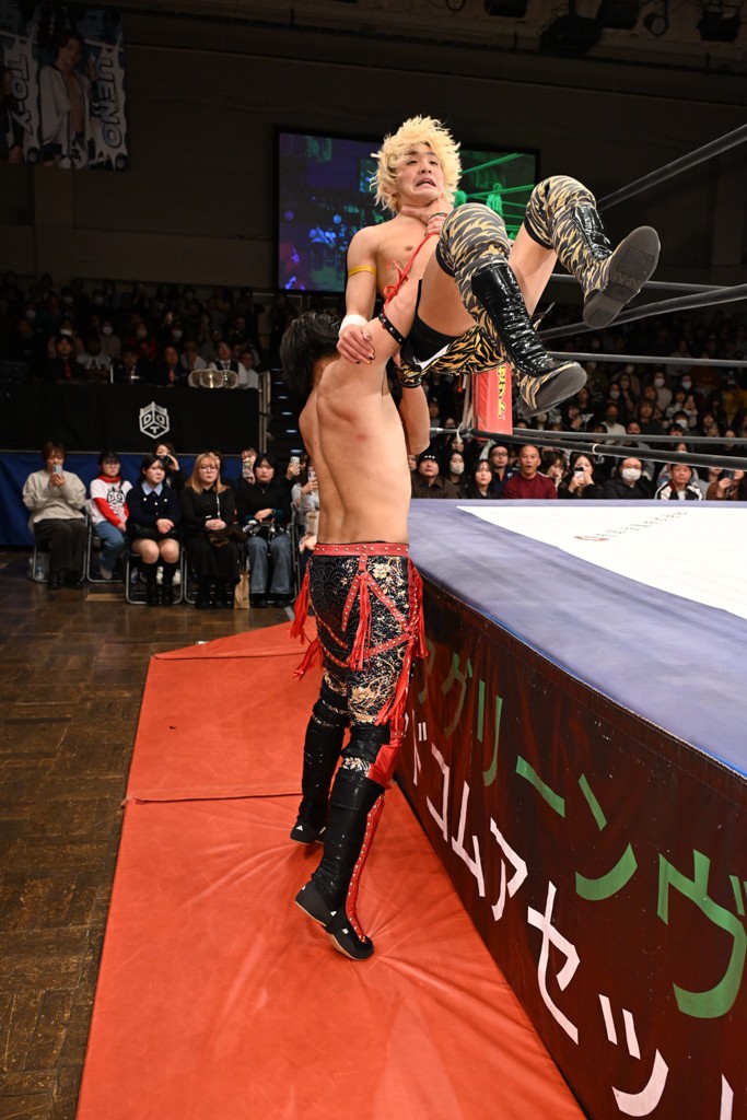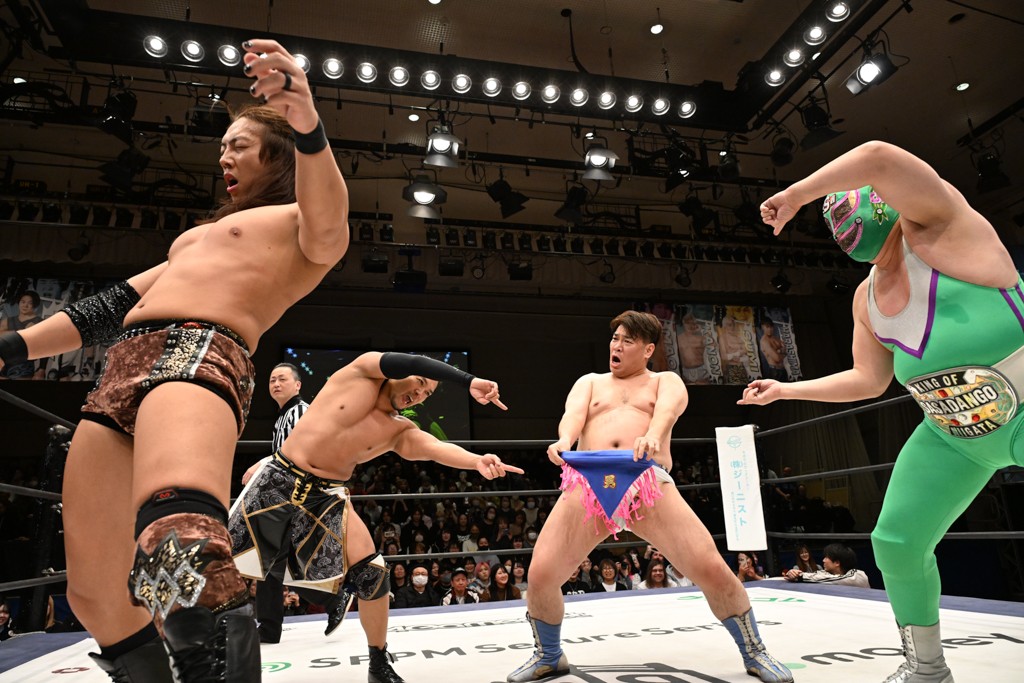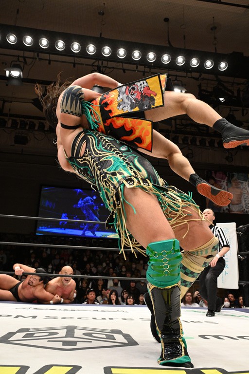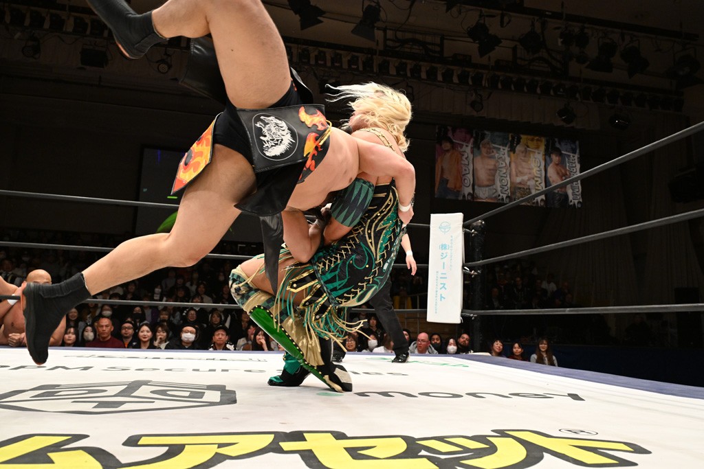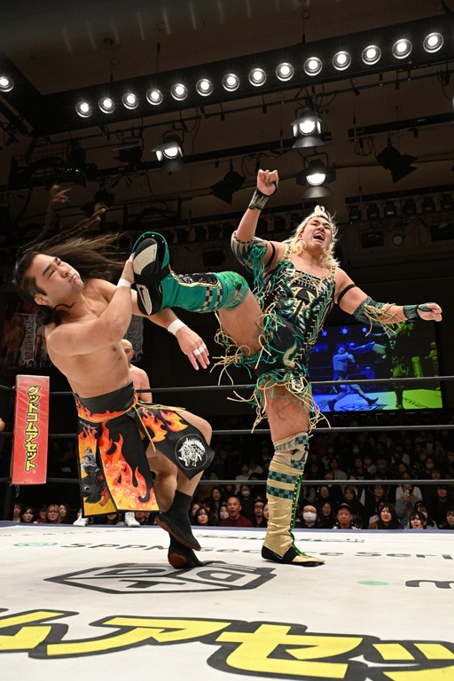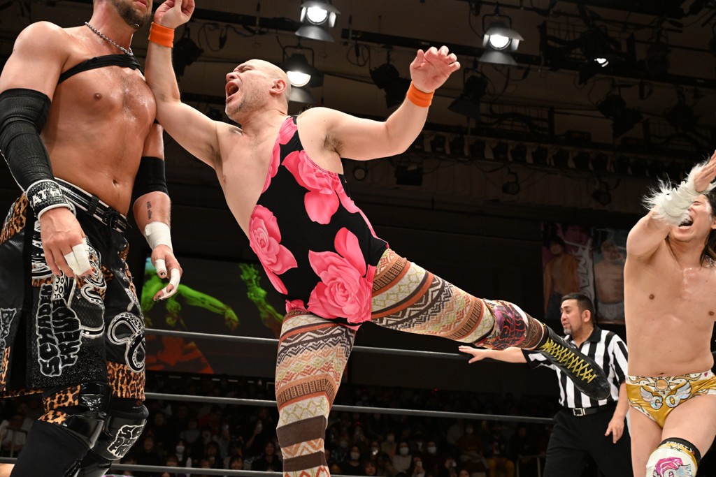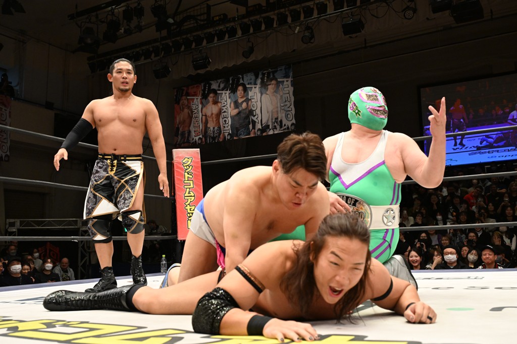 また、翌日(4日)に新日本プロレス・東京ドーム大会でのIWGP GLOBALヘビー級王者・辻陽太とのダブルタイトル戦を控える、IWGP世界ヘビー級王者のKONOSUKE TAKESHITAが彰人との元ALL OUTコンビで、男色ディーノ&スーパー・ササダンゴ・マシンと対戦。