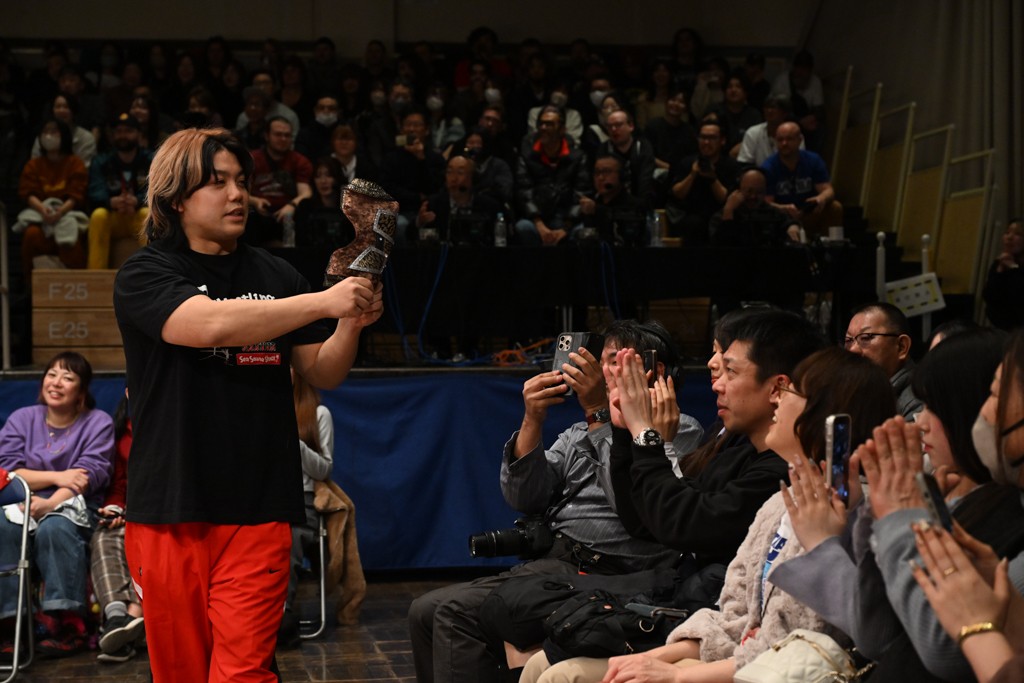 武知は2024年2・25後楽園で鮮烈なプロレスデビューを果たした。昨年6月にはプロレスラーとして、DDTに入団。同年9・28後楽園では上野、To-yとのトリオで岡谷英樹&MJポー&イルシオンとのKO-D6人タッグ王座決定戦に臨み、イルシオンに勝利。わずかデビュー5戦目で自力初勝利、タイトル初戴冠の快挙を成し遂げた。11・3両国国技館ではIWGP世界ヘビー級王者KONOSUKE TAKESHITAとの夢のタッグで、樋口和貞&正田壮史と激闘を繰り広げて白星をマーク。11・19後楽園では新日本プロレスに初参戦し、1・4東京ドーム大会でのNEVER無差別級6人タッグ選手権試合(トルネードランボー)への出場が決まった。一連の活躍が認められて「プロレス大賞」(東京スポーツ新聞社制定)の新人賞を受賞した。