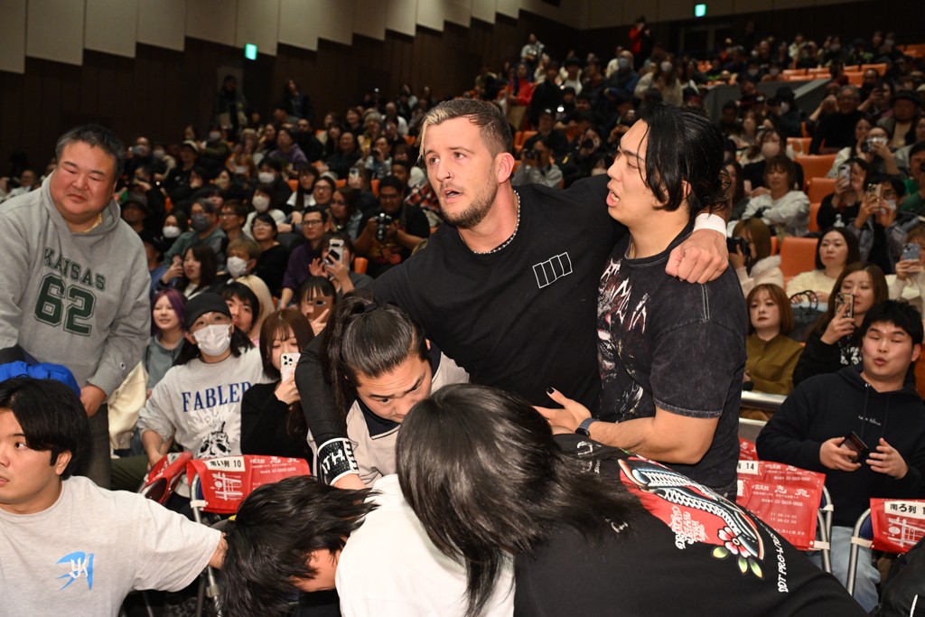 試合後、今林久弥GMが武知の次戦(1・25後楽園)の対戦カードをHARASHIMA&武知vsTAKESHITA&秋山と発表。リングインした秋山は「武知君、初めてだな。56だけど、親子ゲンカみたいなもんだ。思いっきりいくから、思いっきり来いよ!」と発言。11・3両国での試合後、握手を拒まれたTAKESHITAは「武知海青、やっとできるな。プロレス大賞新人賞獲って、プロレスが楽しくなってきてる頃だと思うよ。でも俺は強いぞ。プロレスが怖くなるかもしれへん。ただ、おまえはそれを乗り越えてくるレスラーだと思ってるから、秋山さん同様、思いっきりいかせてもらう」と通告。