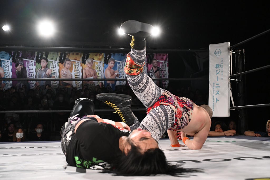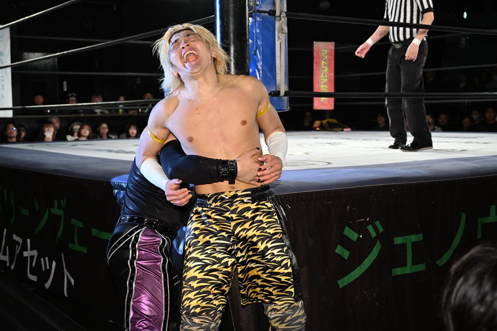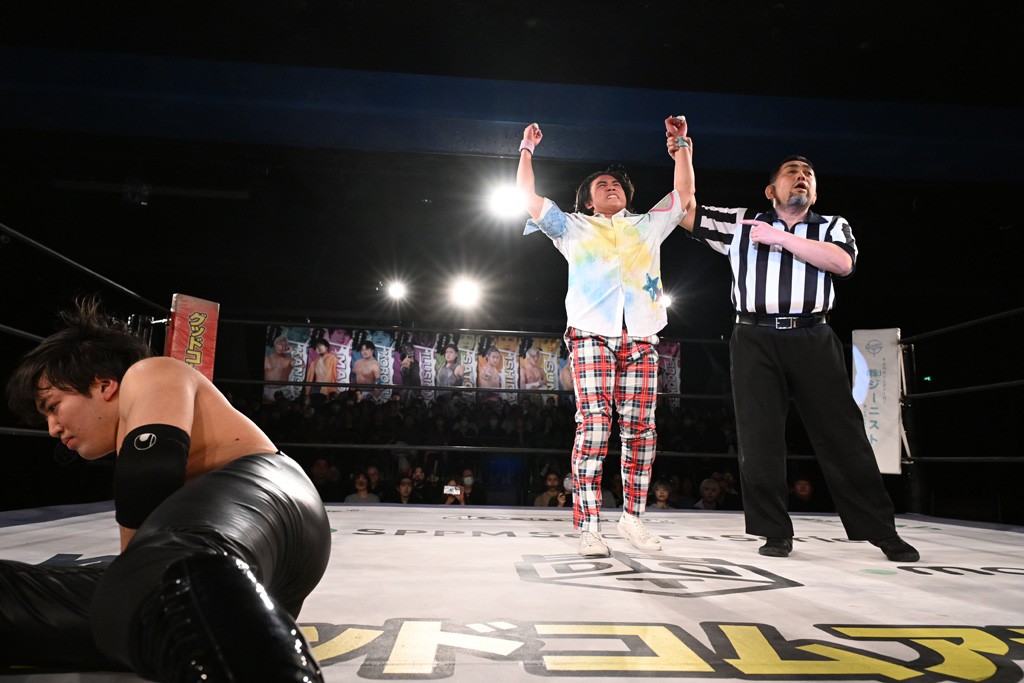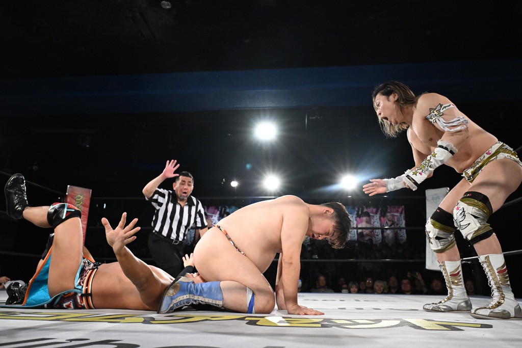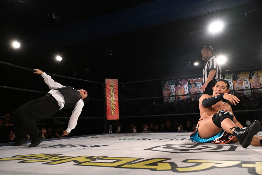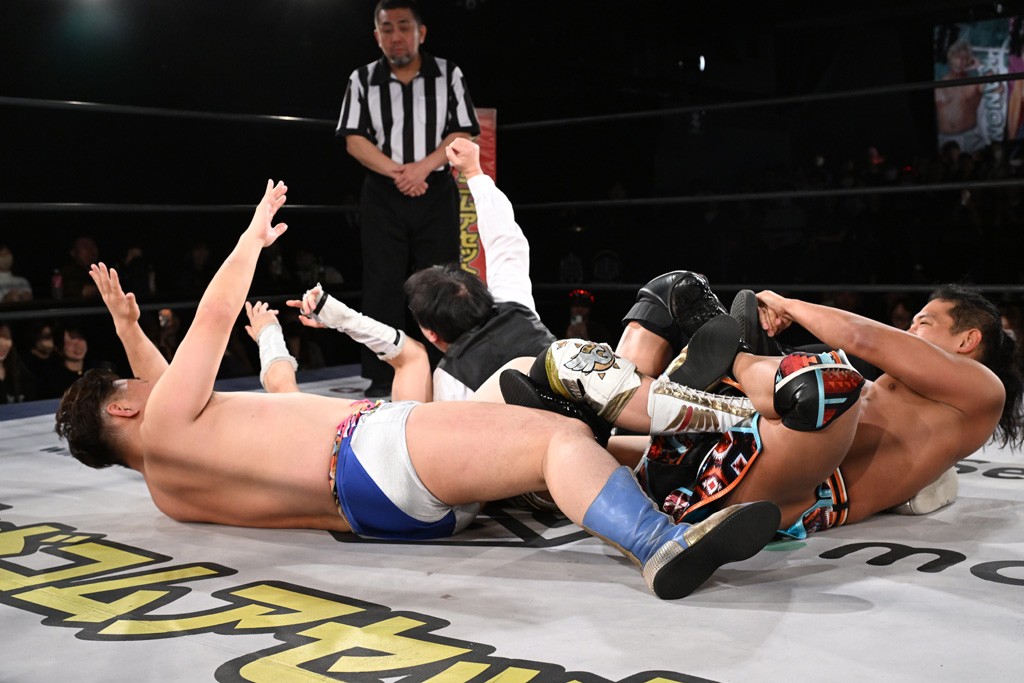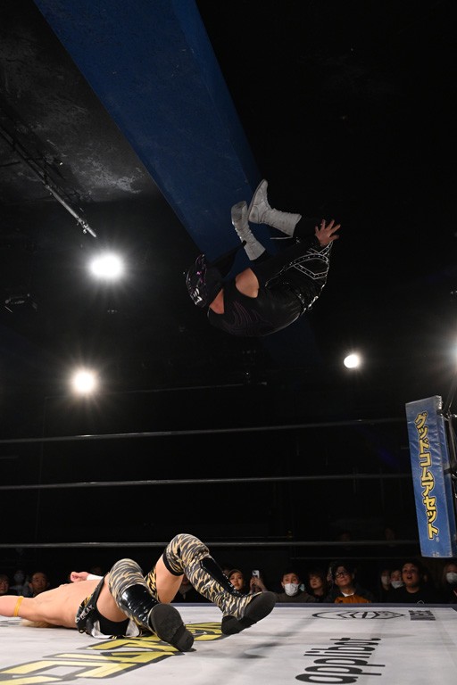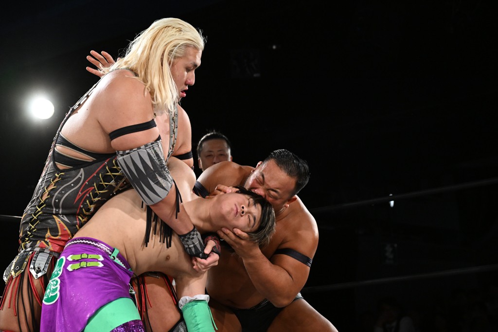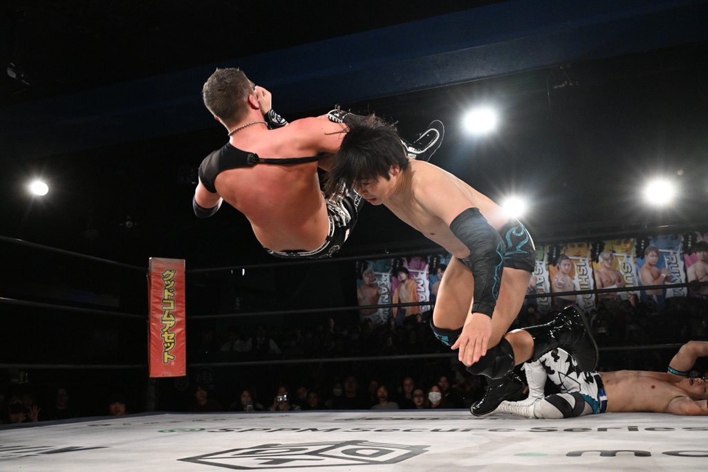 1・25後楽園でのKO-Dタッグ選手権試合(王者組=MAO&KANON《STRANGE LOVE CONNECTION=S.L.C.》vs挑戦者組=飯野雄貴&納谷幸男《The Apex》)の前哨戦はThe ApexがS.L.C.を撃破し、ベルト奪還を宣言した。