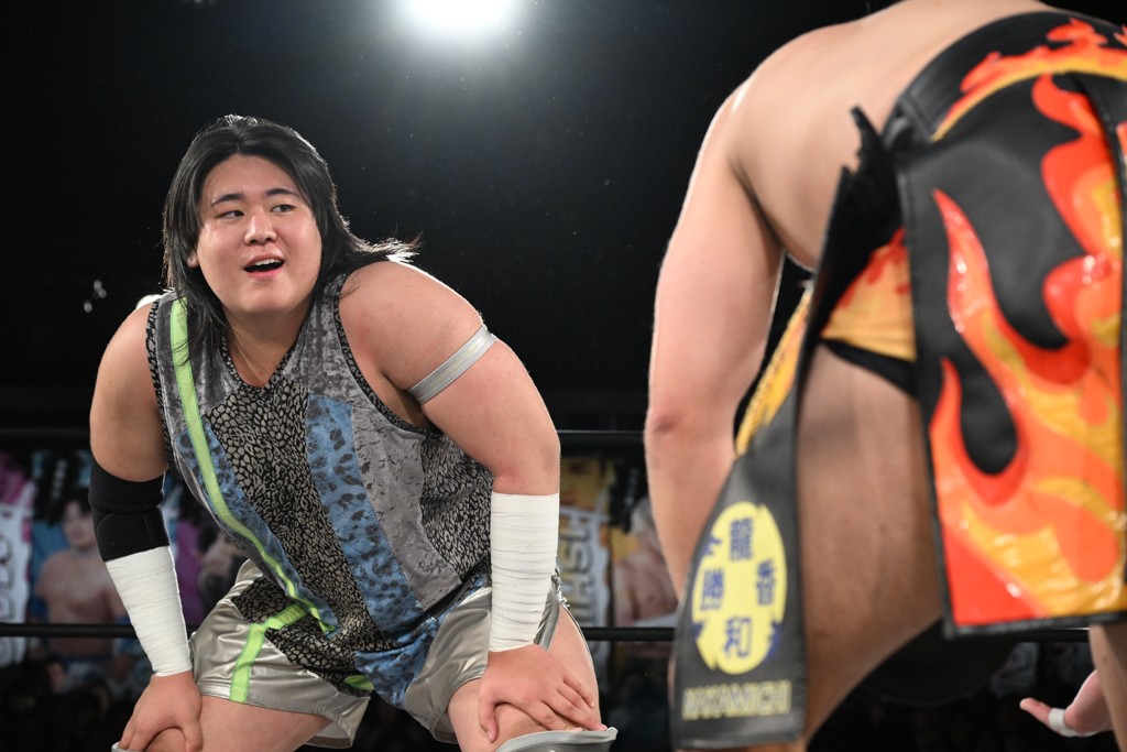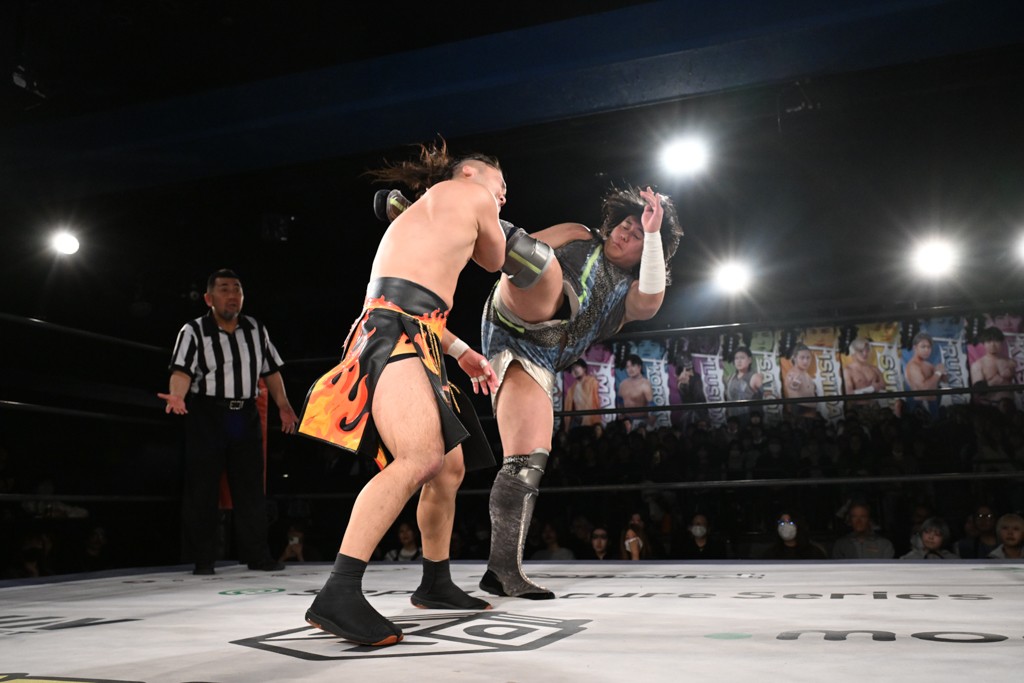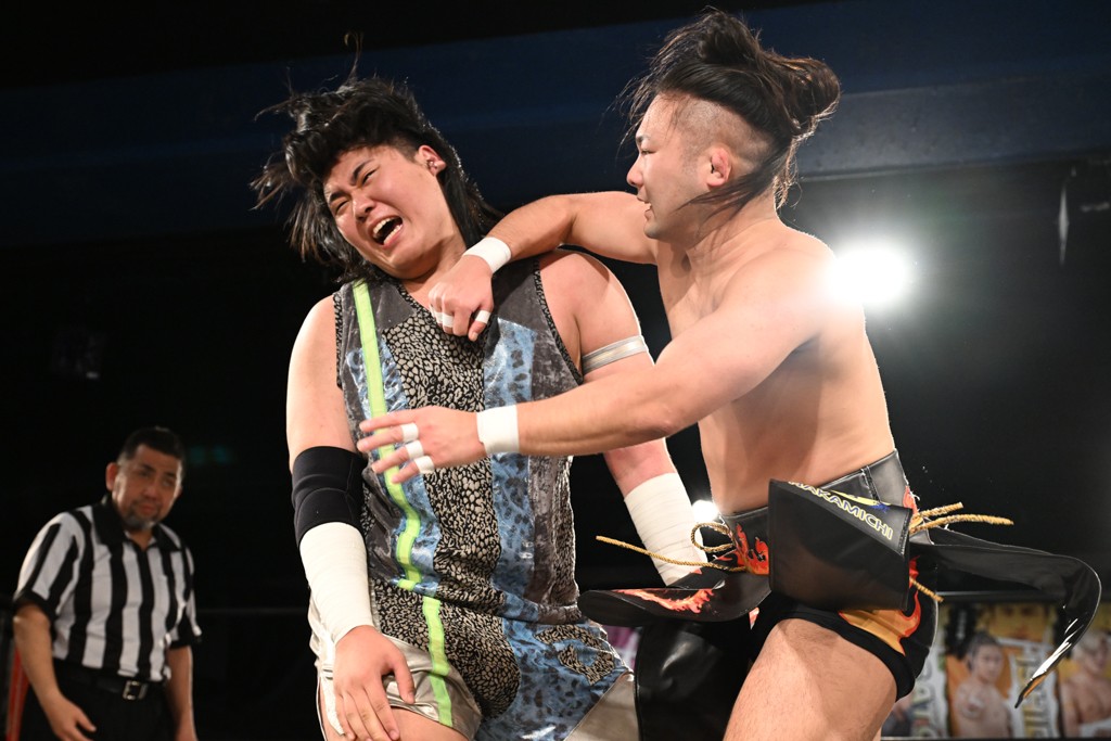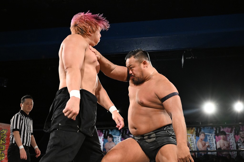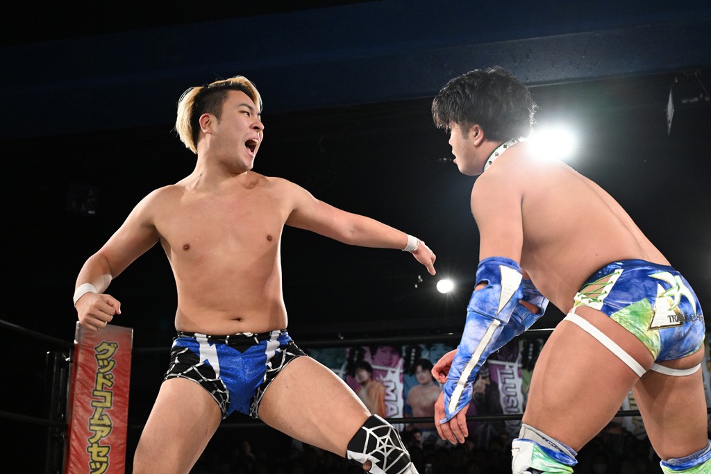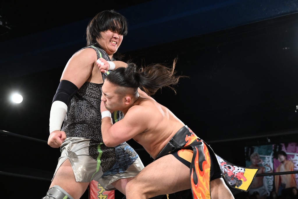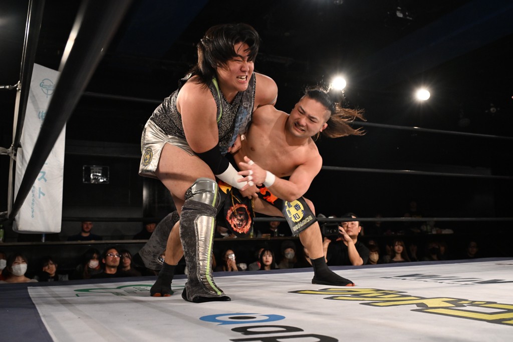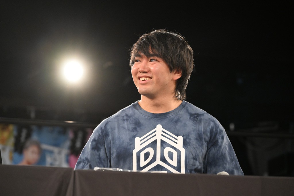 また、同じAブロックでは石田有輝が高校2年生の佐藤大地と激突。大地は昨年4月にHEAT-UPから移籍し、「DGC」初出場。両者のデビューは1カ月違いで、プロレスキャリアでは同期となる。石田がフライングどすこい、雪崩式ブレーンバスター、小股すくいスープレックスで攻め立てると、大地はミドルキック、ジャーマンで反撃。石田が猫だましからどすこいクラッチも2カウント。大地はファイアーサンダーから重爆マッドスプラッシュを投下してトドメを刺した。佐藤は「勝ったぞ! この勢いで2試合目、3試合目、4試合目勝って、優勝するよ!」と優勝宣言。