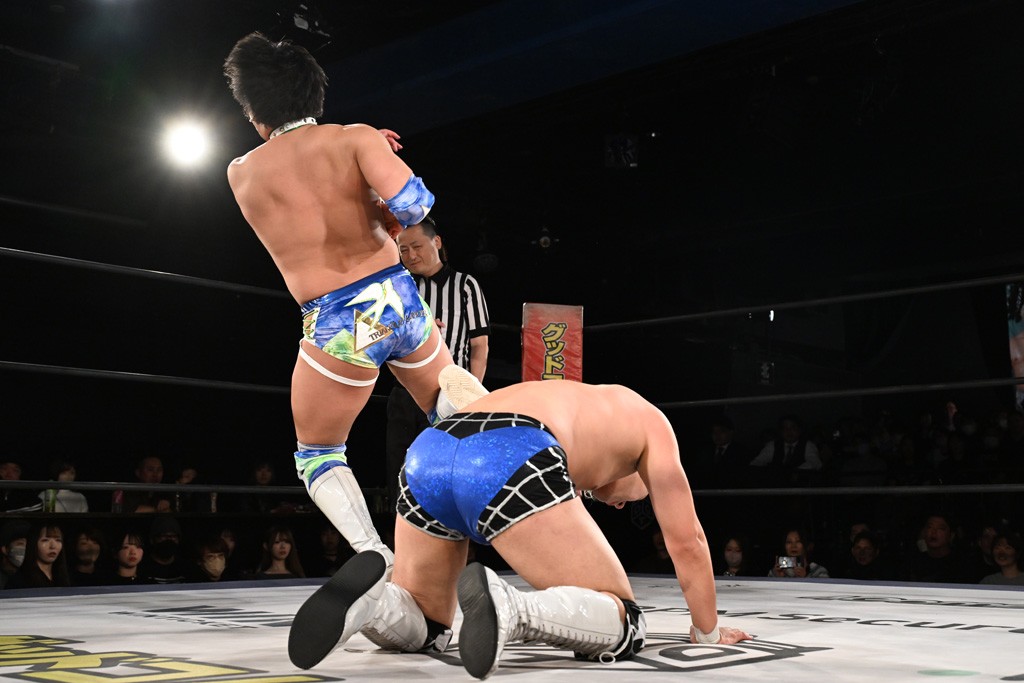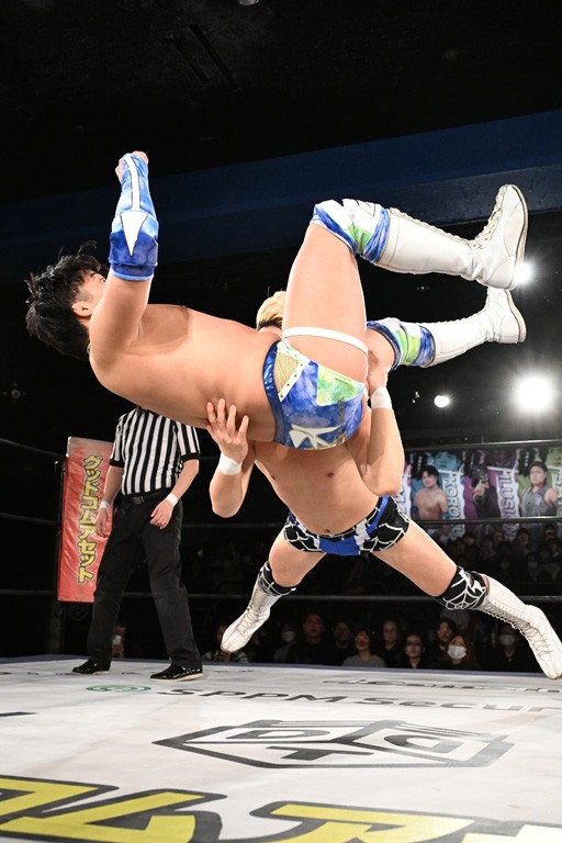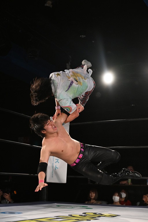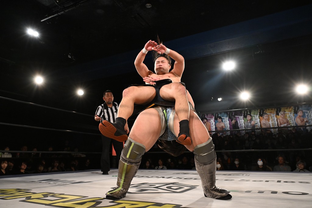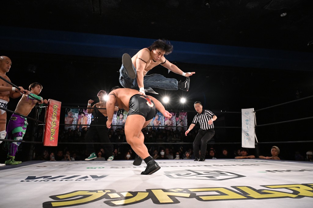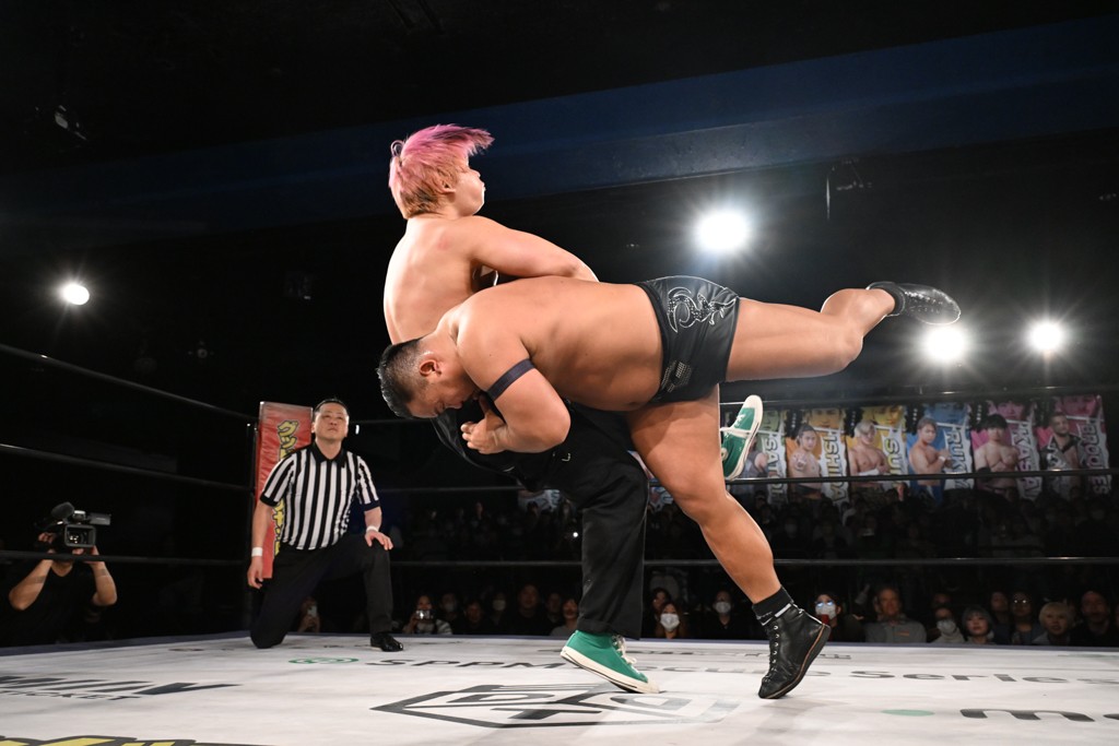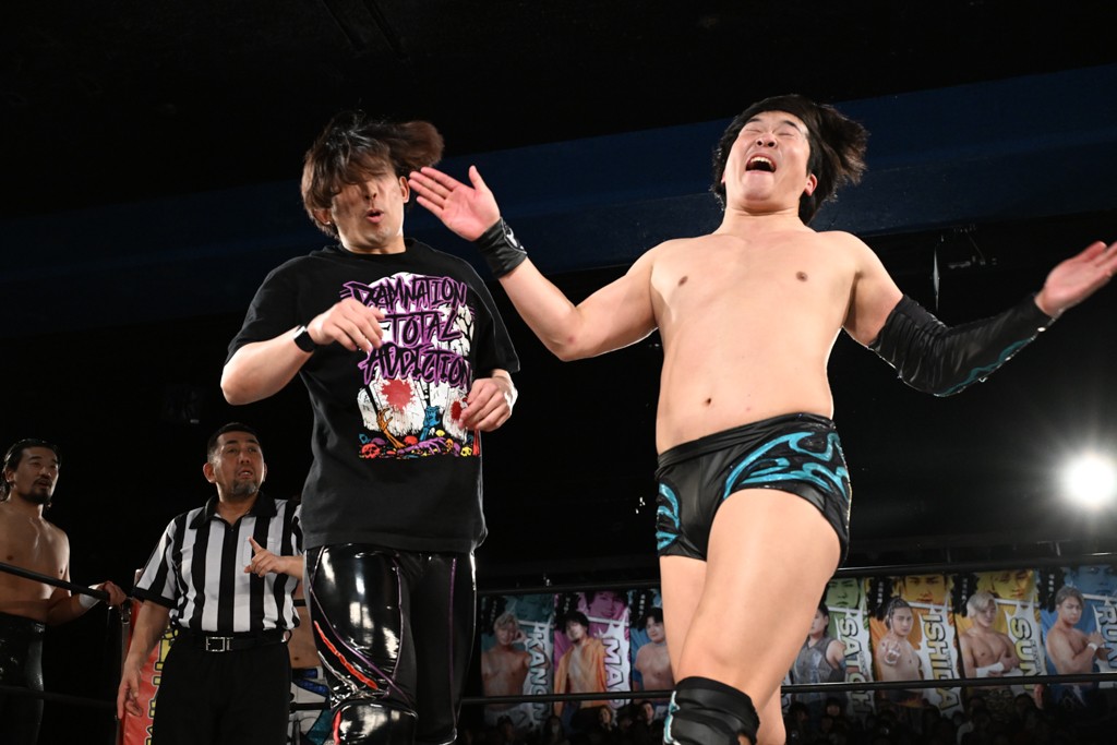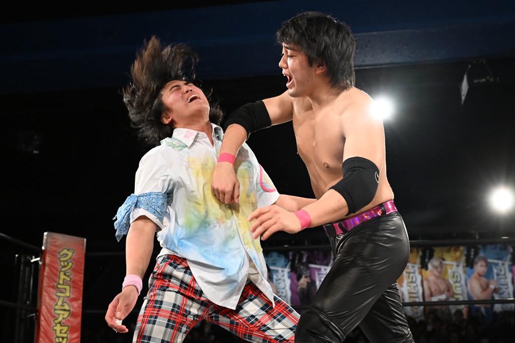 また、同じAブロックでは石田有輝が高校2年生の佐藤大地と激突。大地は昨年4月にHEAT-UPから移籍し、「DGC」初出場。両者のデビューは1カ月違いで、プロレスキャリアでは同期となる。石田がフライングどすこい、雪崩式ブレーンバスター、小股すくいスープレックスで攻め立てると、大地はミドルキック、ジャーマンで反撃。石田が猫だましからどすこいクラッチも2カウント。大地はファイアーサンダーから重爆マッドスプラッシュを投下してトドメを刺した。佐藤は「勝ったぞ! この勢いで2試合目、3試合目、4試合目勝って、優勝するよ!」と優勝宣言。