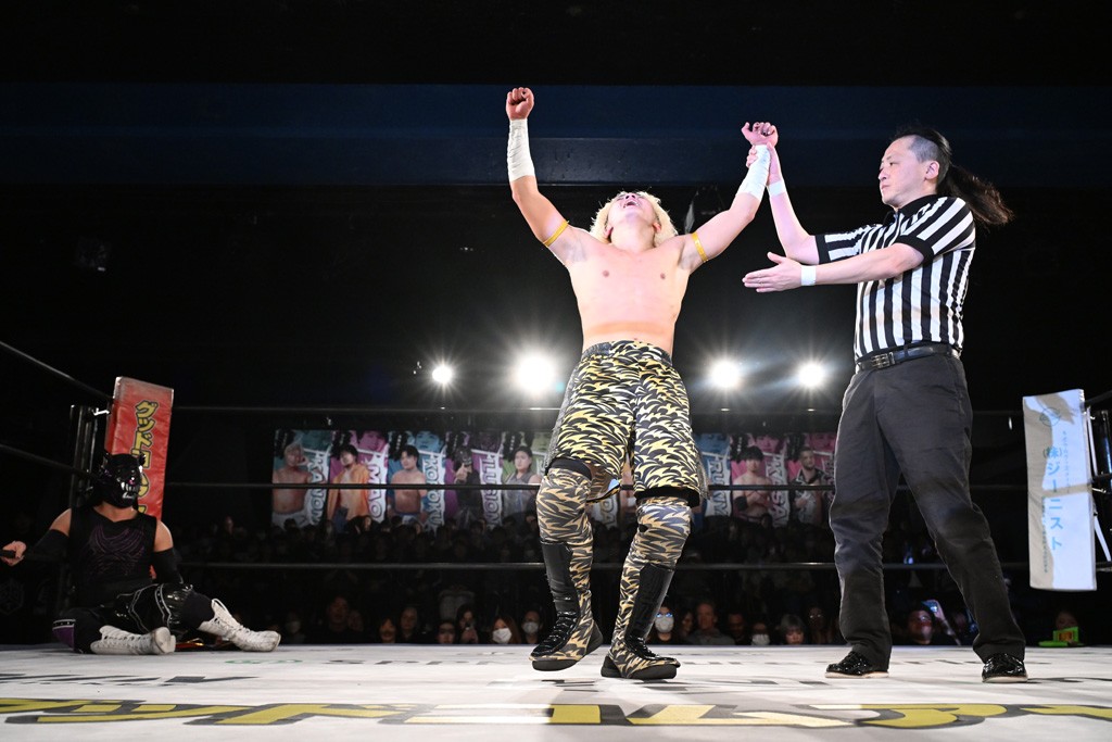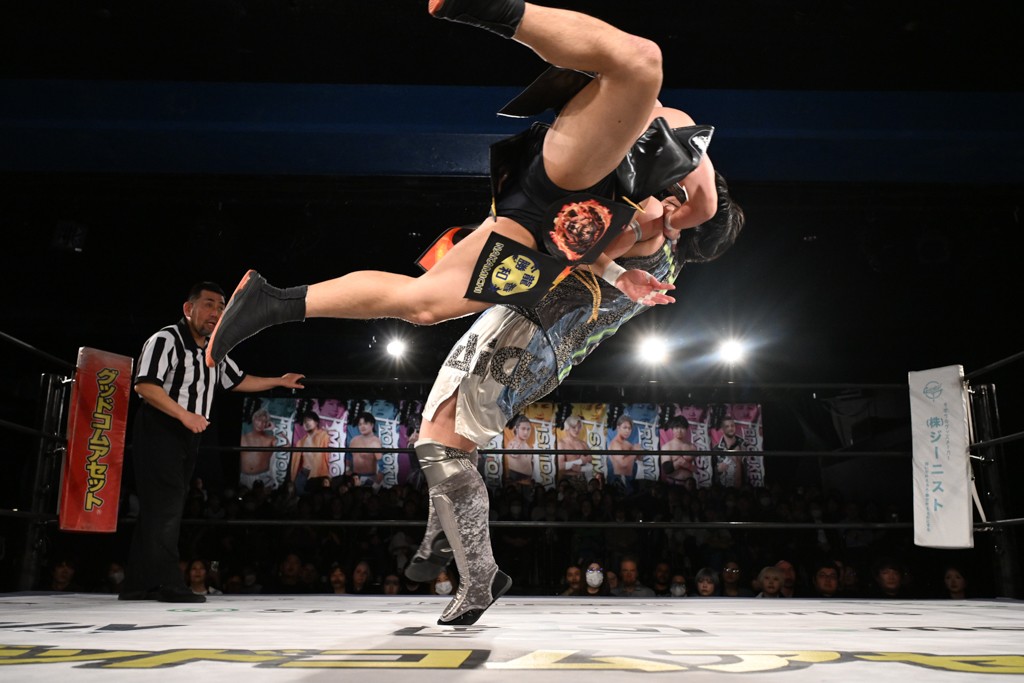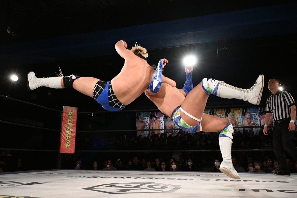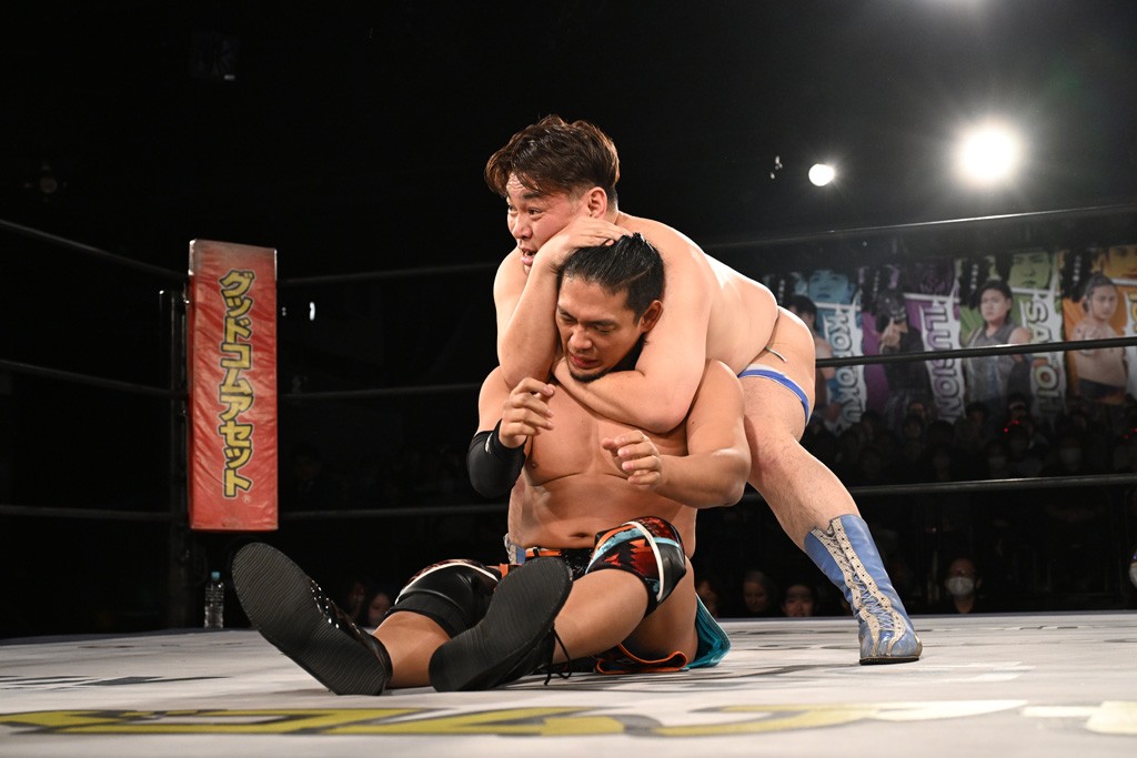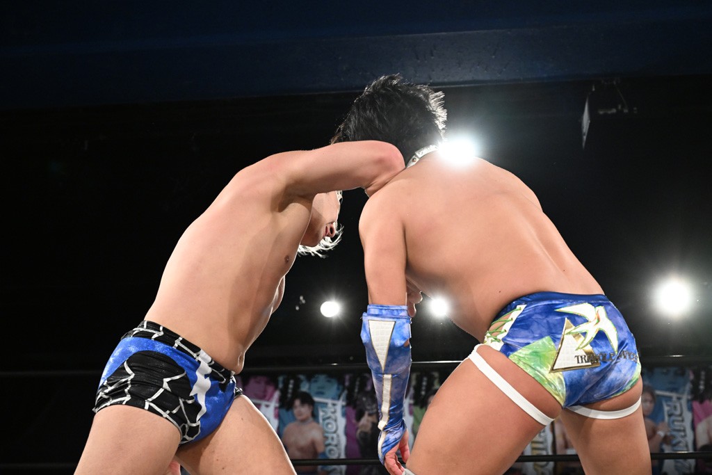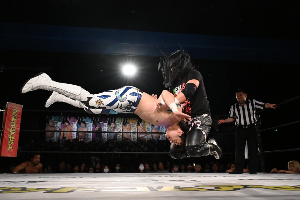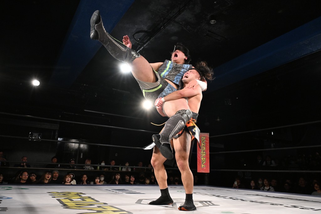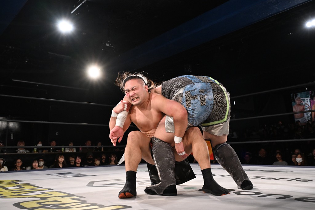 また、同じAブロックでは石田有輝が高校2年生の佐藤大地と激突。大地は昨年4月にHEAT-UPから移籍し、「DGC」初出場。両者のデビューは1カ月違いで、プロレスキャリアでは同期となる。石田がフライングどすこい、雪崩式ブレーンバスター、小股すくいスープレックスで攻め立てると、大地はミドルキック、ジャーマンで反撃。石田が猫だましからどすこいクラッチも2カウント。大地はファイアーサンダーから重爆マッドスプラッシュを投下してトドメを刺した。佐藤は「勝ったぞ! この勢いで2試合目、3試合目、4試合目勝って、優勝するよ!」と優勝宣言。