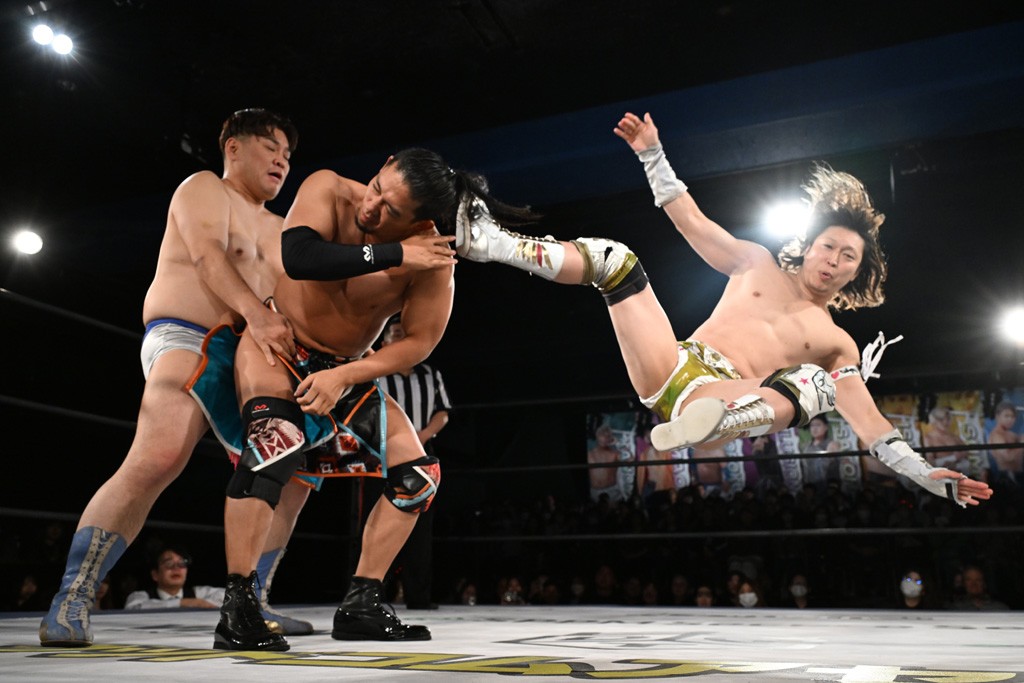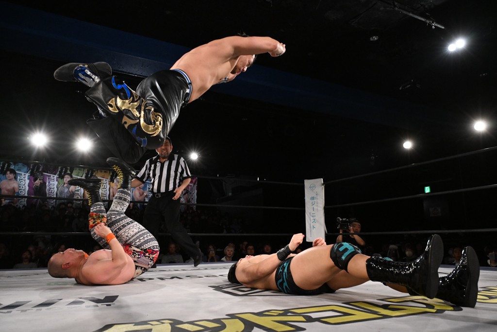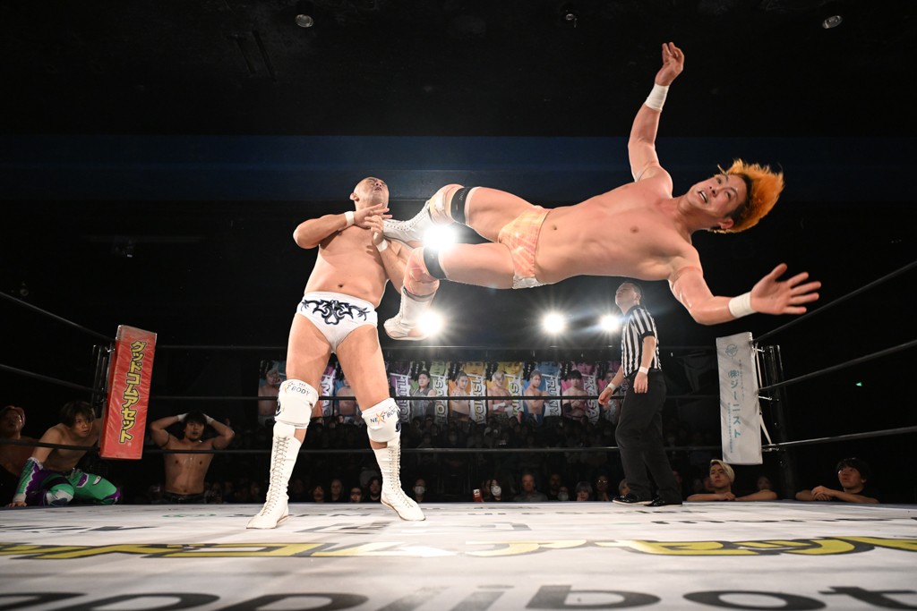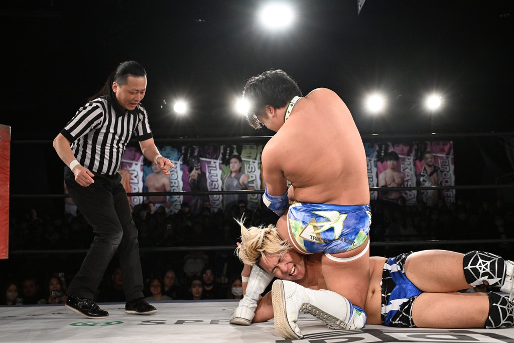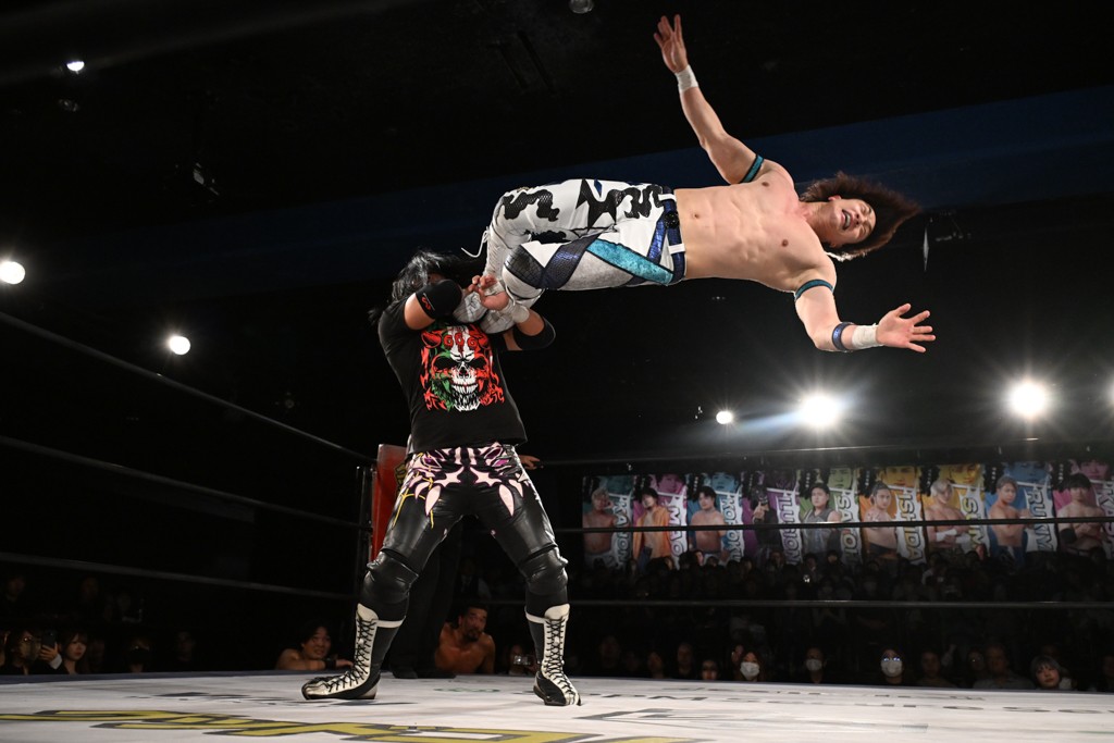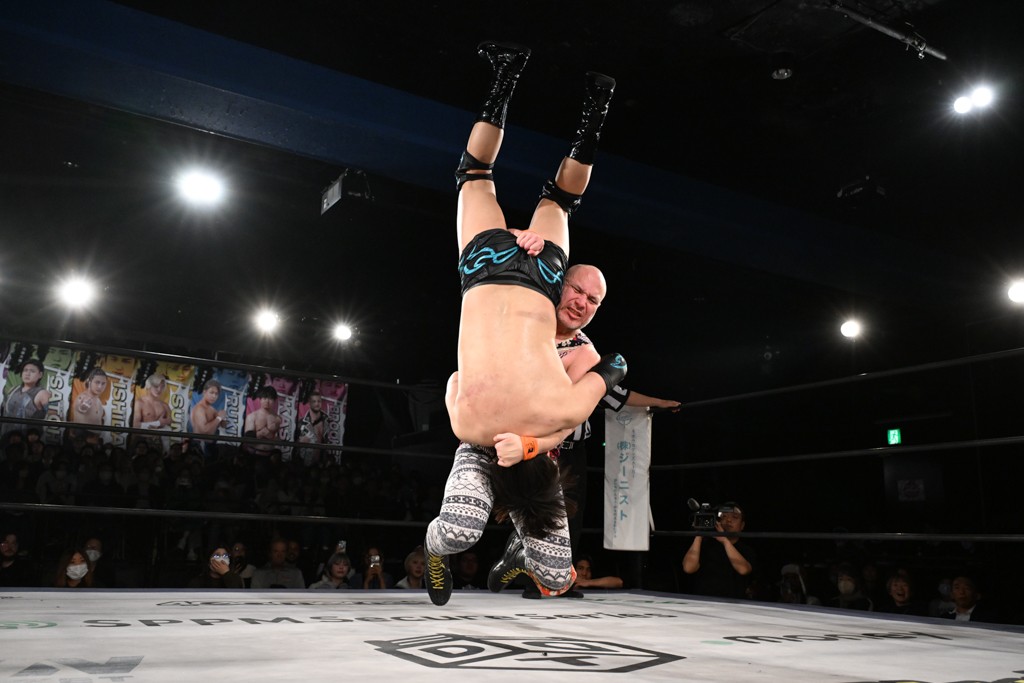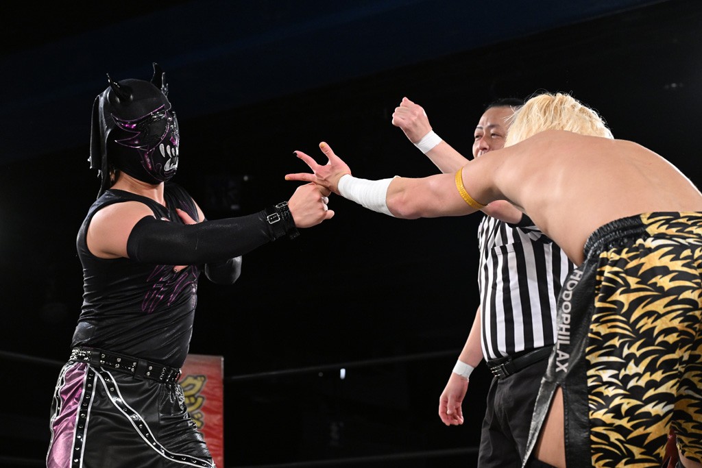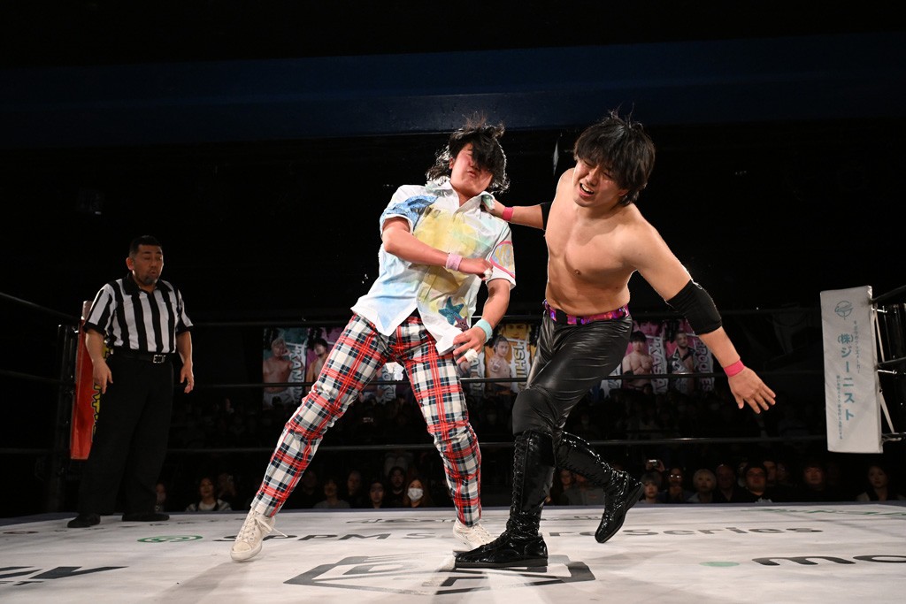 また、同じAブロックでは石田有輝が高校2年生の佐藤大地と激突。大地は昨年4月にHEAT-UPから移籍し、「DGC」初出場。両者のデビューは1カ月違いで、プロレスキャリアでは同期となる。石田がフライングどすこい、雪崩式ブレーンバスター、小股すくいスープレックスで攻め立てると、大地はミドルキック、ジャーマンで反撃。石田が猫だましからどすこいクラッチも2カウント。大地はファイアーサンダーから重爆マッドスプラッシュを投下してトドメを刺した。佐藤は「勝ったぞ! この勢いで2試合目、3試合目、4試合目勝って、優勝するよ!」と優勝宣言。