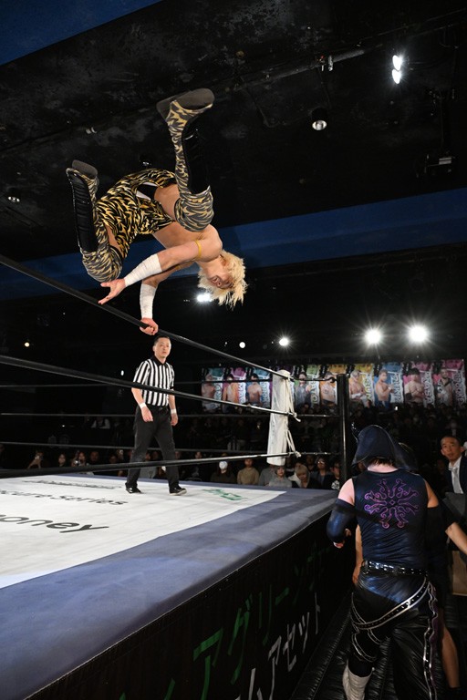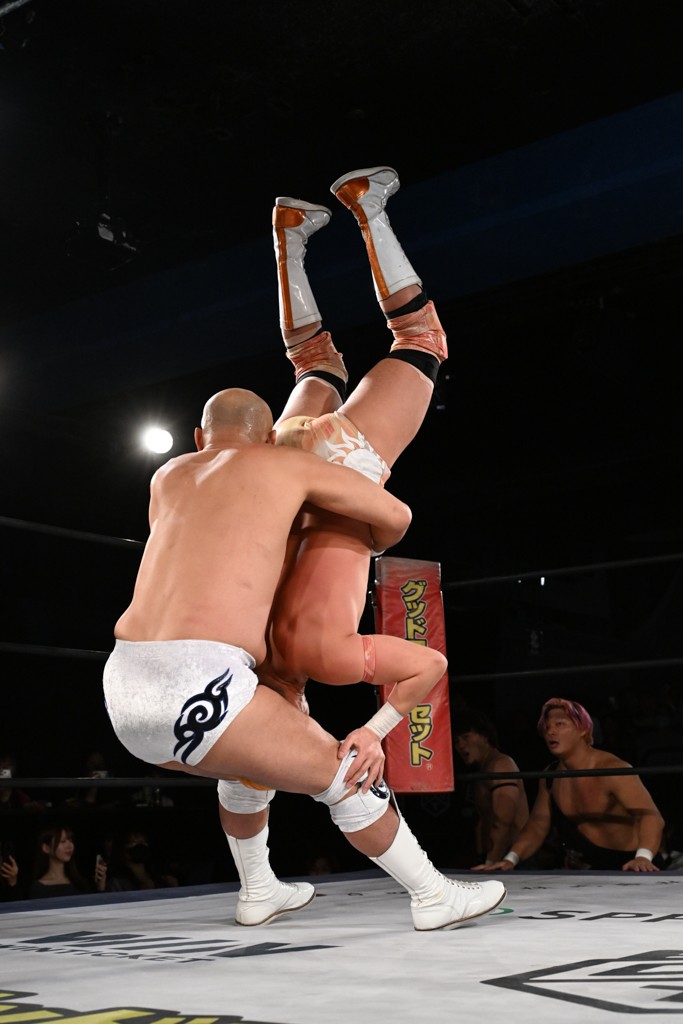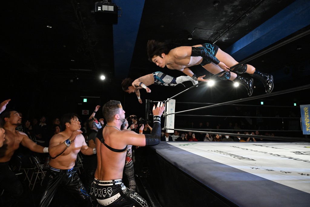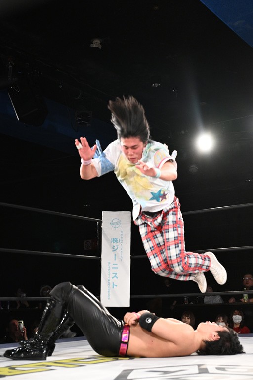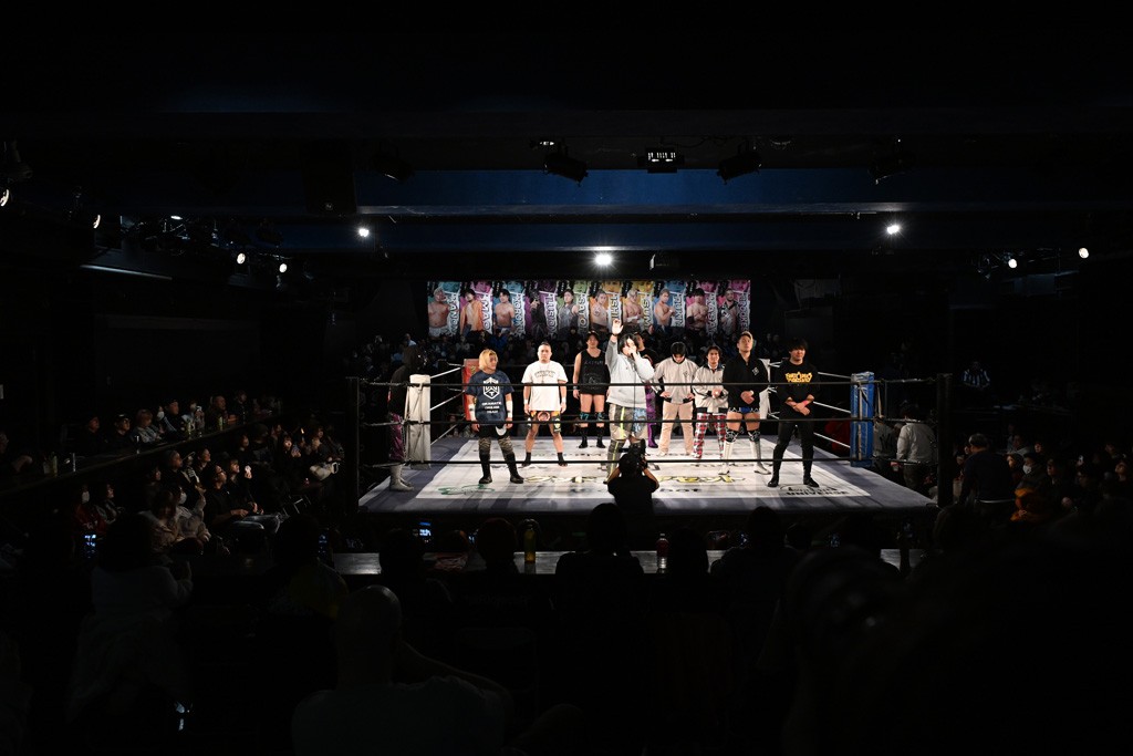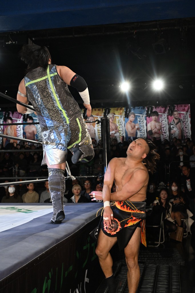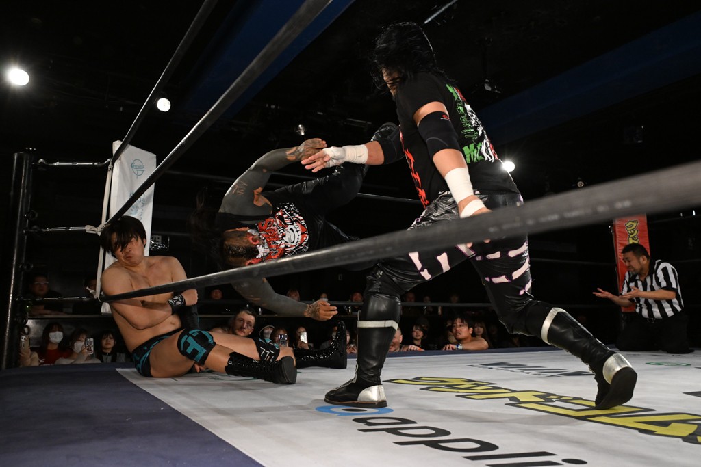 レギュラー参戦2戦目の宮脇が三角飛びプランチャを秋山に見舞うと場外戦へ。ステージ席のフロアで乱闘になると、秋山が宮脇をボディスラム。正田が中村に張り手を見舞えば、中村はドロップキックで反撃。正田がMAOにミドルキック連打。S.L.C.が納谷に連係攻撃も、納谷が2人まとめてクロスボディで吹っ飛ばした。The ApexはMAO、KANONに同時に串刺し式ボディアタック。飯野がKANONにThe Apexエルボーを狙うも失敗。KANONが飯野にミサイルキック、MAOが納谷にスリングブレイド。飯野が早口でのThe ApexエルボーがKANONにヒット。飯野とKANONがチョップのラリーに。飯野とKANONがラリアット相打ちから、飯野がスピアもKANONがキャッチ。納谷がMAOにバックドロップ、飯野がダウンしているKANONにスピア。最後は飯野がもう一発スピアを叩き込んでKANONから直接勝利を挙げた。