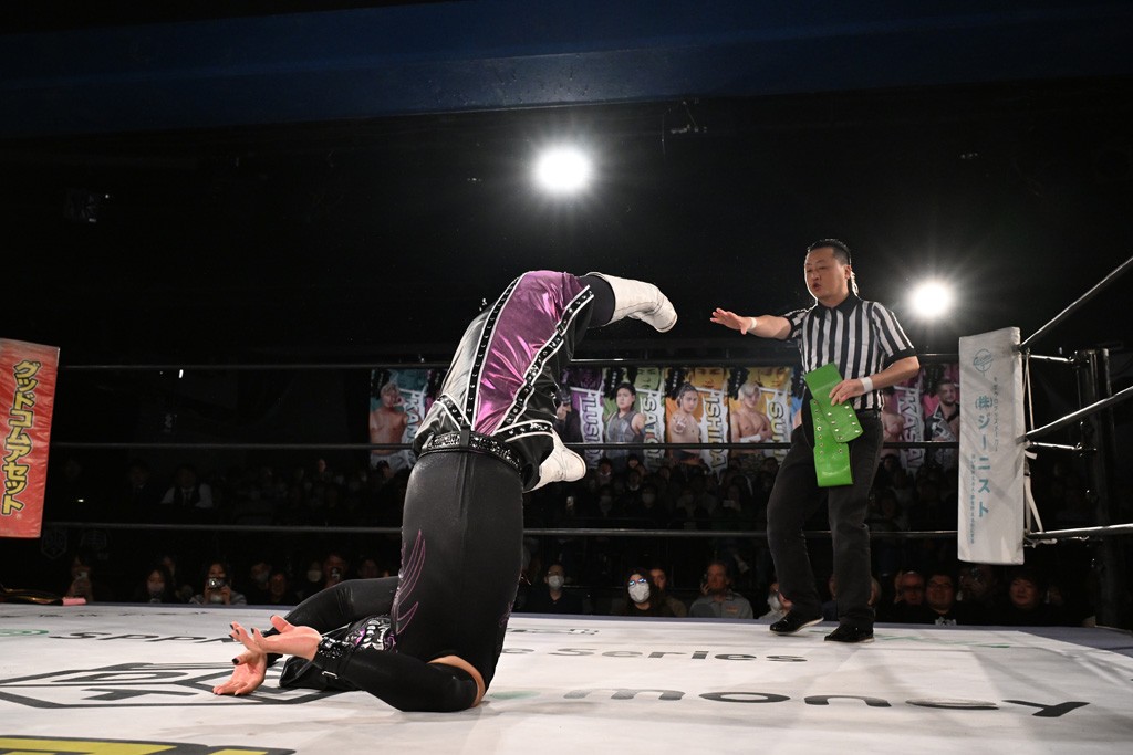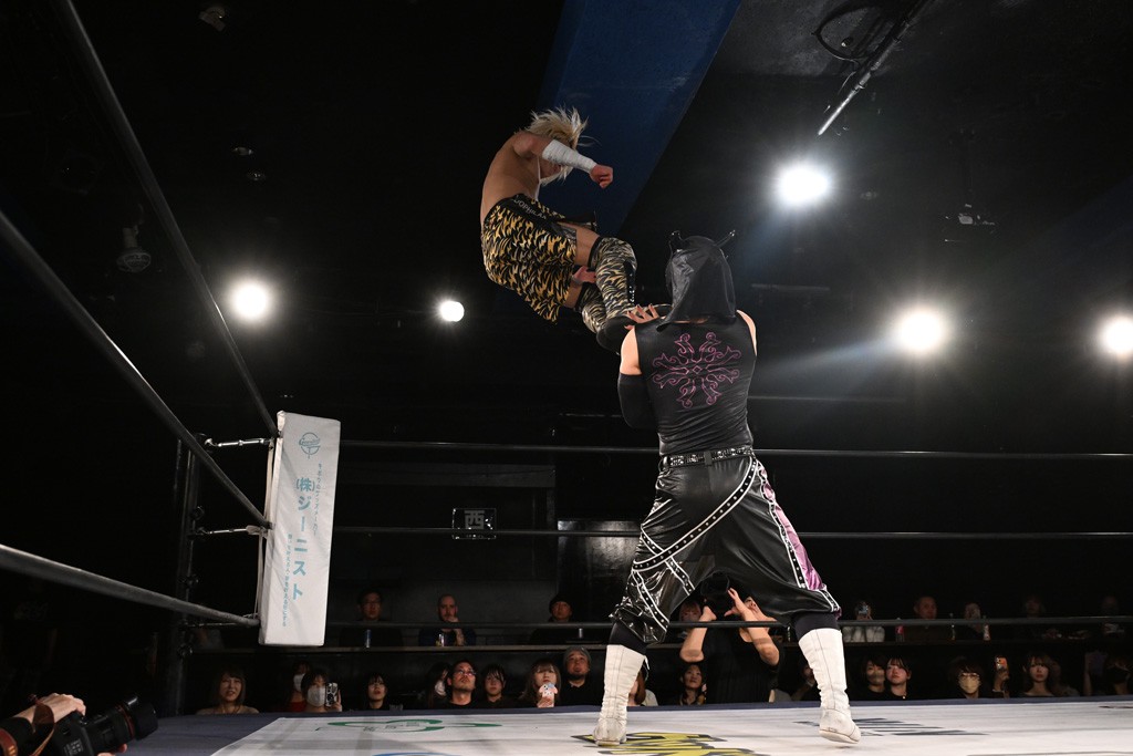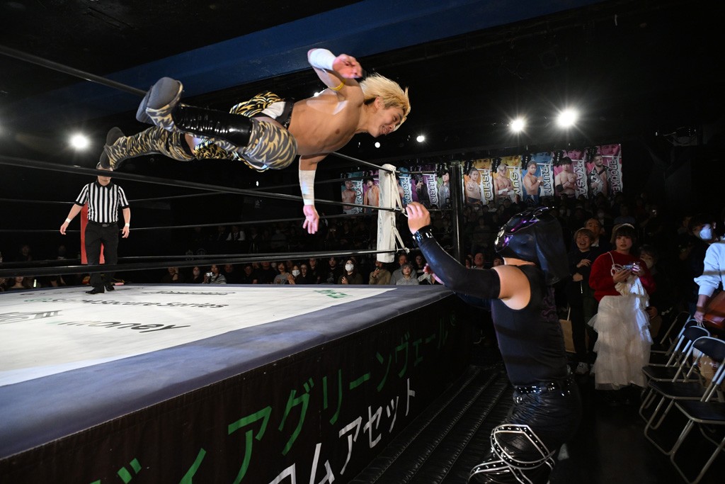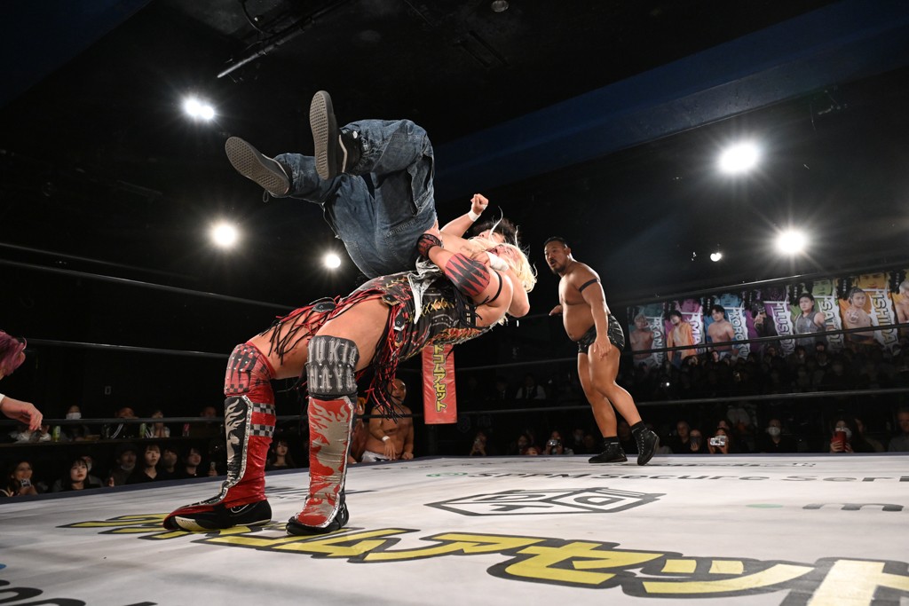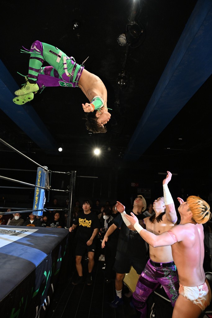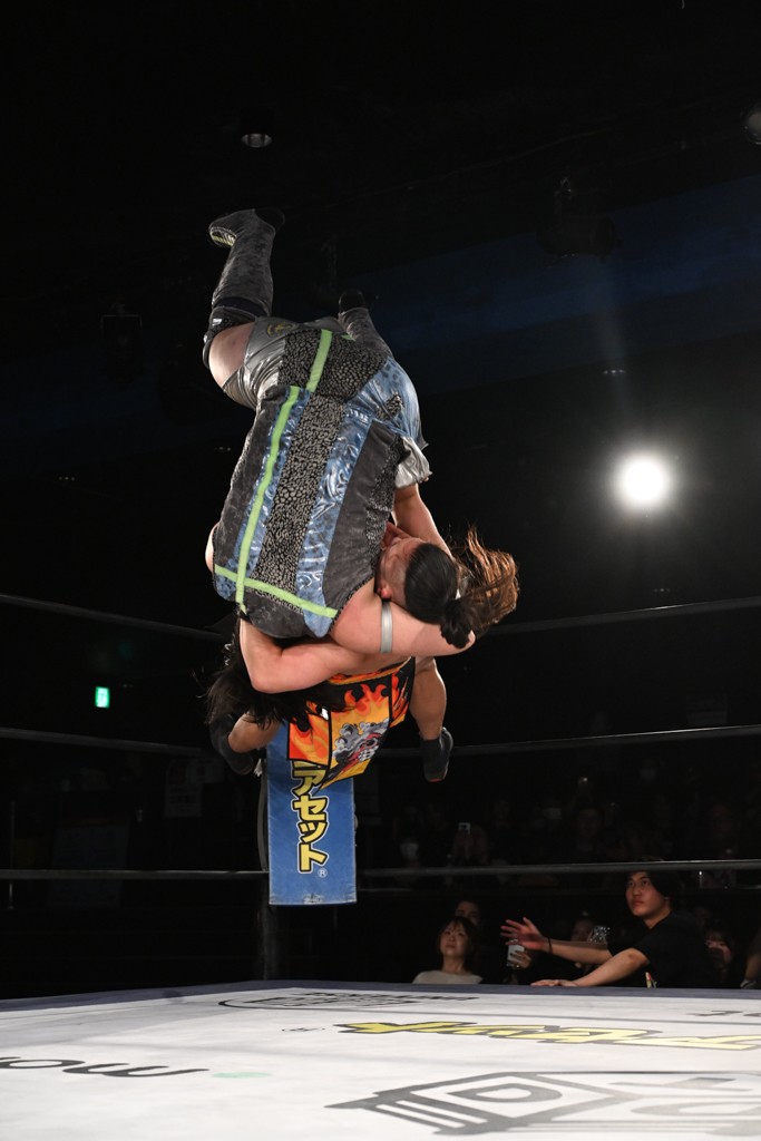 レギュラー参戦2戦目の宮脇が三角飛びプランチャを秋山に見舞うと場外戦へ。ステージ席のフロアで乱闘になると、秋山が宮脇をボディスラム。正田が中村に張り手を見舞えば、中村はドロップキックで反撃。正田がMAOにミドルキック連打。S.L.C.が納谷に連係攻撃も、納谷が2人まとめてクロスボディで吹っ飛ばした。The ApexはMAO、KANONに同時に串刺し式ボディアタック。飯野がKANONにThe Apexエルボーを狙うも失敗。KANONが飯野にミサイルキック、MAOが納谷にスリングブレイド。飯野が早口でのThe ApexエルボーがKANONにヒット。飯野とKANONがチョップのラリーに。飯野とKANONがラリアット相打ちから、飯野がスピアもKANONがキャッチ。納谷がMAOにバックドロップ、飯野がダウンしているKANONにスピア。最後は飯野がもう一発スピアを叩き込んでKANONから直接勝利を挙げた。