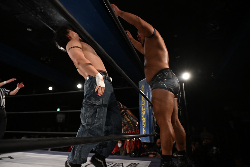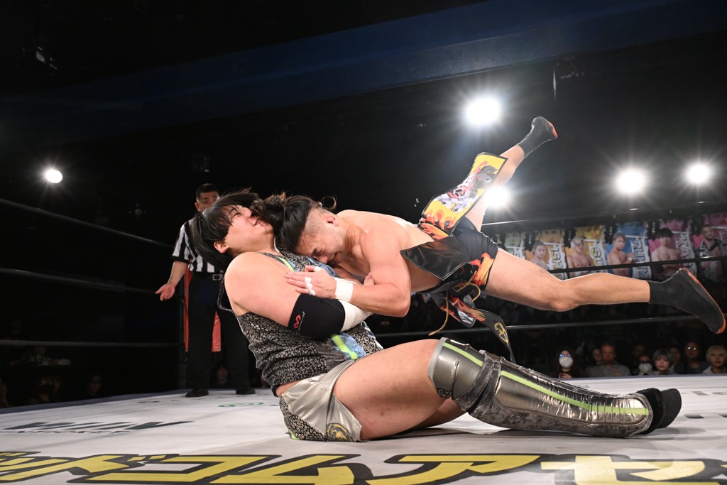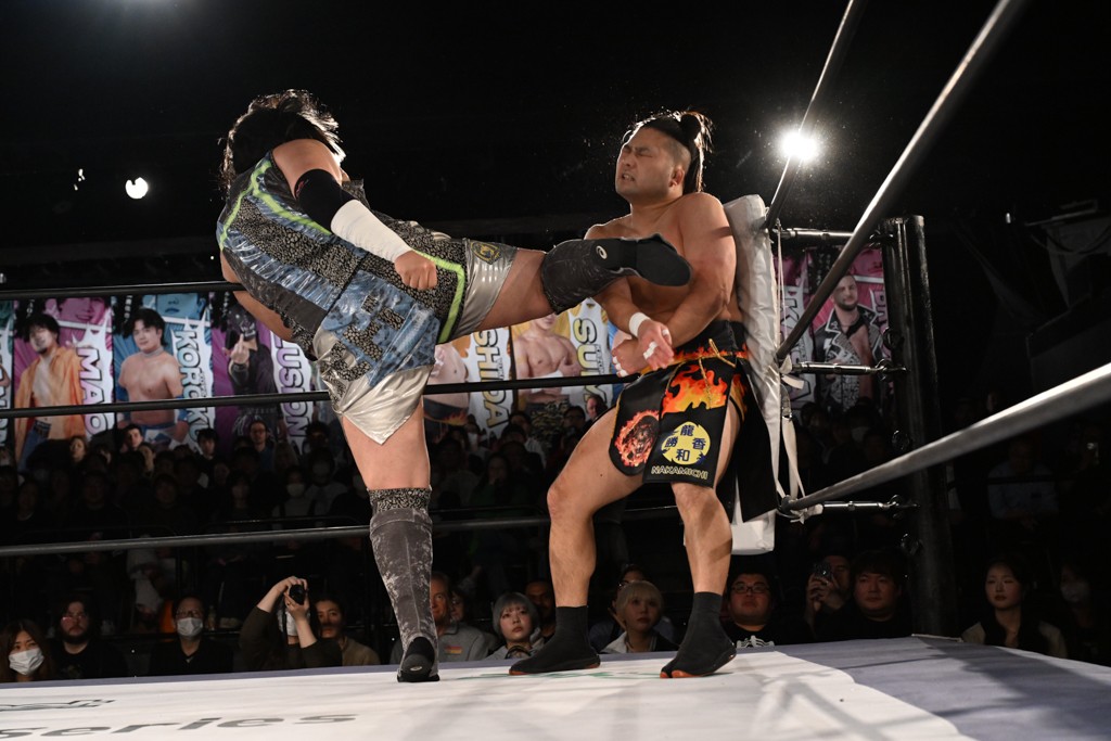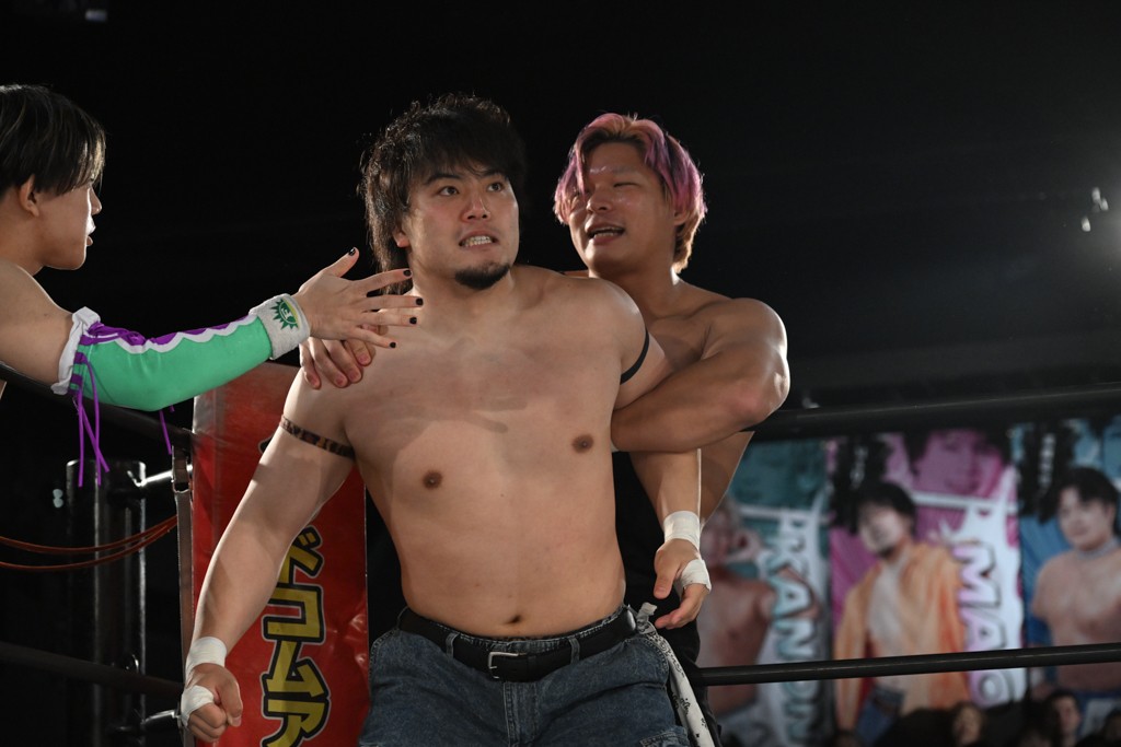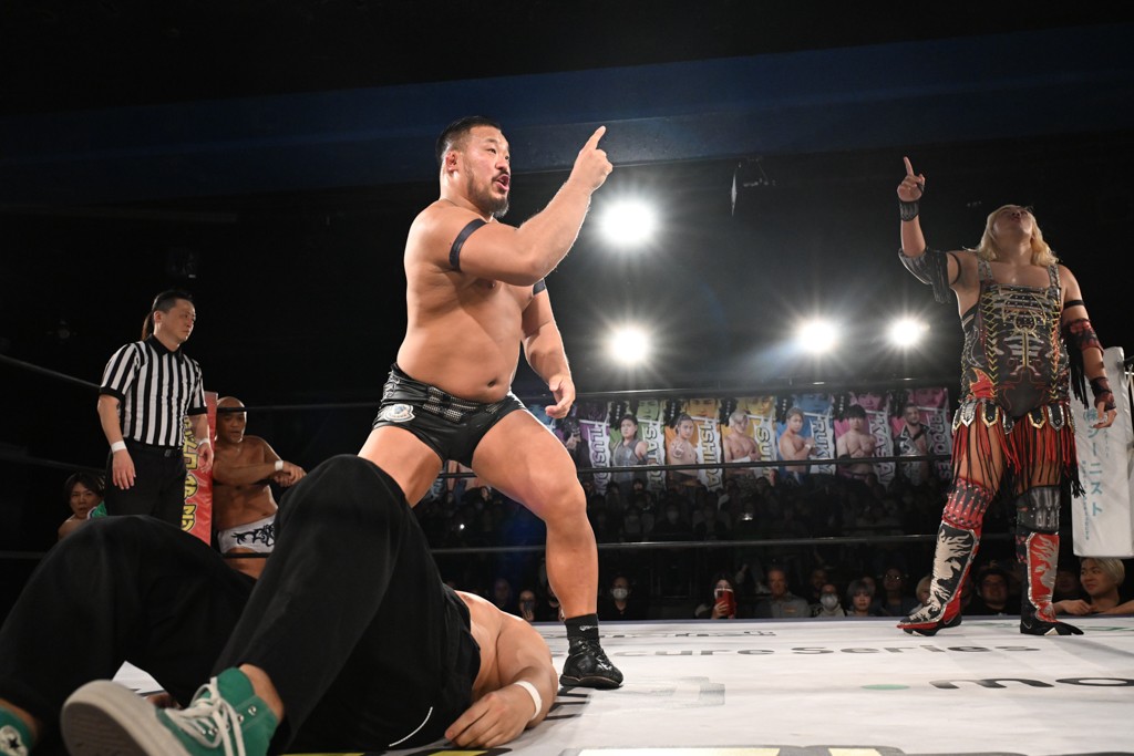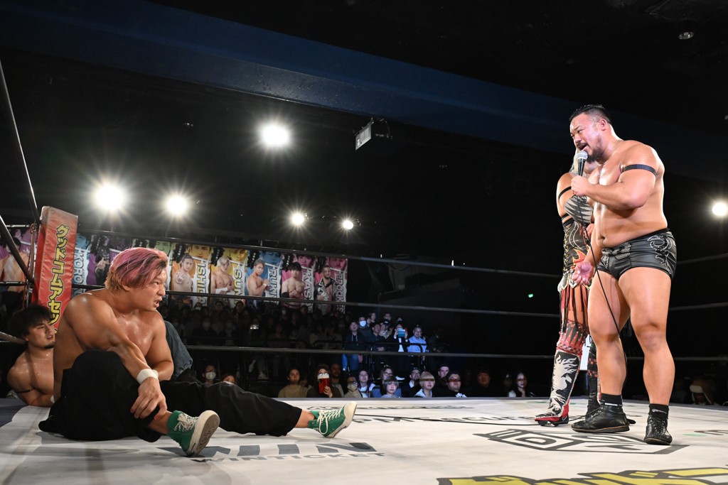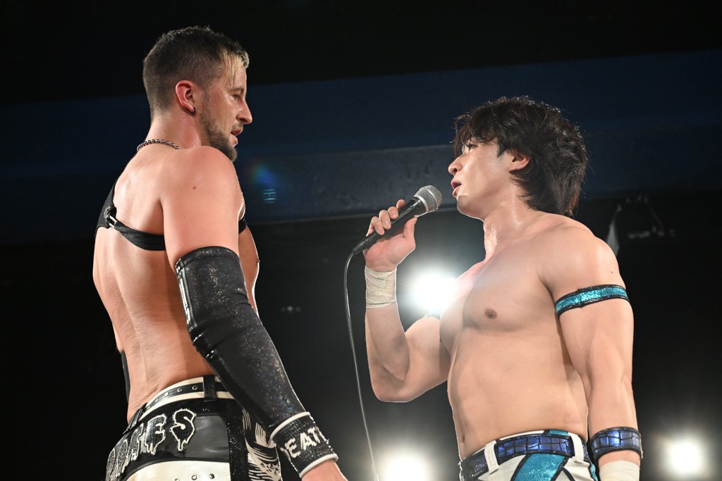 飯野は「MAO、おまえ以外にも見つけたぞ。KANON! いいチョップ、いいラリアット。そして俺のスピアを止めやがったな。おまえのことも今日で目に焼き付けたぞ。MAO、KANON。KANON、MAO。おまえら2人ともぶっ潰してやる。俺がてめえらの腰からベルト剥ぎ取ってやる!」と気炎。