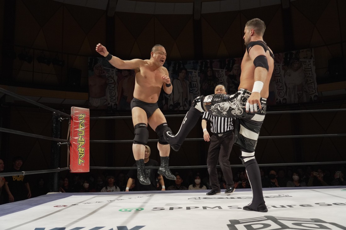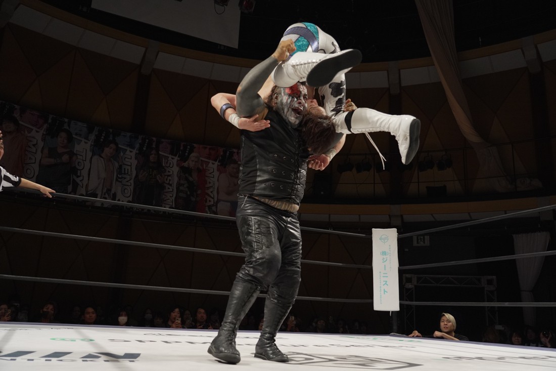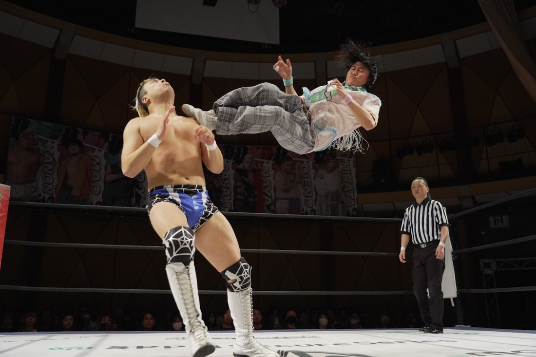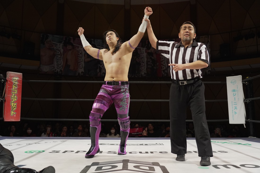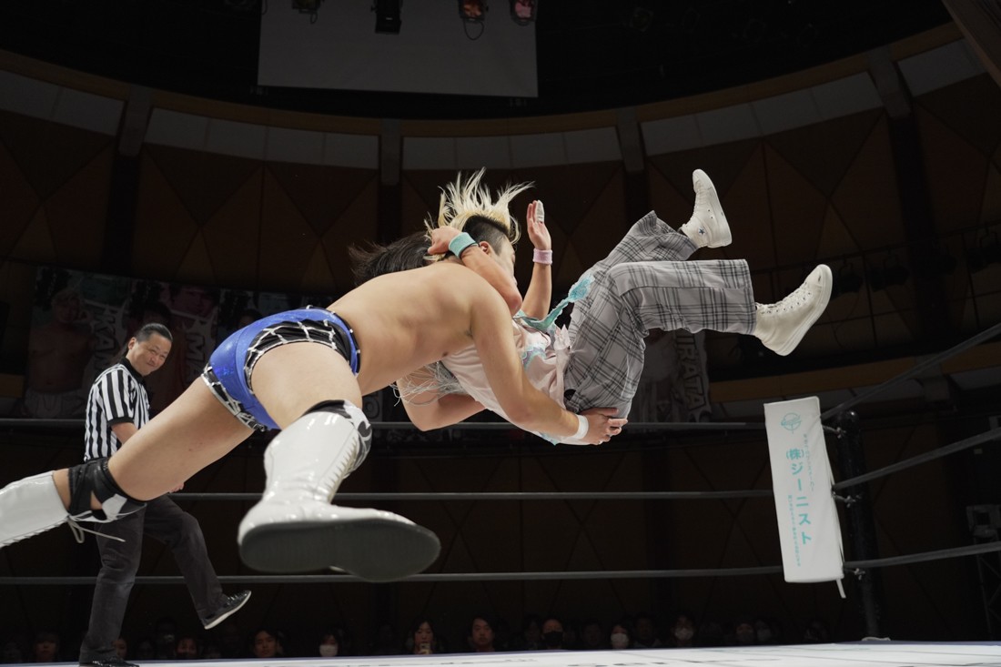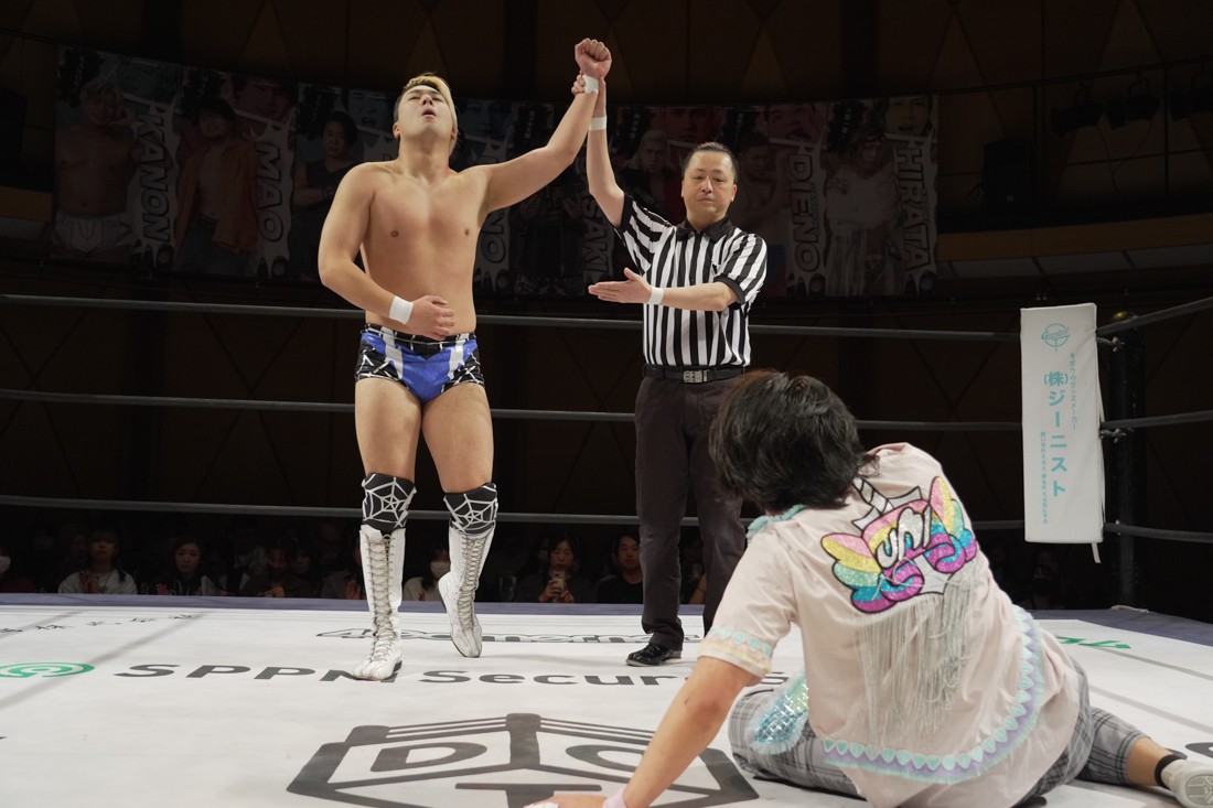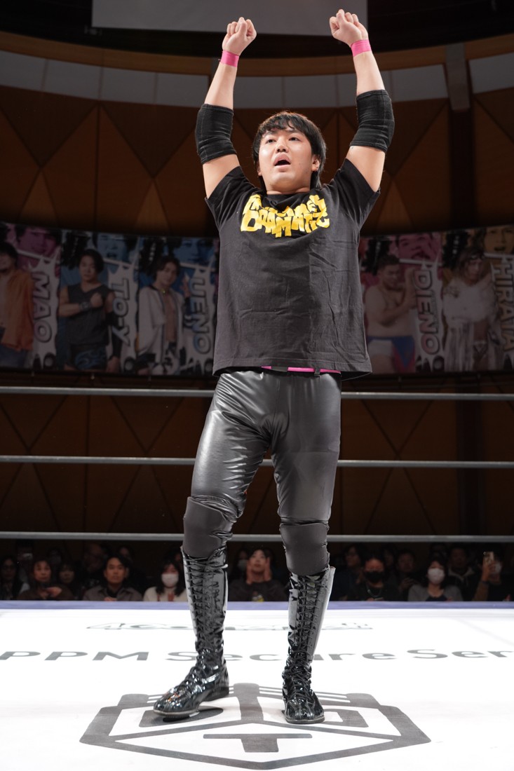これが公式戦初戦となる正田壮史は、1敗0点の葛西陽向と対戦。奇しくもSCHADENFREUDE Internationalから脱退した正田と、その後クリスが結成したFANTÔMES DRAMATICのメンバーとなった葛西の対戦となったが、正田は敢えて“先輩風”を吹かしながら葛西を挑発。葛西もグーパンチやブルドッキング・ヘッドロック、ミサイルキックで食らいつくが、正田は強烈なジャーマンで投げると、マンブリをぶち込んで勝利。公式戦白星スタートを切った。