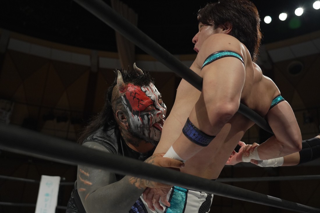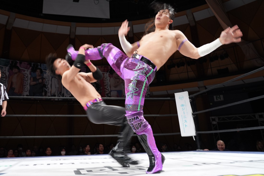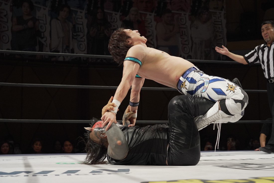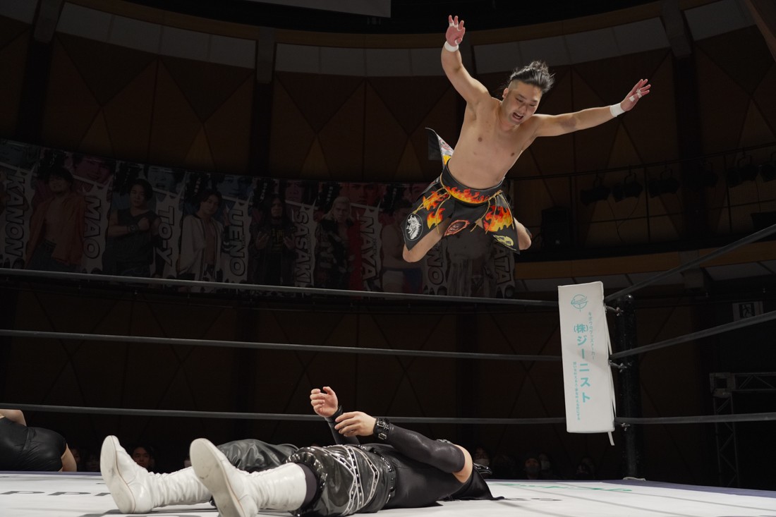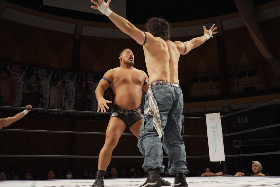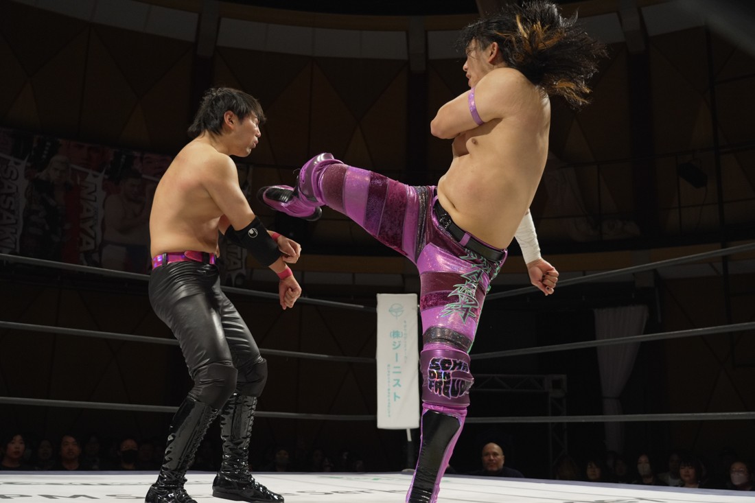これが公式戦初戦となる正田壮史は、1敗0点の葛西陽向と対戦。奇しくもSCHADENFREUDE Internationalから脱退した正田と、その後クリスが結成したFANTÔMES DRAMATICのメンバーとなった葛西の対戦となったが、正田は敢えて“先輩風”を吹かしながら葛西を挑発。葛西もグーパンチやブルドッキング・ヘッドロック、ミサイルキックで食らいつくが、正田は強烈なジャーマンで投げると、マンブリをぶち込んで勝利。公式戦白星スタートを切った。