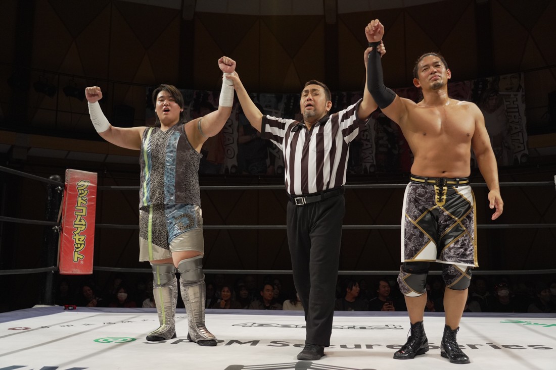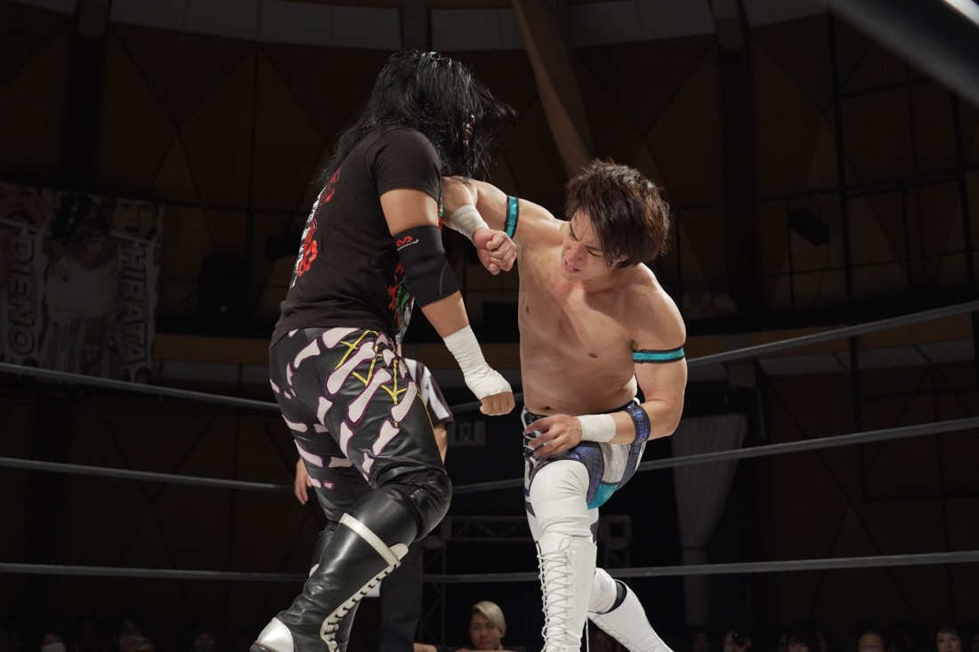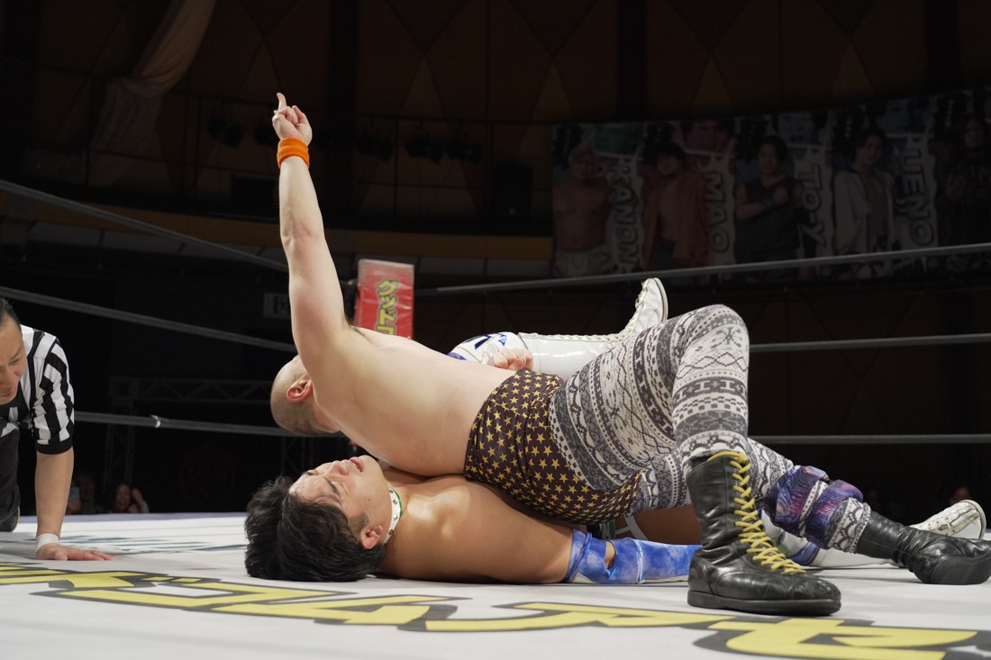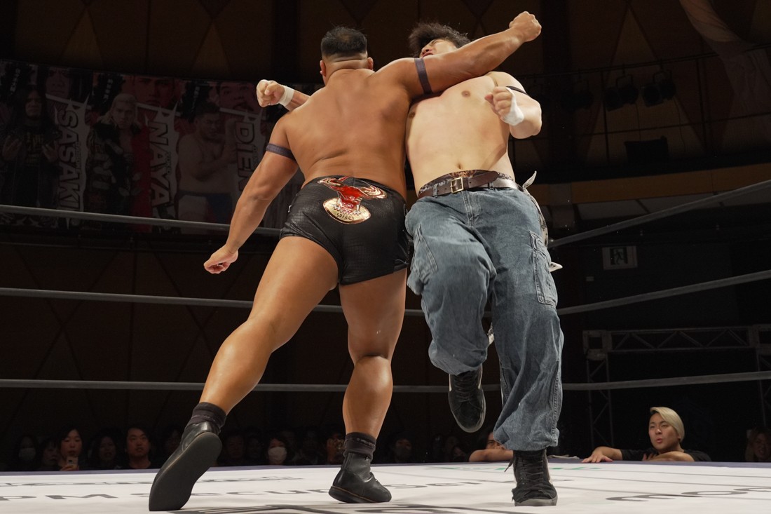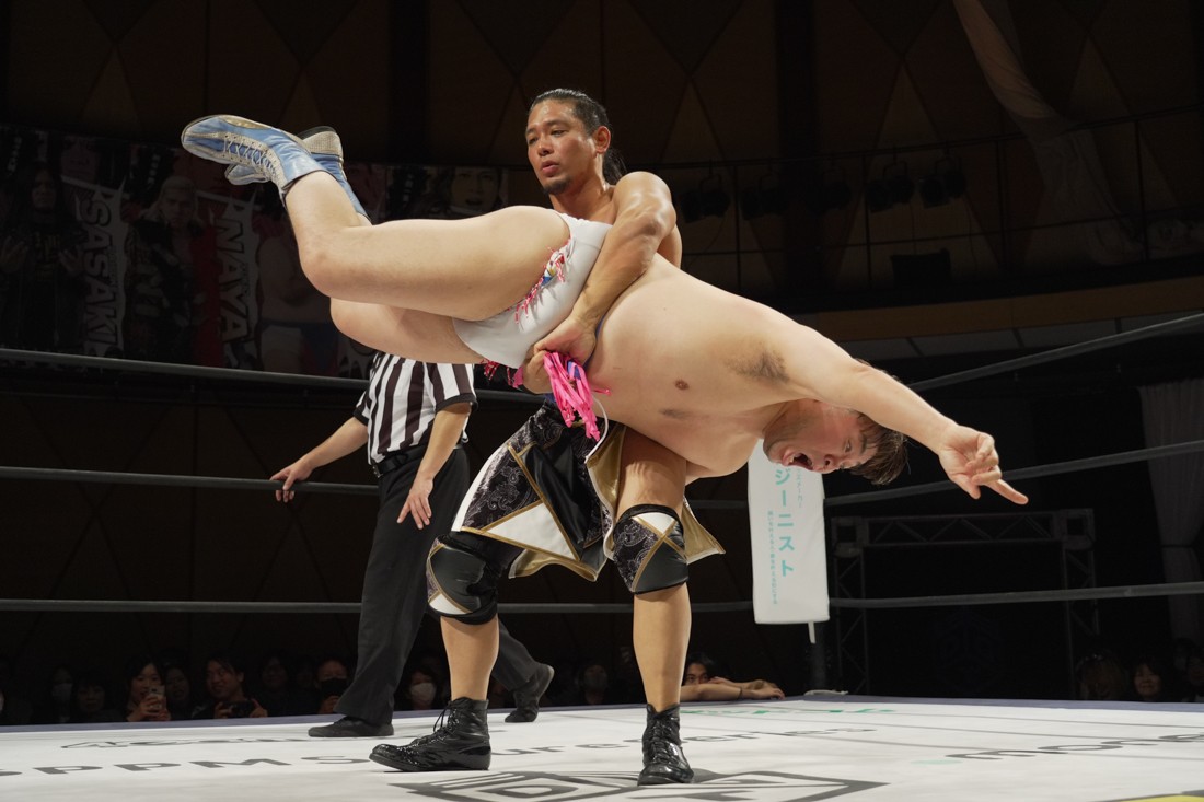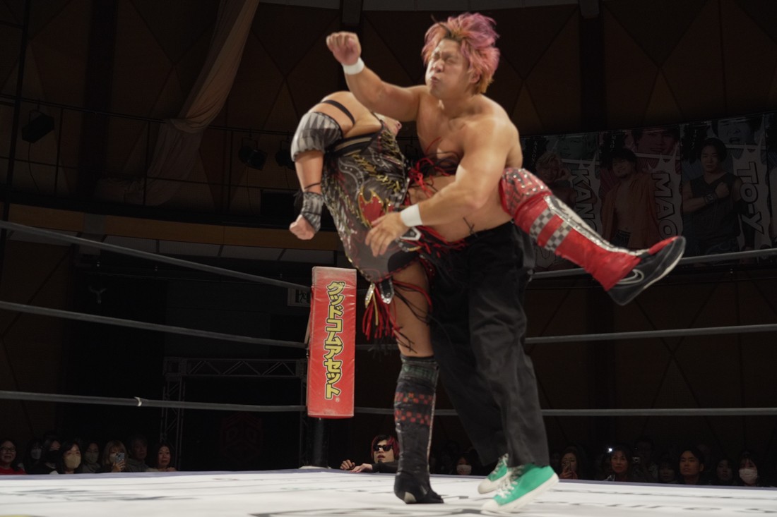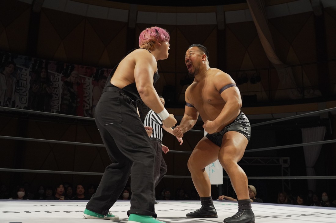 これが公式戦初戦となる正田壮史は、1敗0点の葛西陽向と対戦。奇しくもSCHADENFREUDE Internationalから脱退した正田と、その後クリスが結成したFANTÔMES DRAMATICのメンバーとなった葛西の対戦となったが、正田は敢えて“先輩風”を吹かしながら葛西を挑発。葛西もグーパンチやブルドッキング・ヘッドロック、ミサイルキックで食らいつくが、正田は強烈なジャーマンで投げると、マンブリをぶち込んで勝利。公式戦白星スタートを切った。