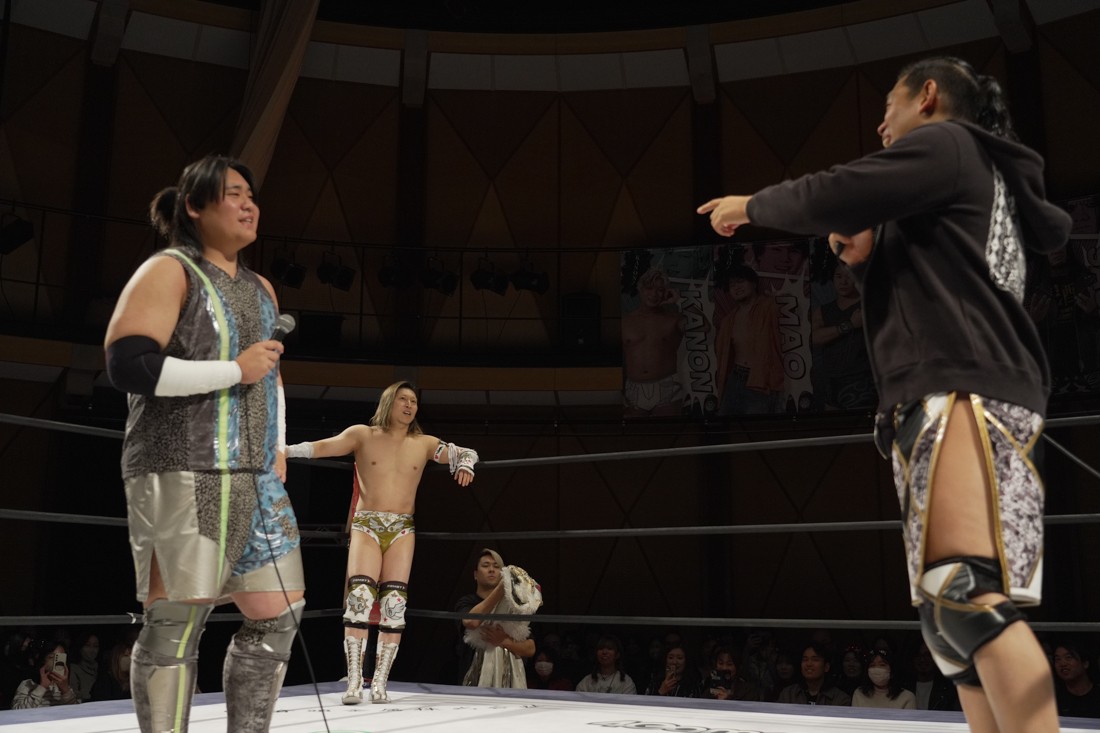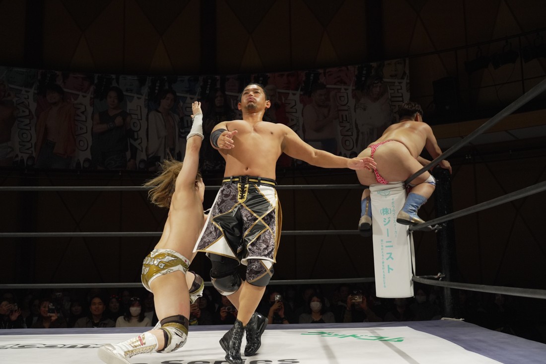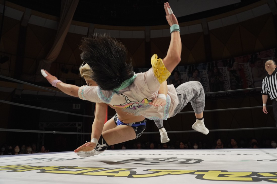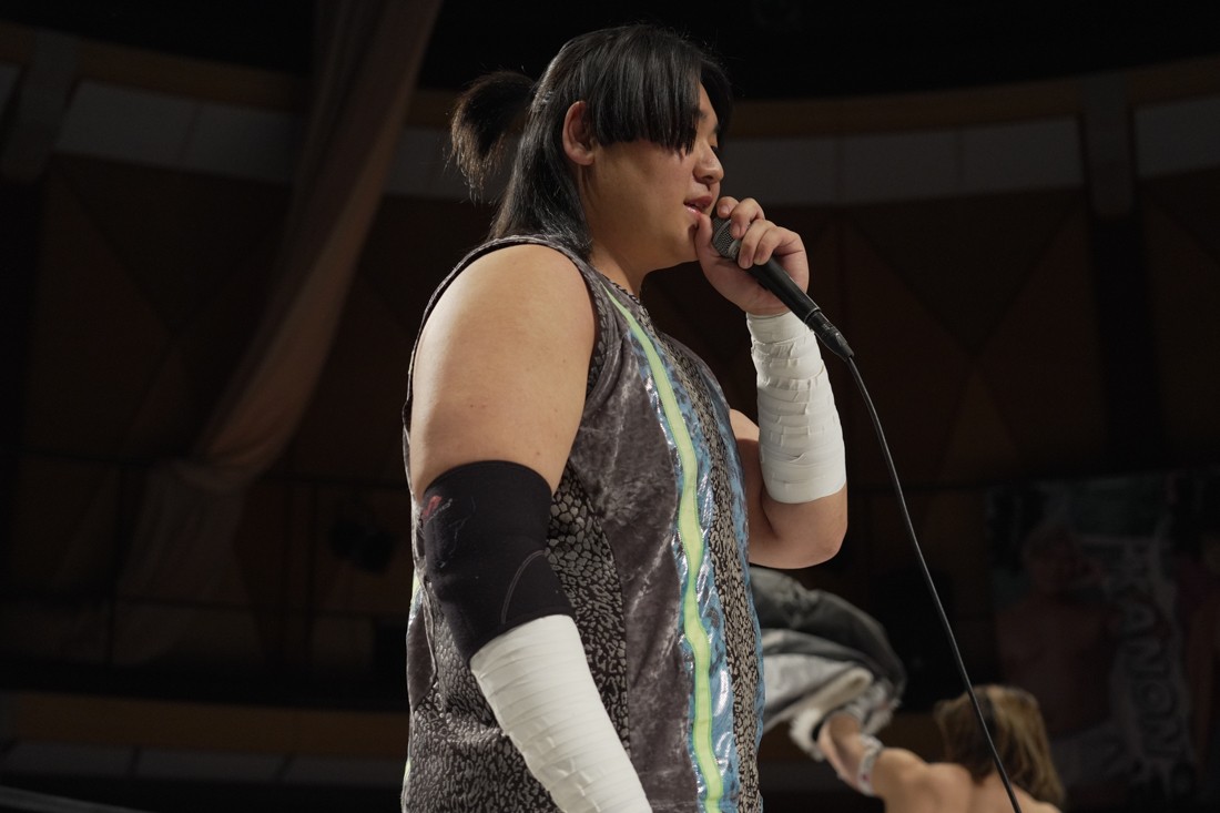 宮脇は須見とスピーディーな攻防を展開。一方、S.L.C.とThe Apexは真正面からの肉弾戦。混戦の中、MAOと宮脇を飯野と須見が場外に追いやった間に、納谷がKANONにニーリフトを叩き込む。だが、次の瞬間、KANONがヘッドロックからそのまま丸め込んで3カウント。納谷が勝ったと勘違いした飯野は納得いかない様子だったが、コメントスペースで須見が「負けてました」とバッサリ。S.L.C.とはなかなかいいバイブスを感じさせた宮脇は「須見選手ともっともっとやり合いたいですね」と、MAOが育てた須見に興味津々のようだ。
