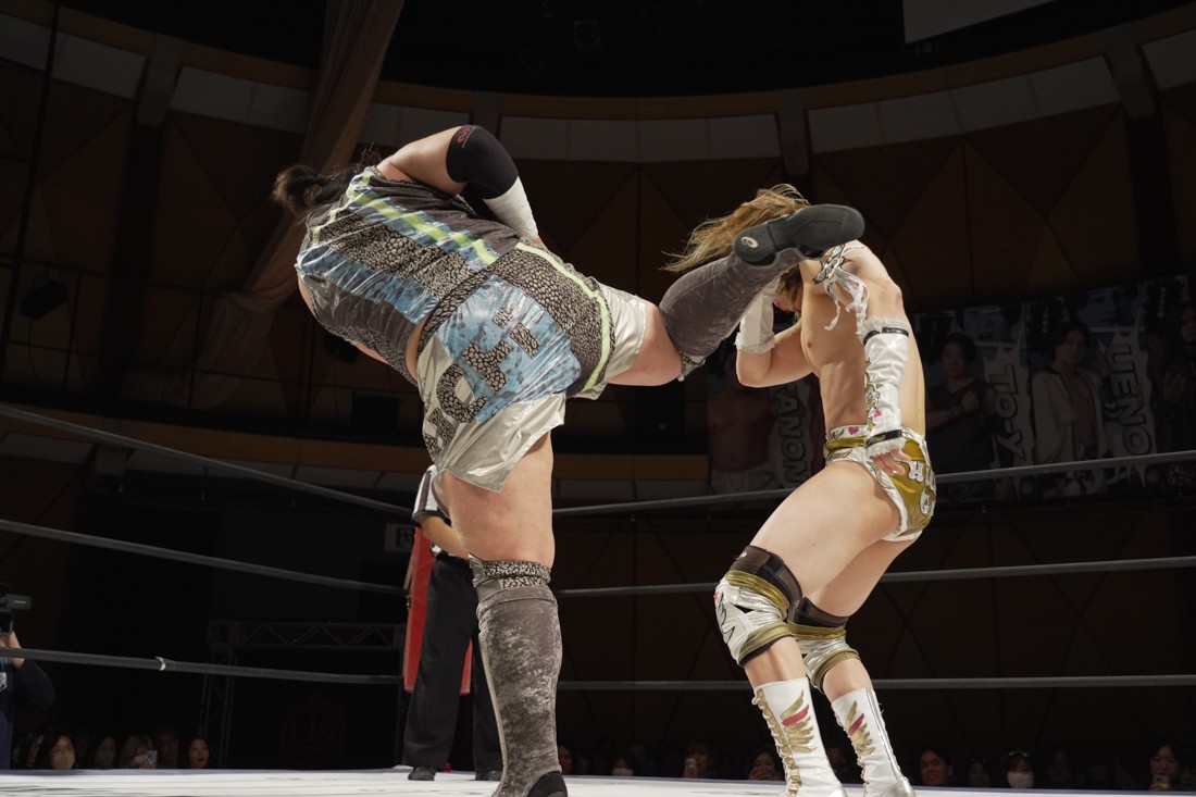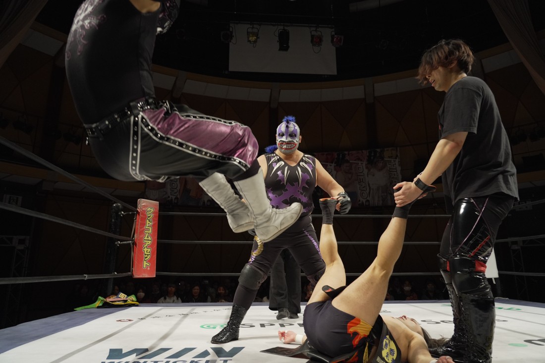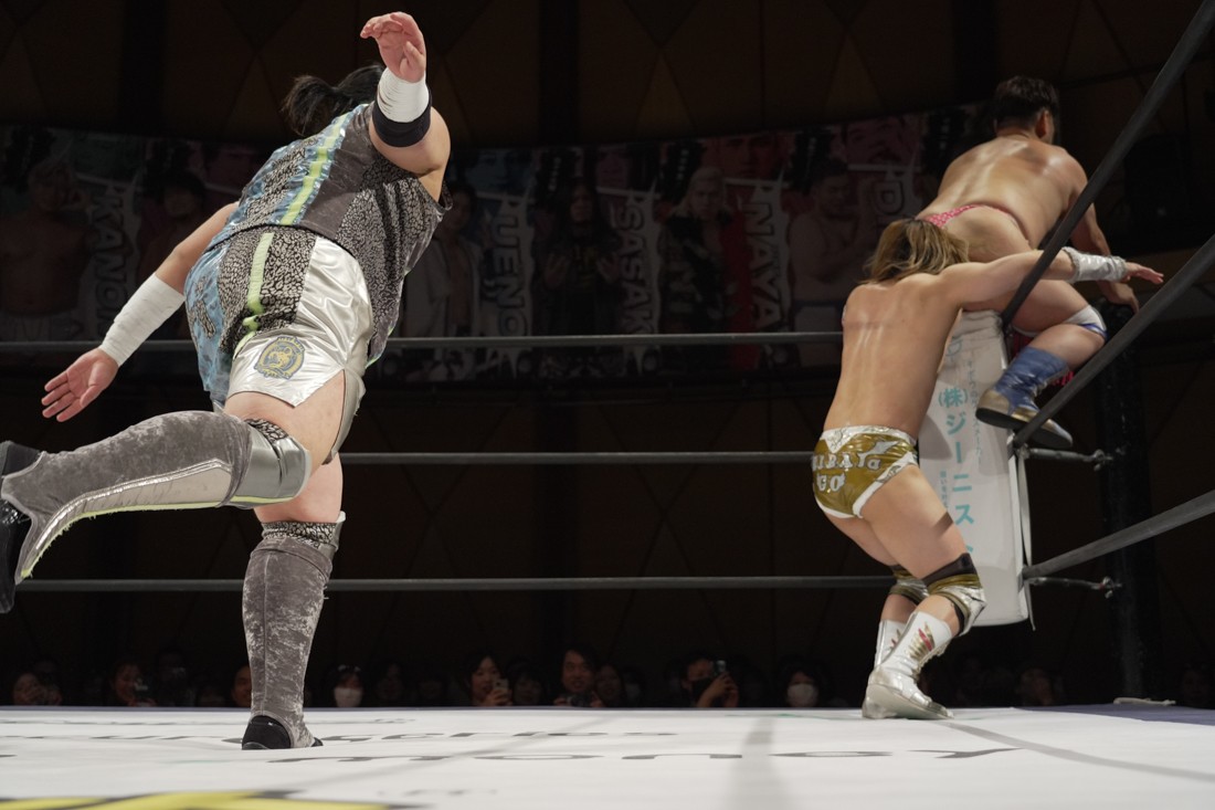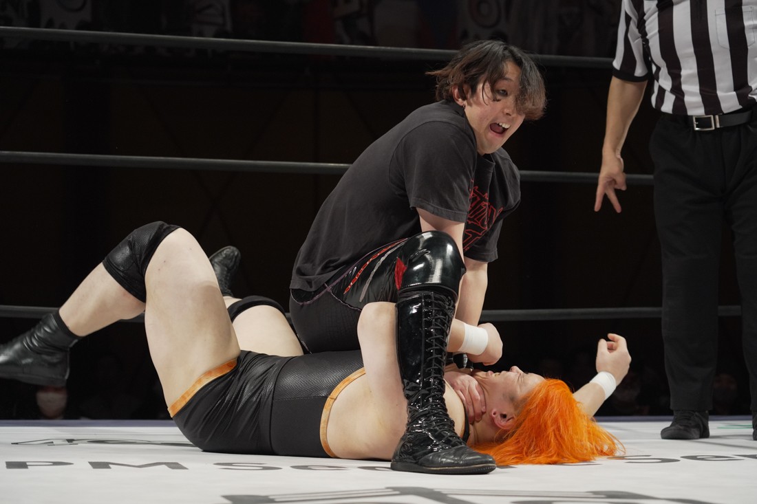 宮脇は須見とスピーディーな攻防を展開。一方、S.L.C.とThe Apexは真正面からの肉弾戦。混戦の中、MAOと宮脇を飯野と須見が場外に追いやった間に、納谷がKANONにニーリフトを叩き込む。だが、次の瞬間、KANONがヘッドロックからそのまま丸め込んで3カウント。納谷が勝ったと勘違いした飯野は納得いかない様子だったが、コメントスペースで須見が「負けてました」とバッサリ。S.L.C.とはなかなかいいバイブスを感じさせた宮脇は「須見選手ともっともっとやり合いたいですね」と、MAOが育てた須見に興味津々のようだ。
