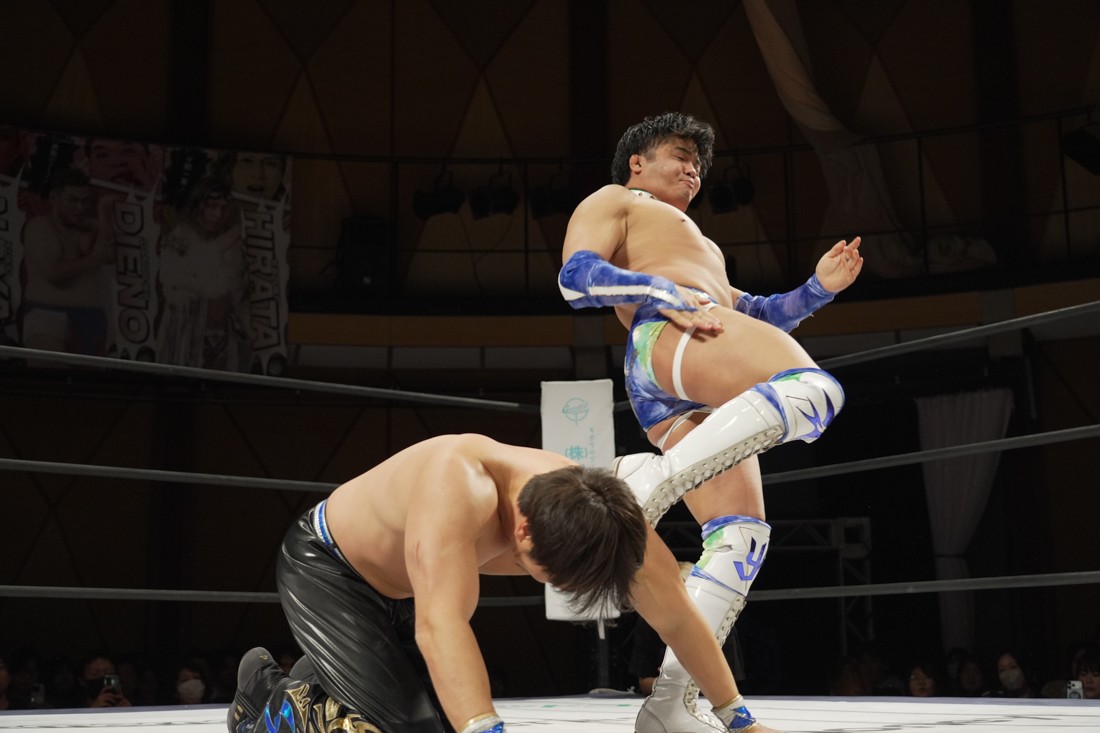 大阪出身ながら久しぶりに大阪大会参戦となった瑠希也。公式戦は1敗0点のため、1勝2点の夢虹には是が非でも勝ちたいところ。夢虹からの握手を拒否した瑠希也だが、夢虹はその場跳びムーンサルト・プレスや前転からのスタナーなど立体的な攻撃に大苦戦。どうにかエルボーや逆エビ固めで応戦した瑠希也は、夢虹が勝負をかけたフェニックス・スプラッシュをかわす。間一髪で着地した夢虹だったが、瑠希也はプロトボムで叩き付けると、さらに旋回式のプロトボムを決めて勝利。地元で勝利した瑠希也は1勝1敗2点で夢虹と並んだ。