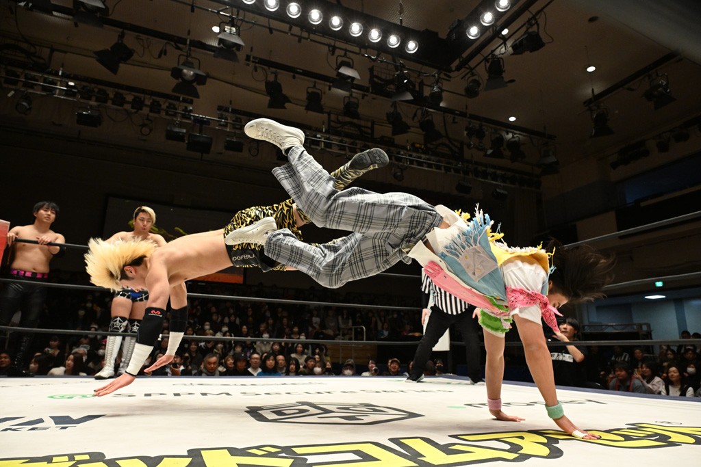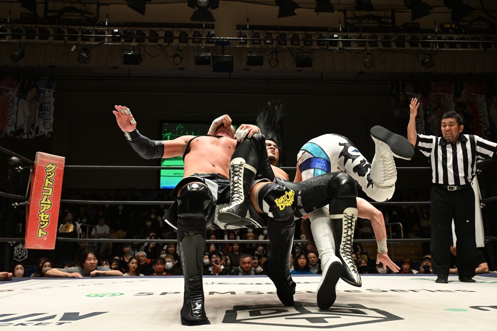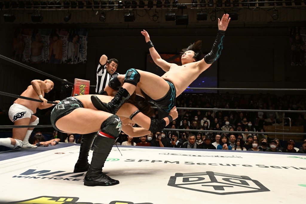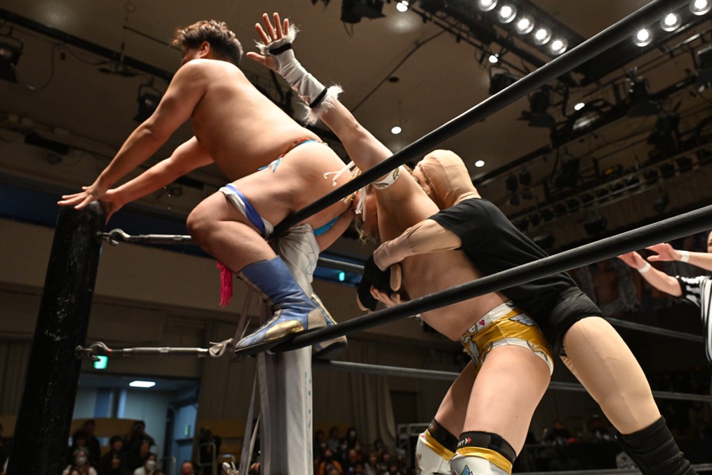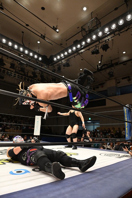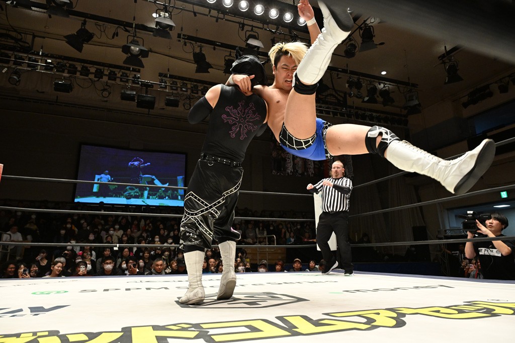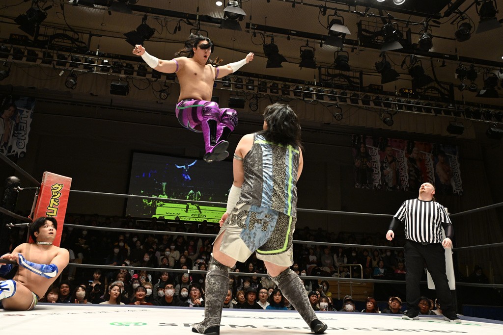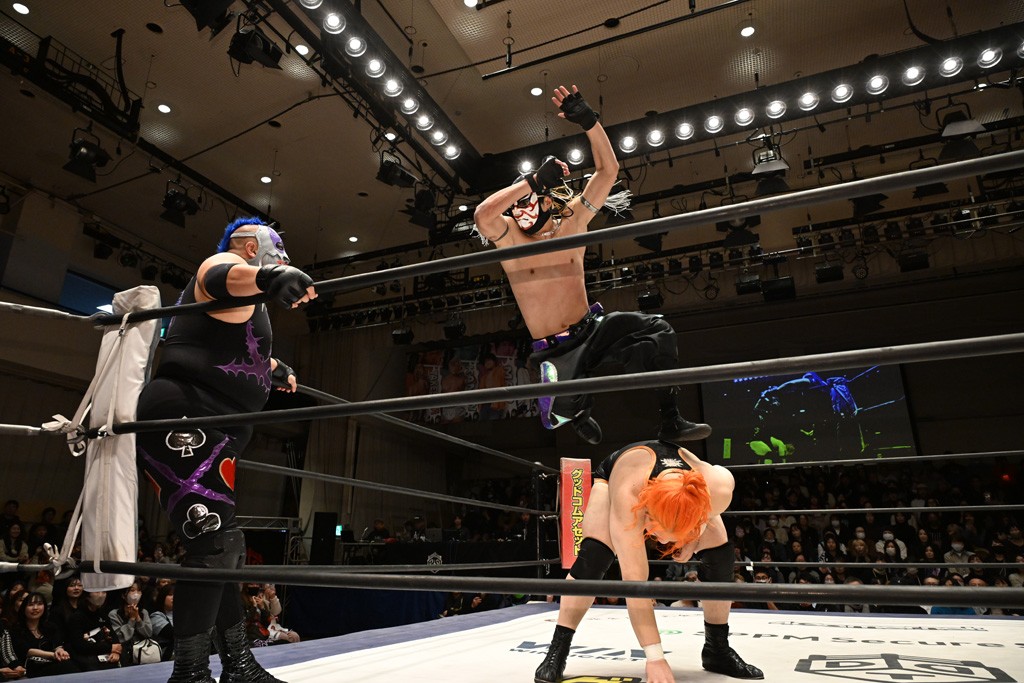 まずは先発したKANONと飯野がショルダータックル合戦、KANONと納谷がエルボー合戦で火花を散らせた。MAOが場外の2人めがけてラ・ケブラーダを発射。飯野がKANONに雪崩式バックフリップ、納谷がダイビング・エルボードロップ、飯野が低空スピアもカット。KANONが飯野をコブラツイストで締め上げれば、MAOが掌底を叩き込んだ。飯野がスピアもKANONが止めてかわした。KANONと飯野がラリアット相打ち。MAOがみちのくドライバーⅡで納谷を排除。飯野が助走なしのスピアを見舞えば、KANONはラリアット。最後はKANONがGURU-GURUドライバーで飯野を仕留めた。