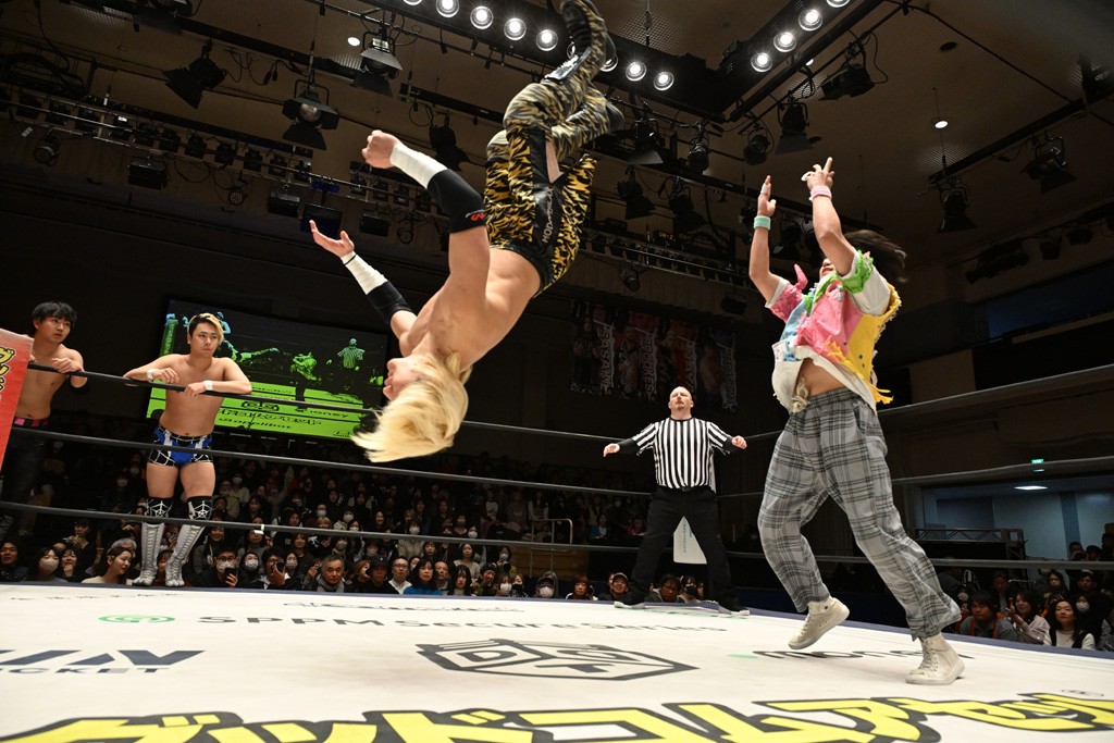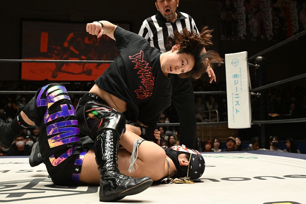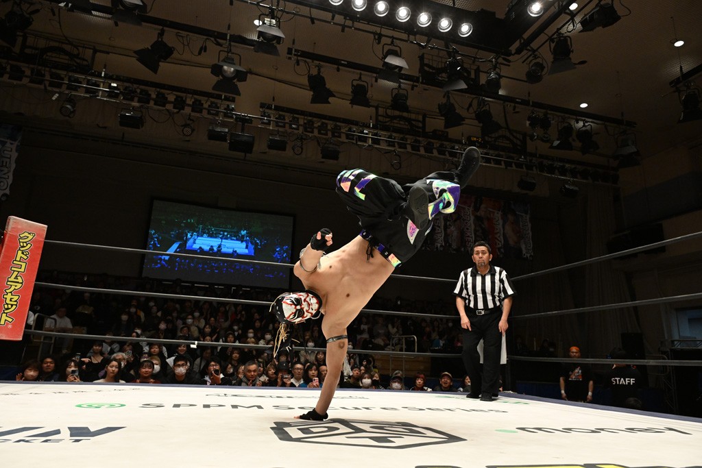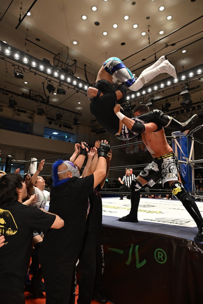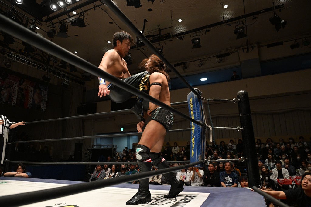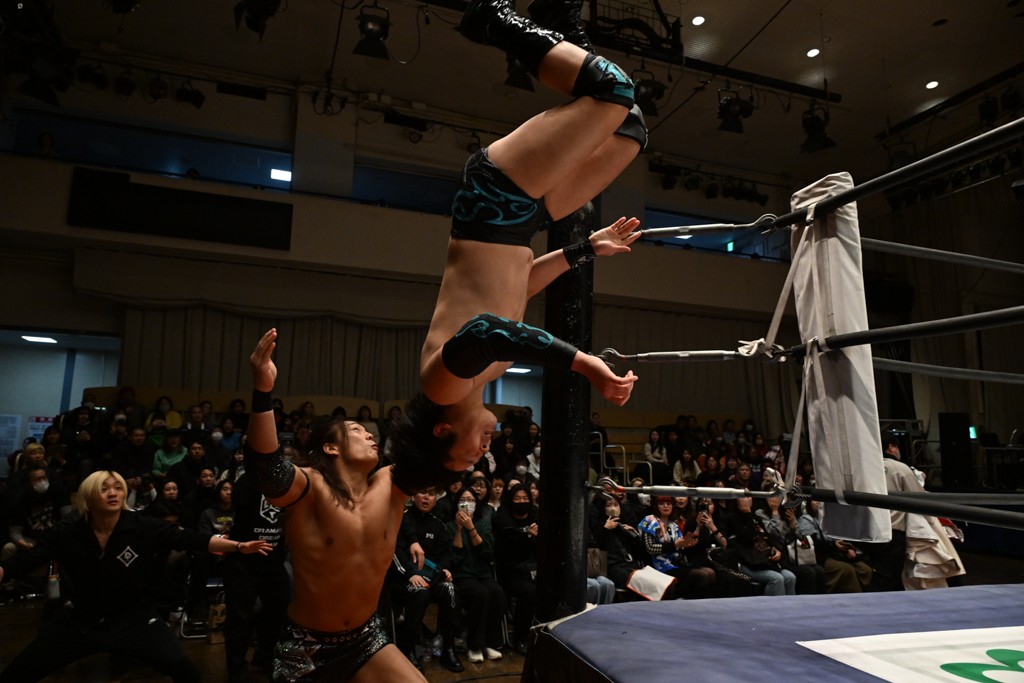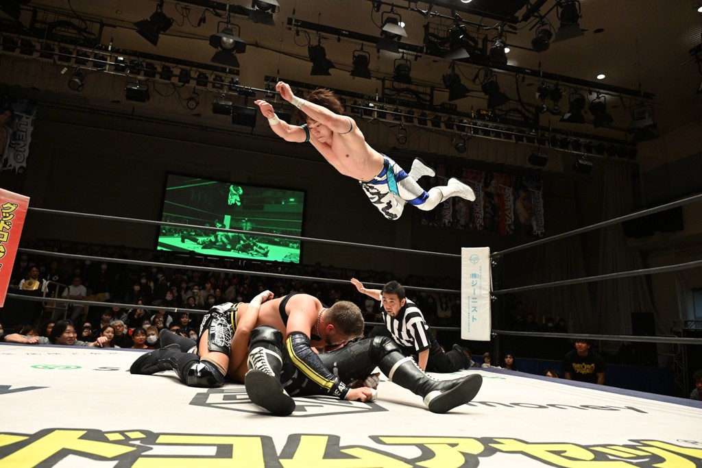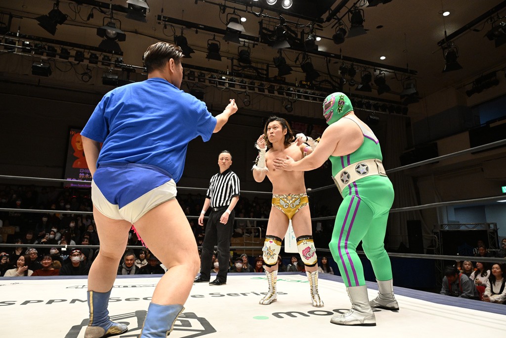 まずは先発したKANONと飯野がショルダータックル合戦、KANONと納谷がエルボー合戦で火花を散らせた。MAOが場外の2人めがけてラ・ケブラーダを発射。飯野がKANONに雪崩式バックフリップ、納谷がダイビング・エルボードロップ、飯野が低空スピアもカット。KANONが飯野をコブラツイストで締め上げれば、MAOが掌底を叩き込んだ。飯野がスピアもKANONが止めてかわした。KANONと飯野がラリアット相打ち。MAOがみちのくドライバーⅡで納谷を排除。飯野が助走なしのスピアを見舞えば、KANONはラリアット。最後はKANONがGURU-GURUドライバーで飯野を仕留めた。