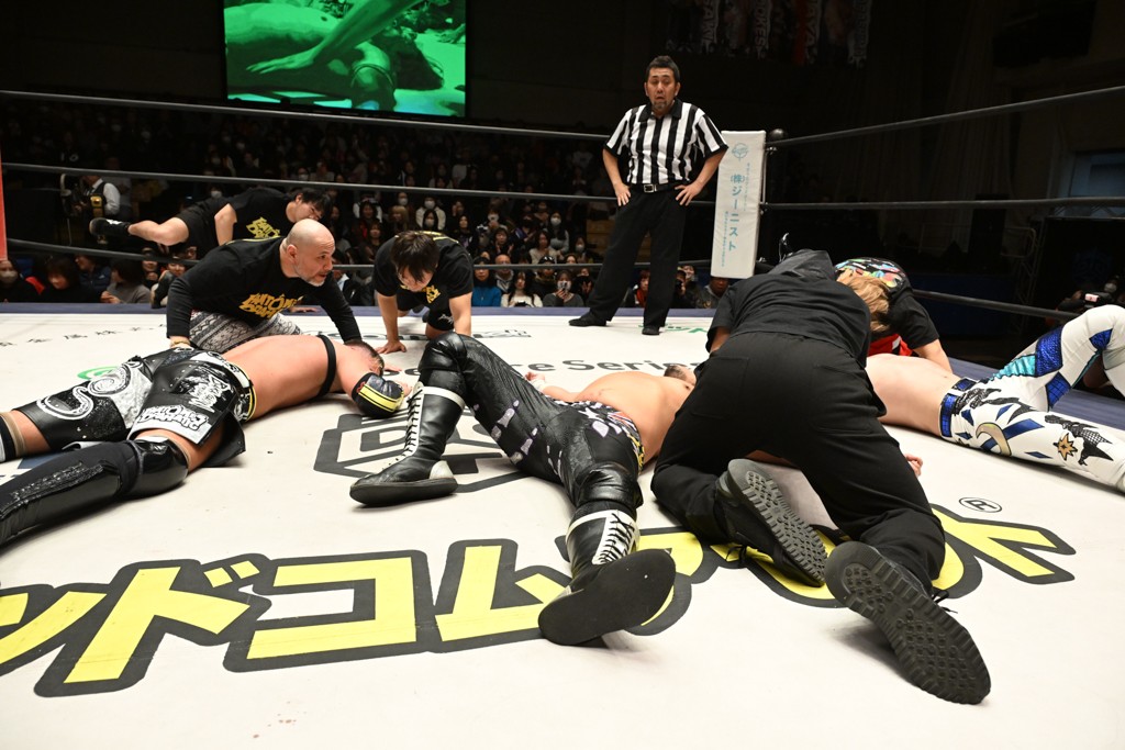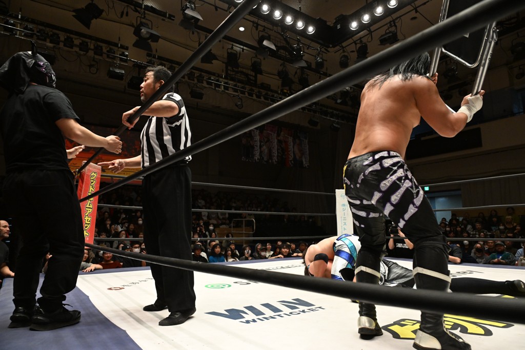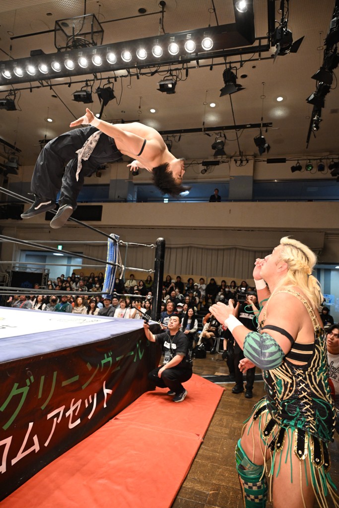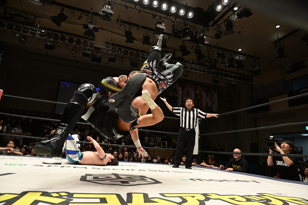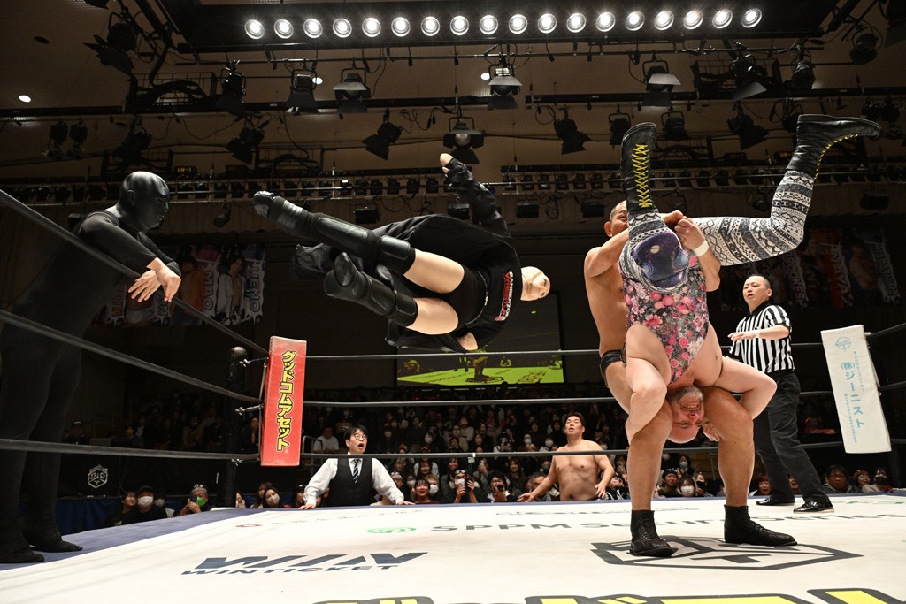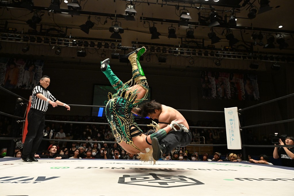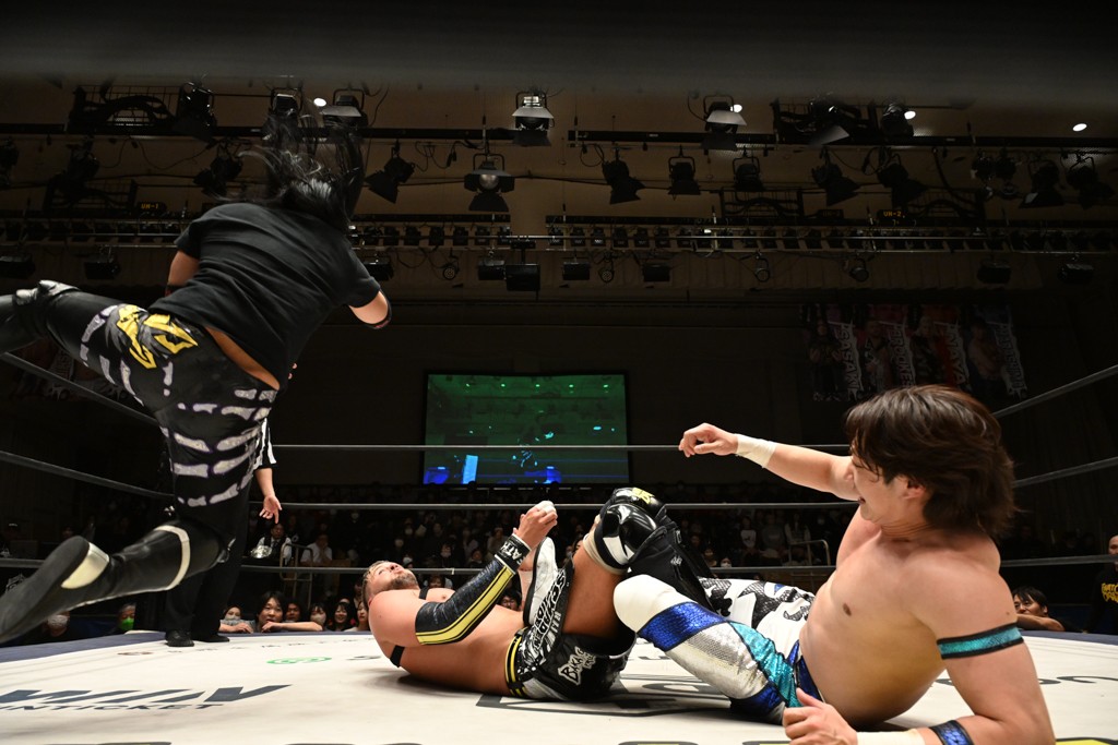 まずは先発したKANONと飯野がショルダータックル合戦、KANONと納谷がエルボー合戦で火花を散らせた。MAOが場外の2人めがけてラ・ケブラーダを発射。飯野がKANONに雪崩式バックフリップ、納谷がダイビング・エルボードロップ、飯野が低空スピアもカット。KANONが飯野をコブラツイストで締め上げれば、MAOが掌底を叩き込んだ。飯野がスピアもKANONが止めてかわした。KANONと飯野がラリアット相打ち。MAOがみちのくドライバーⅡで納谷を排除。飯野が助走なしのスピアを見舞えば、KANONはラリアット。最後はKANONがGURU-GURUドライバーで飯野を仕留めた。