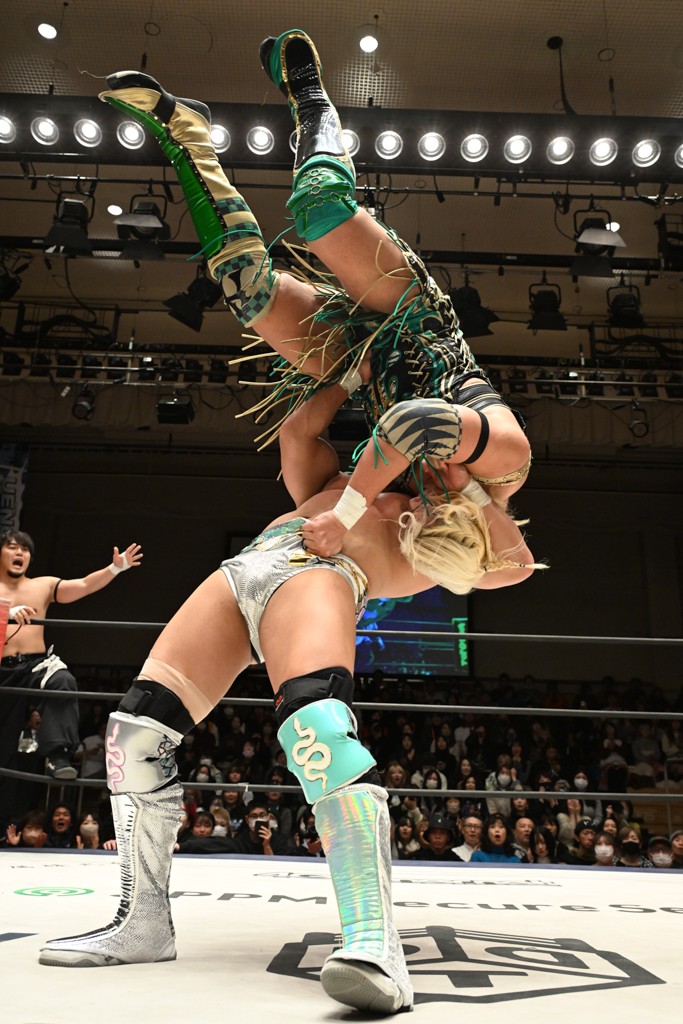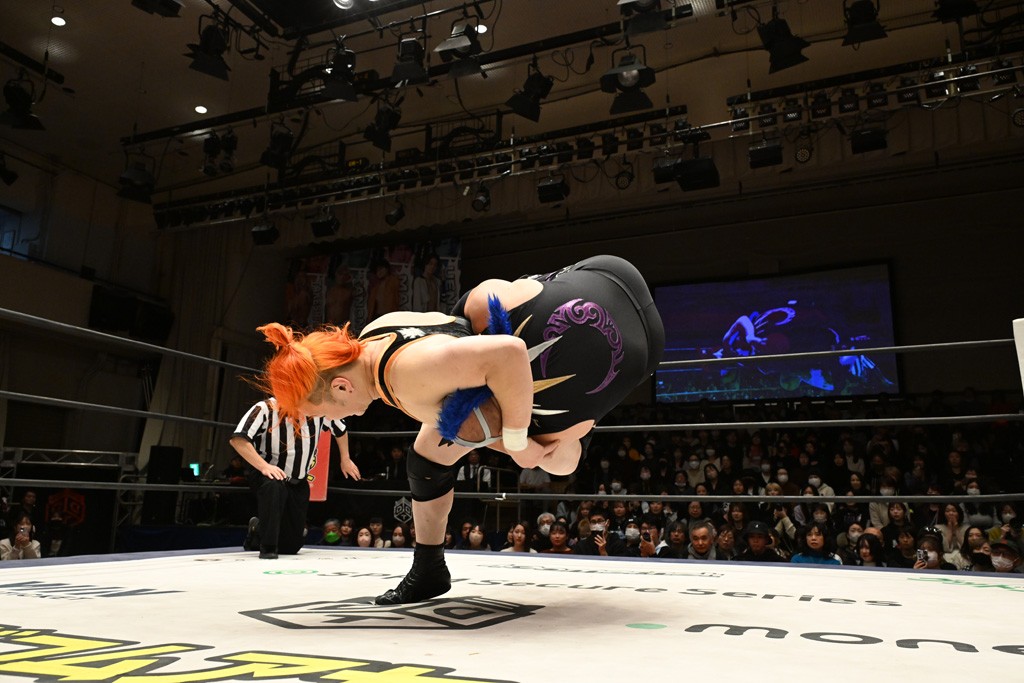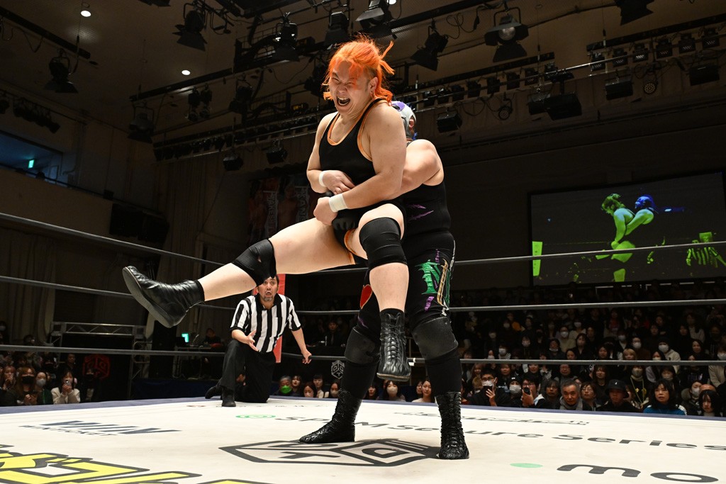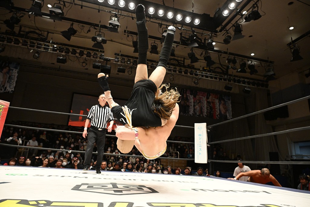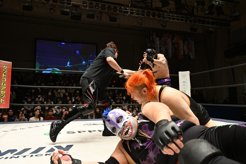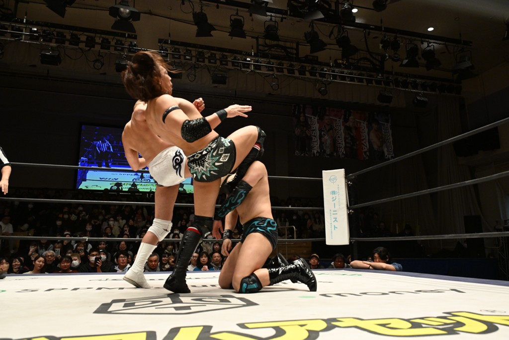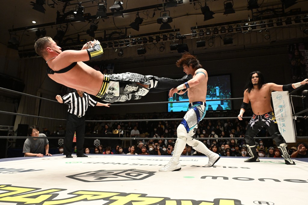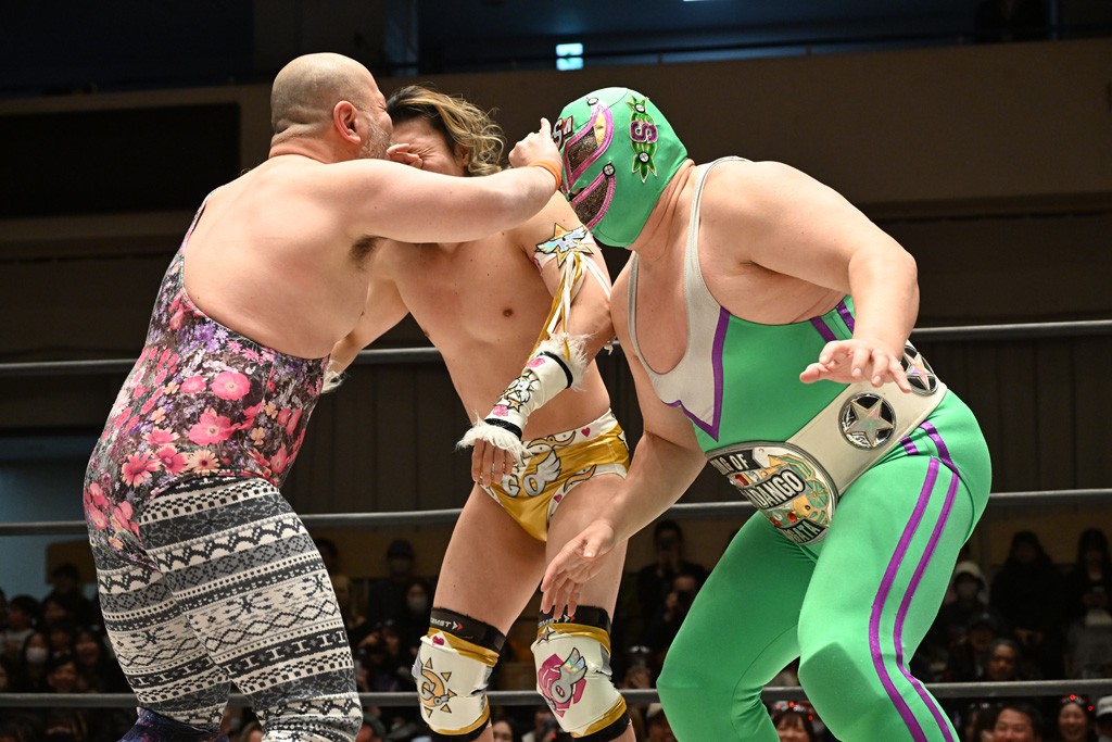 まずは先発したKANONと飯野がショルダータックル合戦、KANONと納谷がエルボー合戦で火花を散らせた。MAOが場外の2人めがけてラ・ケブラーダを発射。飯野がKANONに雪崩式バックフリップ、納谷がダイビング・エルボードロップ、飯野が低空スピアもカット。KANONが飯野をコブラツイストで締め上げれば、MAOが掌底を叩き込んだ。飯野がスピアもKANONが止めてかわした。KANONと飯野がラリアット相打ち。MAOがみちのくドライバーⅡで納谷を排除。飯野が助走なしのスピアを見舞えば、KANONはラリアット。最後はKANONがGURU-GURUドライバーで飯野を仕留めた。