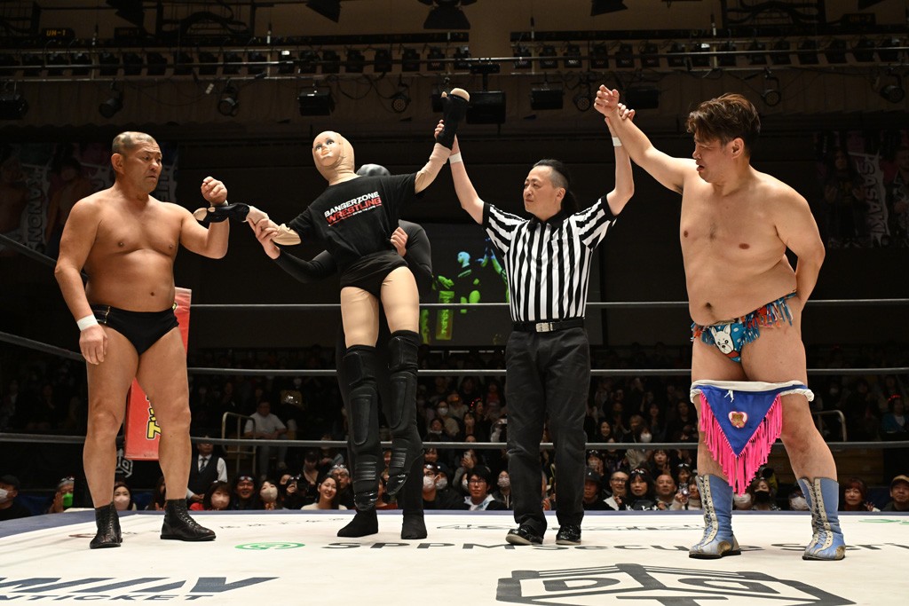 To-yはHARASHIMAと組み、超大物2人と対戦。ドロップキックでTAKESHITAに奇襲を掛けるとトペコン・ヒーロを発射。リングに戻るとチョップ連打を叩き込んだ。だが、場外でTAKESHITAに観客席のイスにブレーンバスターで投げられた。秋山がTo-yにパイルドライバー、TAKESHITAは変形デスロックで足を締め上げた。HARASHIMAは秋山にスワンダイブ式クロスボディ、ファルコンアローを繰り出した。TAKESHITAがTo-yにブルーサンダーボムもカウントは2。To-yはTAKESHITAにフランケンシュタイナーも2カウント。TAKESHITAがTo-yに延髄ラリアットを見舞うと、To-yは張り手をぶちかました。HARASHIMAがTAKESHITAにリバース・フランケンシュタイナー、串刺し式蒼魔刀。To-yはコジマインパクトもフォールはならず。ならばとTo-yはコジマワンダーランドを狙うも、切り返したTAKESHITAはラストライド。TAKESHITAと秋山がTo-yにダブルのニーリフトをぶち込むもカット。TAKESHITAは強烈なエルボーを叩き込むも、To-yは死力を振り絞ってカウント2で返した。最後はTAKESHITAが渾身のワガママを繰り出して3カウントを奪った。