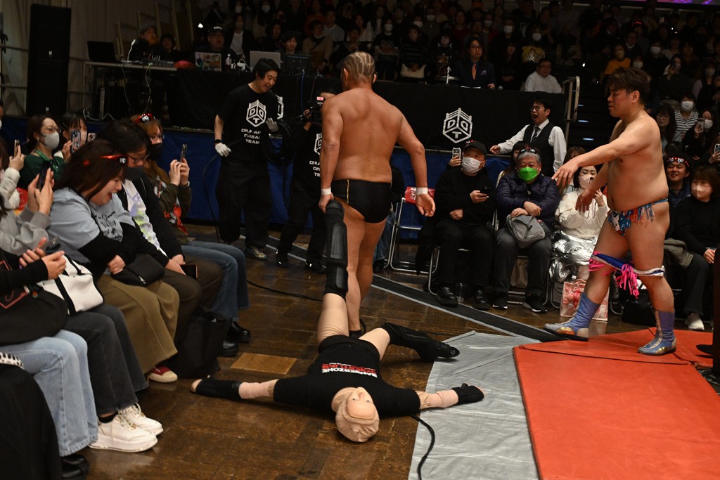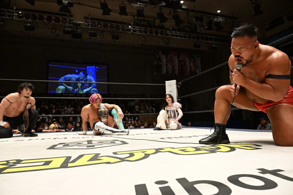 ここで今林久弥GMが次期防衛戦は3・22後楽園となることをアナウンスし、「戦いたい相手はいますか?」と問うと、STRANGE LOVE CONNECTIONのMCであるKIMIHIROがKANONを呼び込んだ。KANONは「上野さん、DDTのテッペン獲りに来ました。俺はDDTの生え抜きじゃないけど、4年間DDTに参戦して、めちゃくちゃ日に日にDDTが大好きになってます。そんな大好きな団体のトップのベルト欲しいじゃないですか。ちょっと傷心なとこ申し訳ないけど、そのKO-D無差別級、挑戦させてください」とアピール。