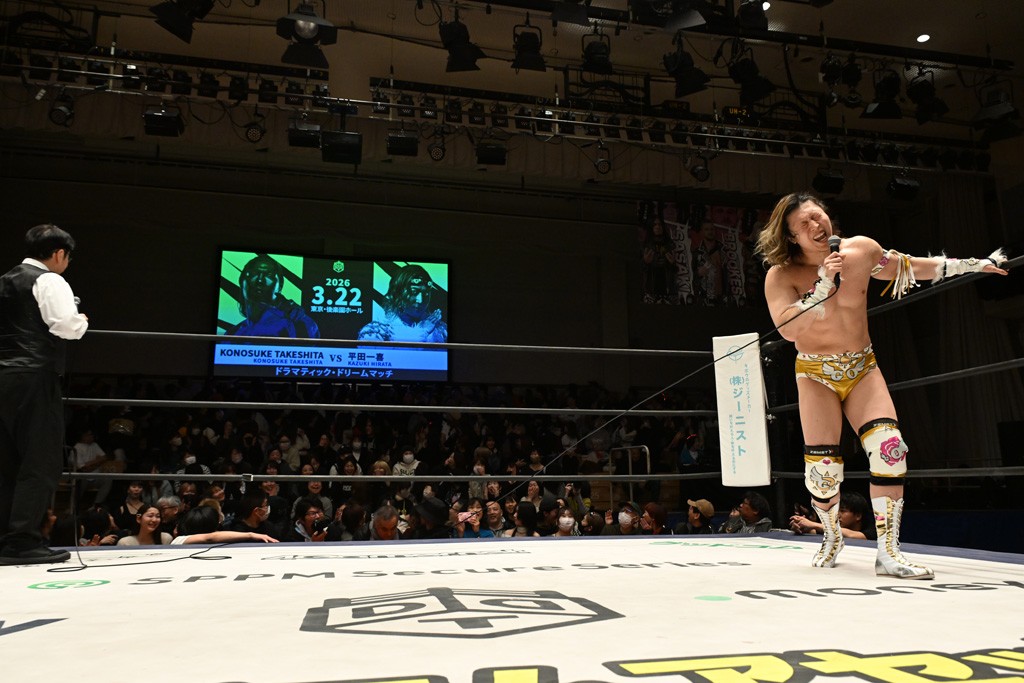 武知戦が流れてしまったが、TAKESHITAは「こういうのはタイミングだと思うんですよ。たぶんプロレスの神様がいるって信じてるから、今じゃなかったんだろうね」と述べた。「旗揚げ29周年記念大会」(3・22後楽園)では平田一喜との一騎打ちが決まったが、「平田さんとのシングルなんて、たぶん10何年ぶりなんで。僕も強くなってるし、たぶん平田さんも強くなってると思うので非常に楽しみです」と笑みを見せた。