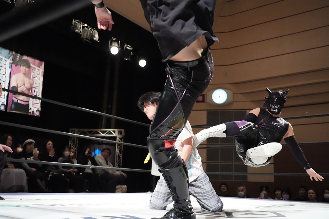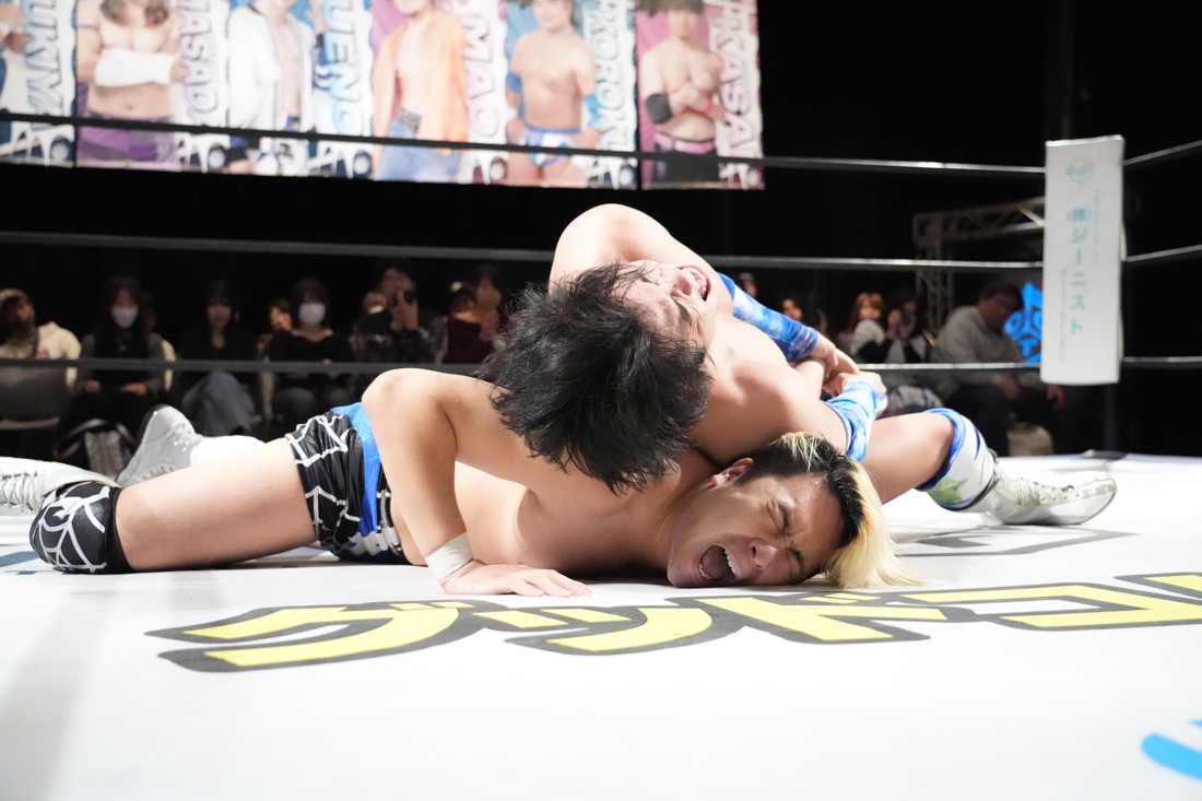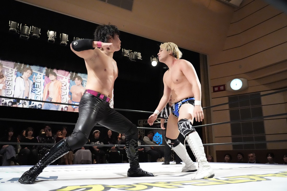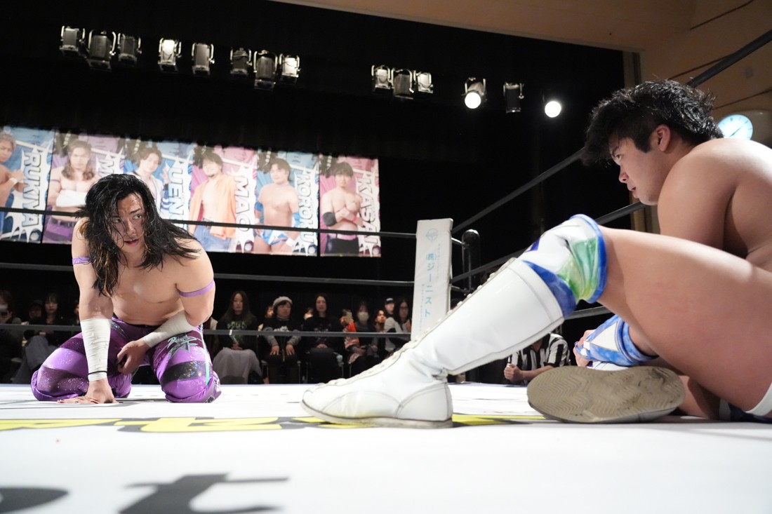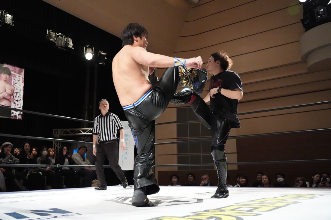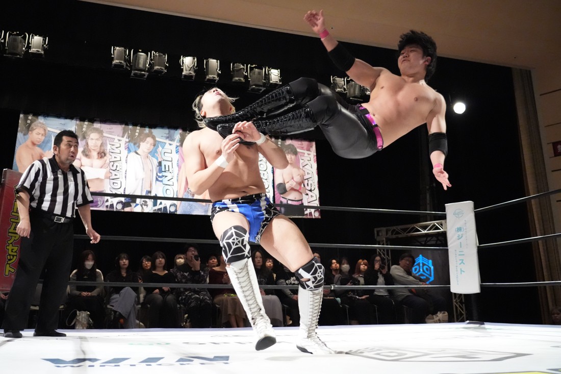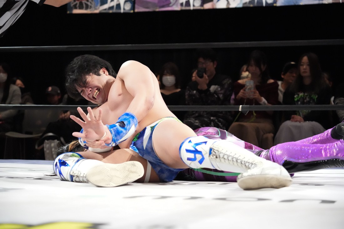 2月8日、愛知・今池ガスホールで「イマイケファイト・フィーバー 2026」が開催。新世代によるシングルNo.1決定リーグ戦「D GENERATIONS CUP 2026」Bブロックが最終戦を迎え、オープニングマッチで2勝1敗4点の瑠希也と3敗0点の葛西陽向が対戦。何としてでも1勝あげたい陽向は積極的に攻め込んでいくが、瑠希也がプロトボム2連発で勝利。陽向は全敗で公式戦を終えたが、瑠希也はメインの結果次第ではBブロック代表になる可能性が残された。