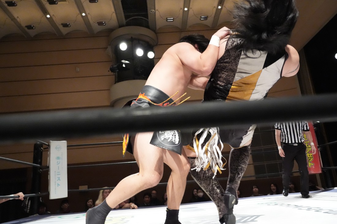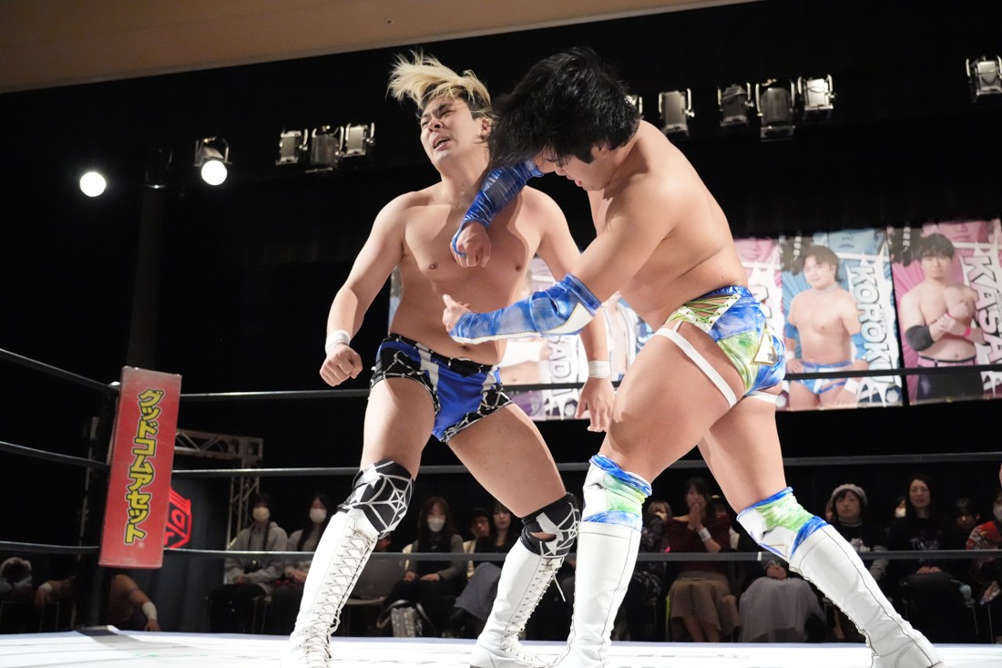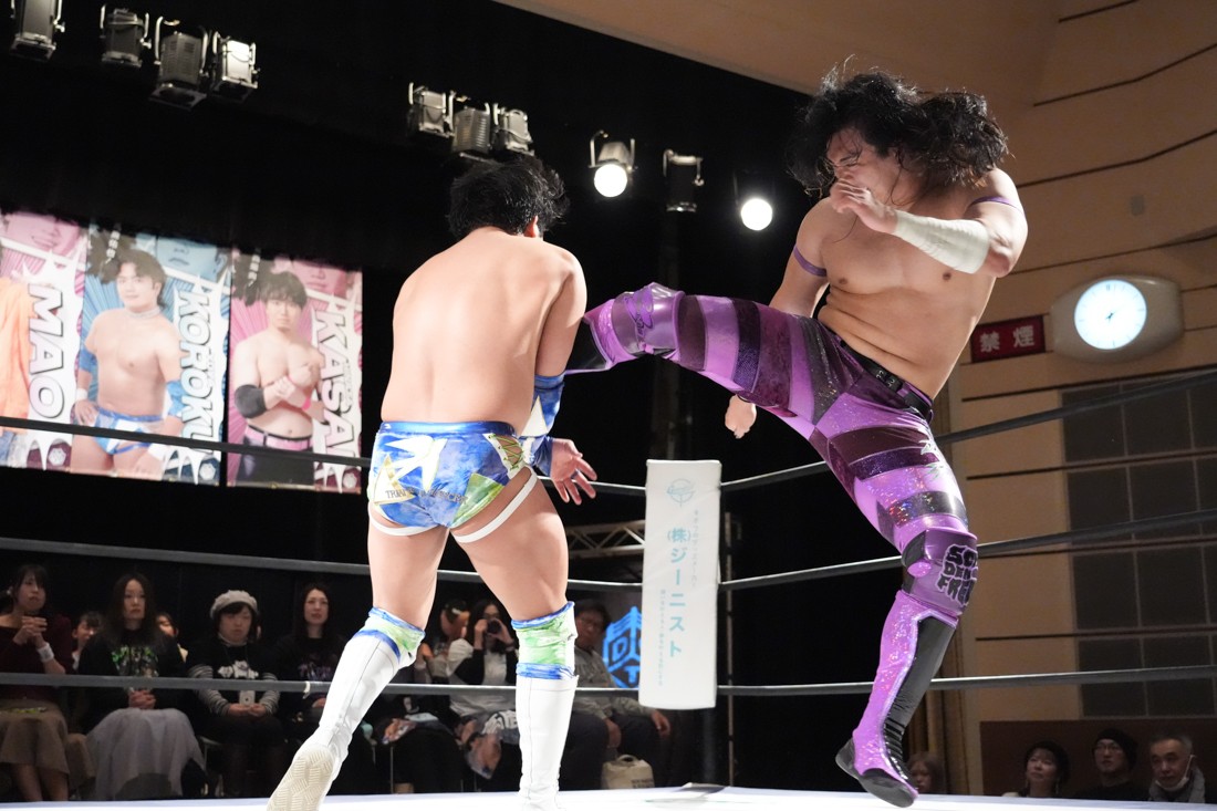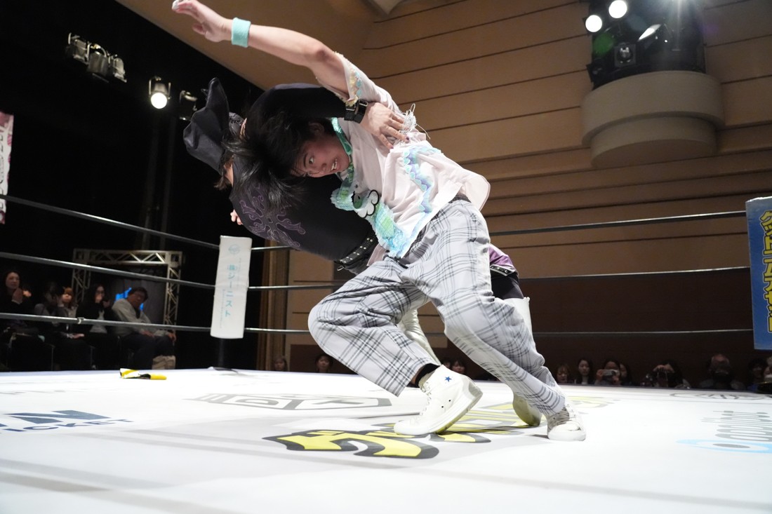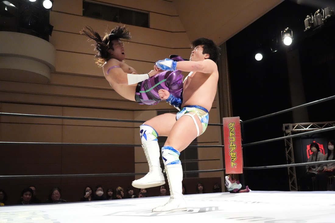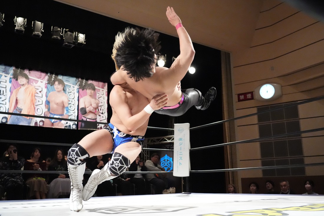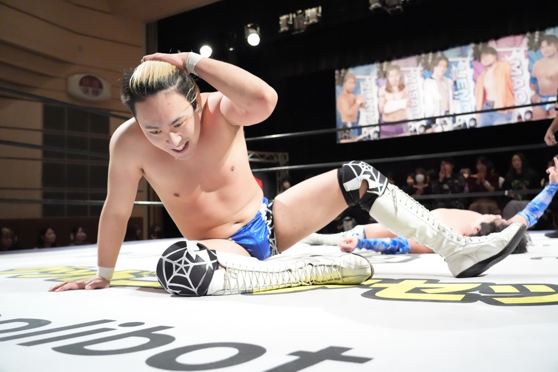 2月8日、愛知・今池ガスホールで「イマイケファイト・フィーバー 2026」が開催。新世代によるシングルNo.1決定リーグ戦「D GENERATIONS CUP 2026」Bブロックが最終戦を迎え、オープニングマッチで2勝1敗4点の瑠希也と3敗0点の葛西陽向が対戦。何としてでも1勝あげたい陽向は積極的に攻め込んでいくが、瑠希也がプロトボム2連発で勝利。陽向は全敗で公式戦を終えたが、瑠希也はメインの結果次第ではBブロック代表になる可能性が残された。
