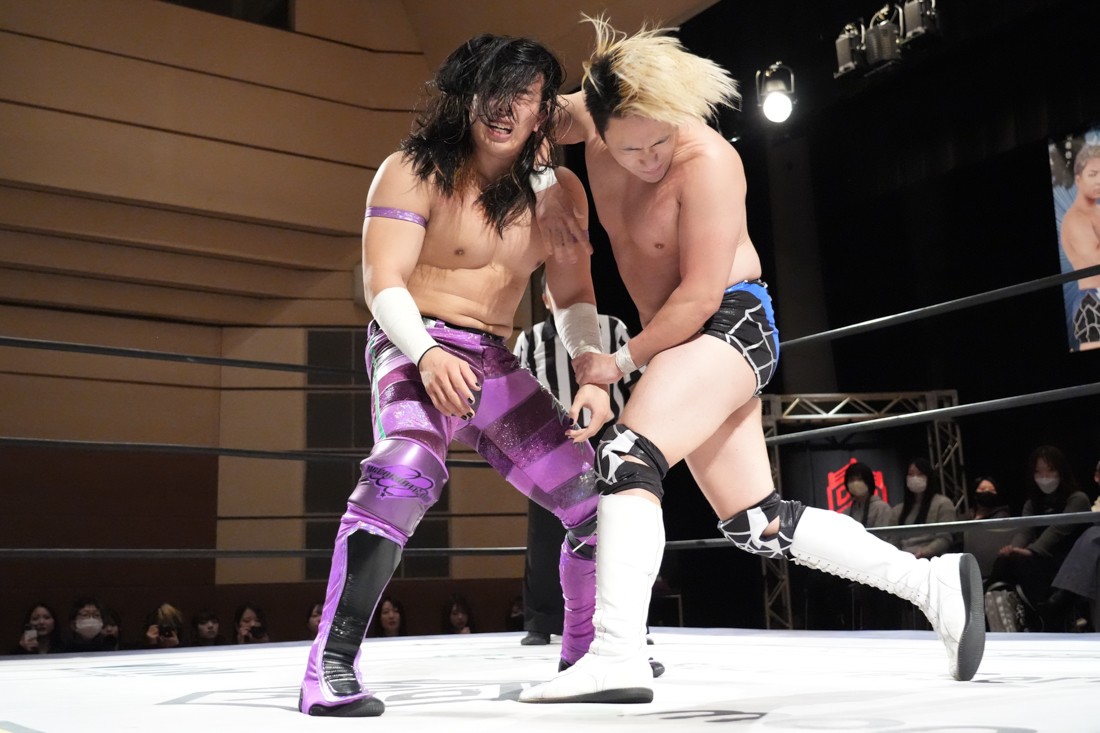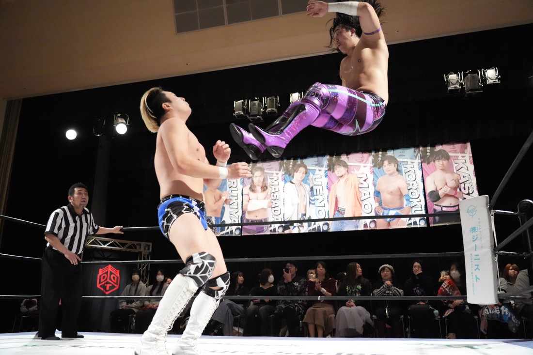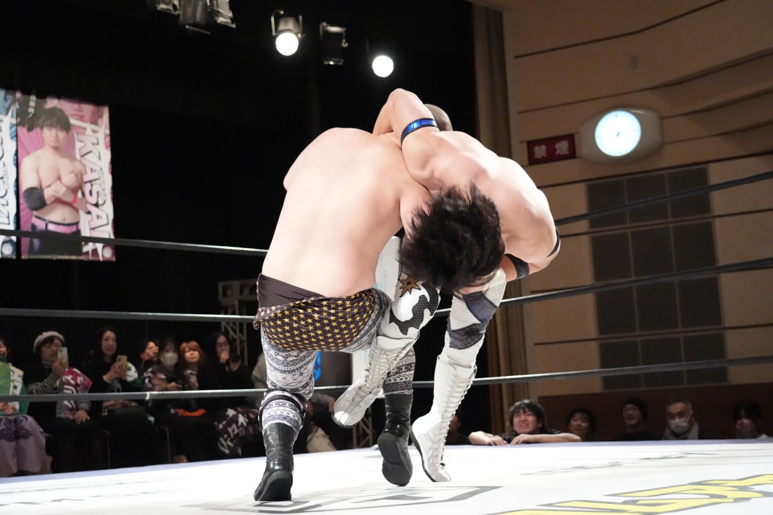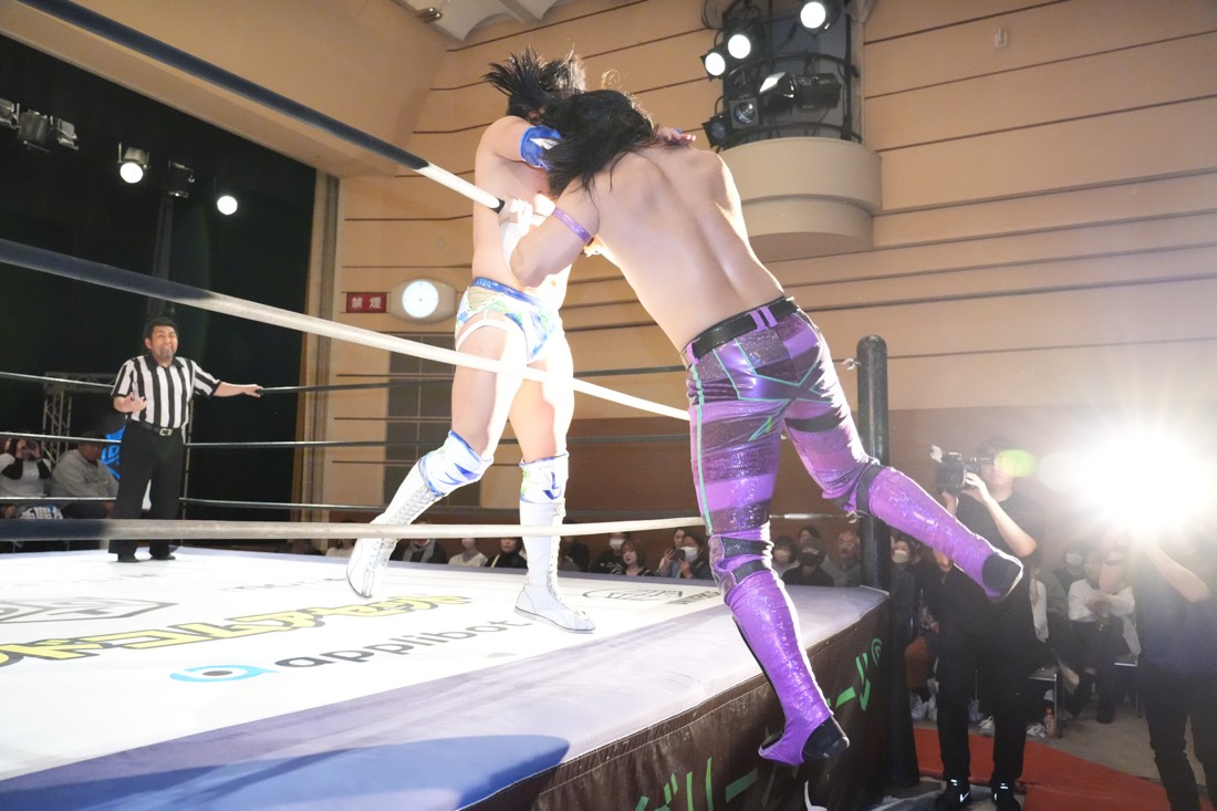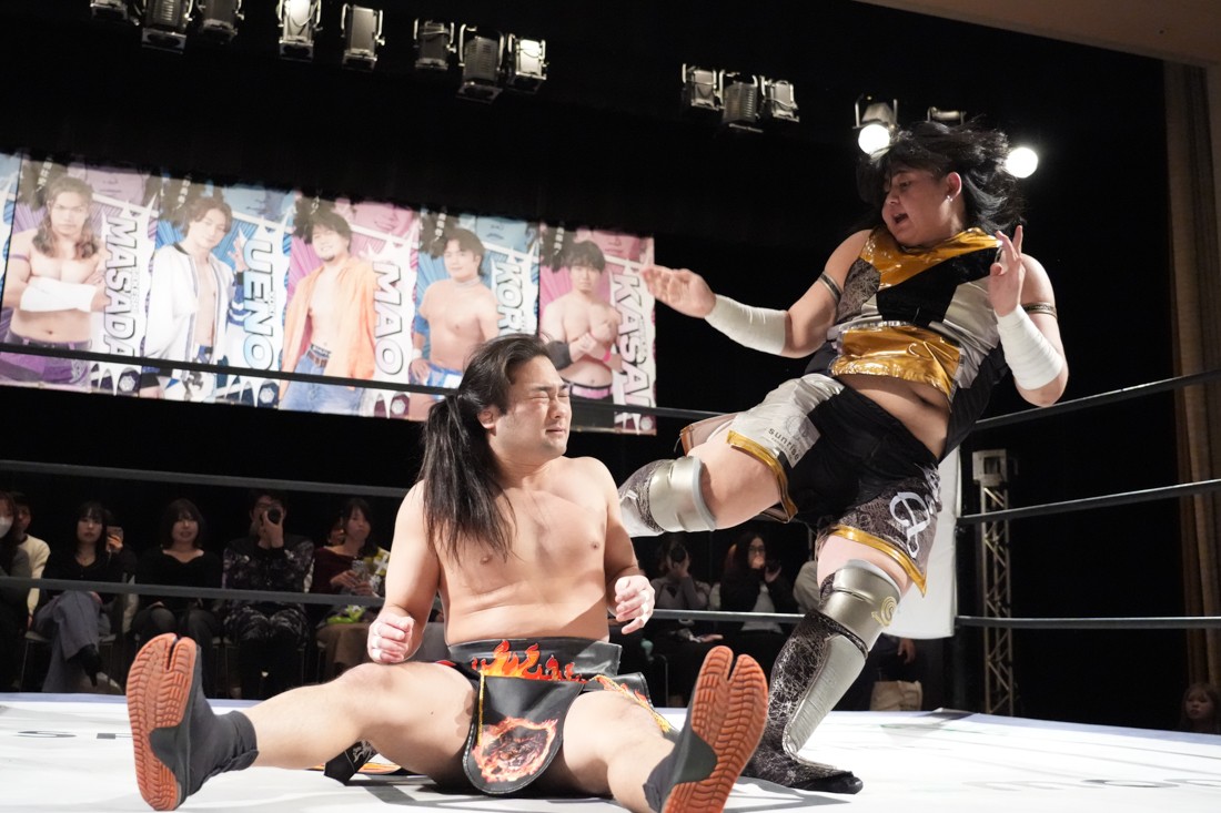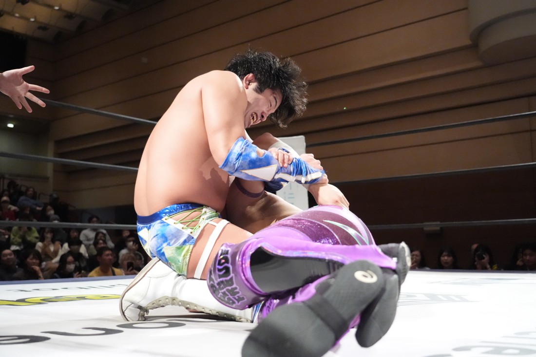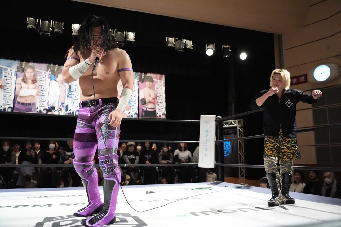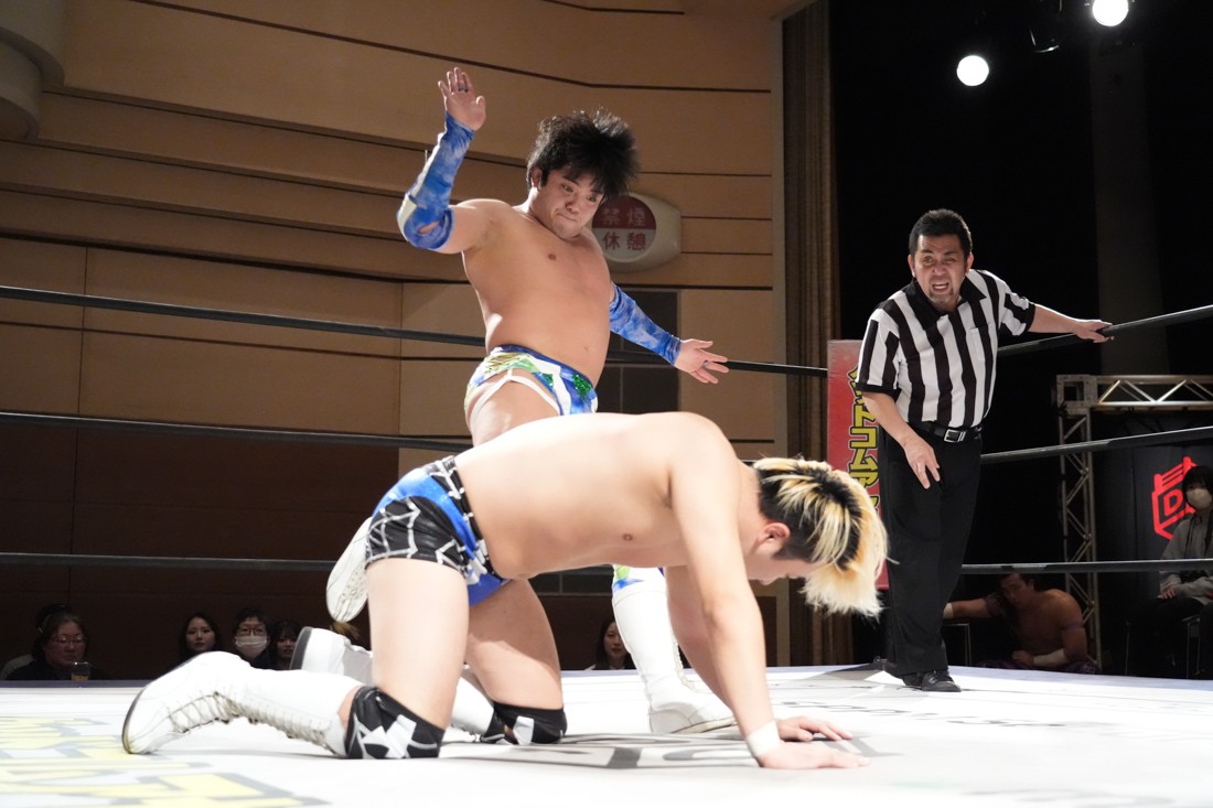 2月8日、愛知・今池ガスホールで「イマイケファイト・フィーバー 2026」が開催。新世代によるシングルNo.1決定リーグ戦「D GENERATIONS CUP 2026」Bブロックが最終戦を迎え、オープニングマッチで2勝1敗4点の瑠希也と3敗0点の葛西陽向が対戦。何としてでも1勝あげたい陽向は積極的に攻め込んでいくが、瑠希也がプロトボム2連発で勝利。陽向は全敗で公式戦を終えたが、瑠希也はメインの結果次第ではBブロック代表になる可能性が残された。