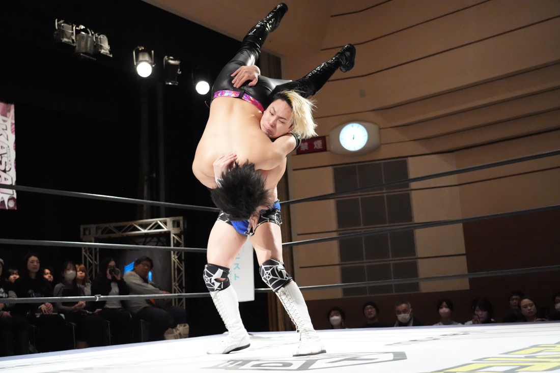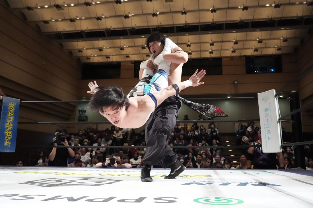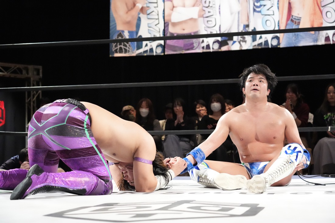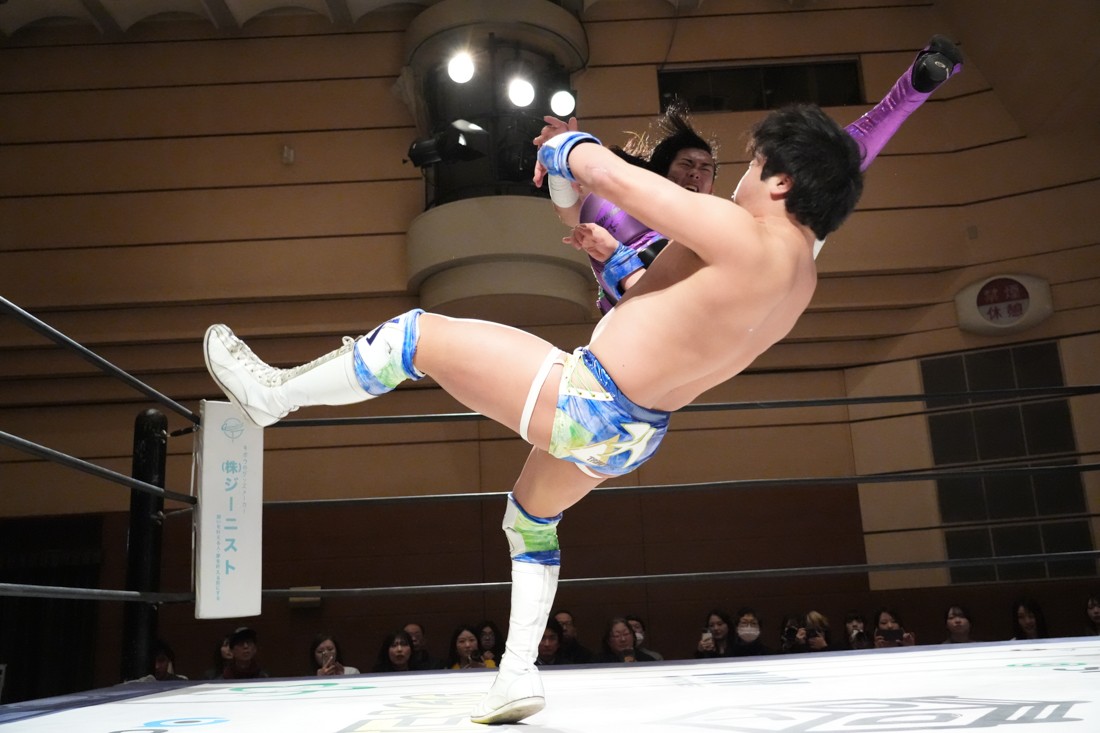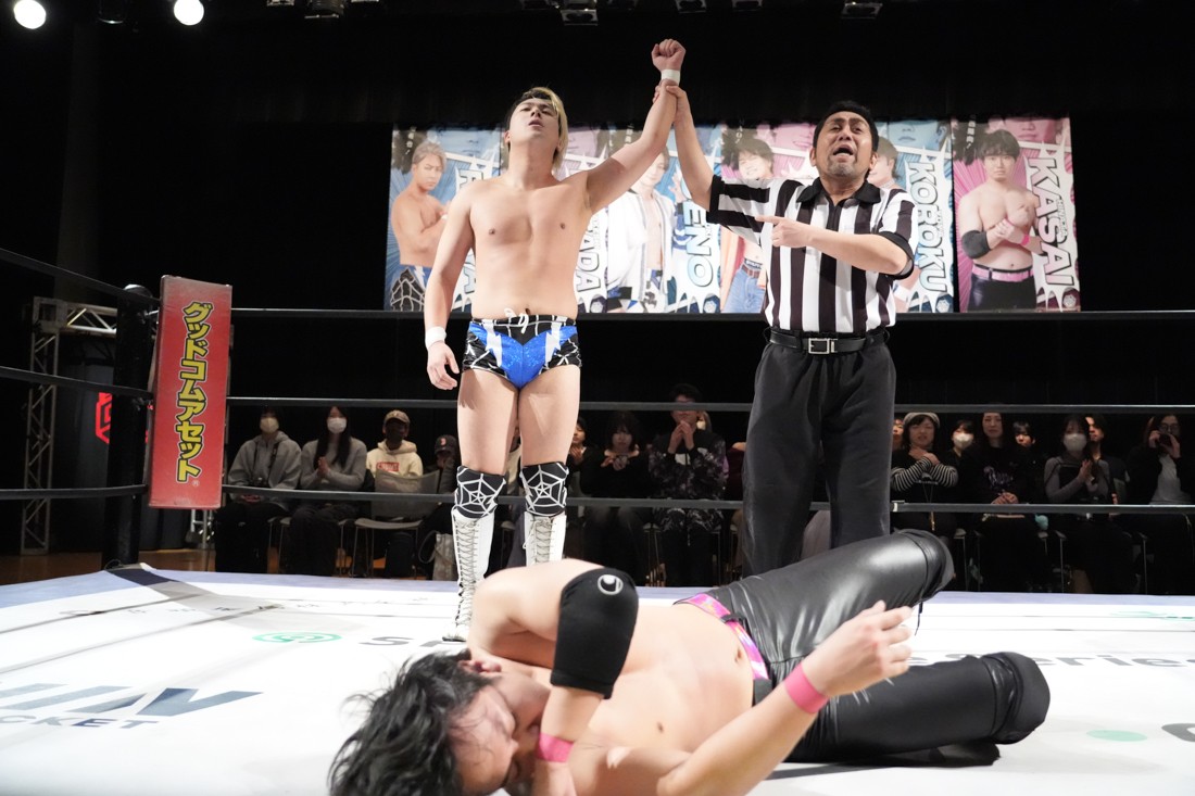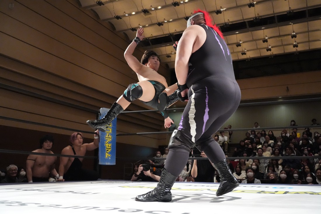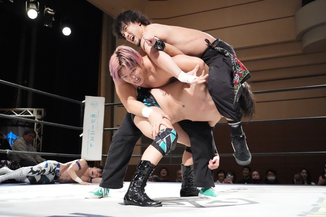 2月8日、愛知・今池ガスホールで「イマイケファイト・フィーバー 2026」が開催。新世代によるシングルNo.1決定リーグ戦「D GENERATIONS CUP 2026」Bブロックが最終戦を迎え、オープニングマッチで2勝1敗4点の瑠希也と3敗0点の葛西陽向が対戦。何としてでも1勝あげたい陽向は積極的に攻め込んでいくが、瑠希也がプロトボム2連発で勝利。陽向は全敗で公式戦を終えたが、瑠希也はメインの結果次第ではBブロック代表になる可能性が残された。
