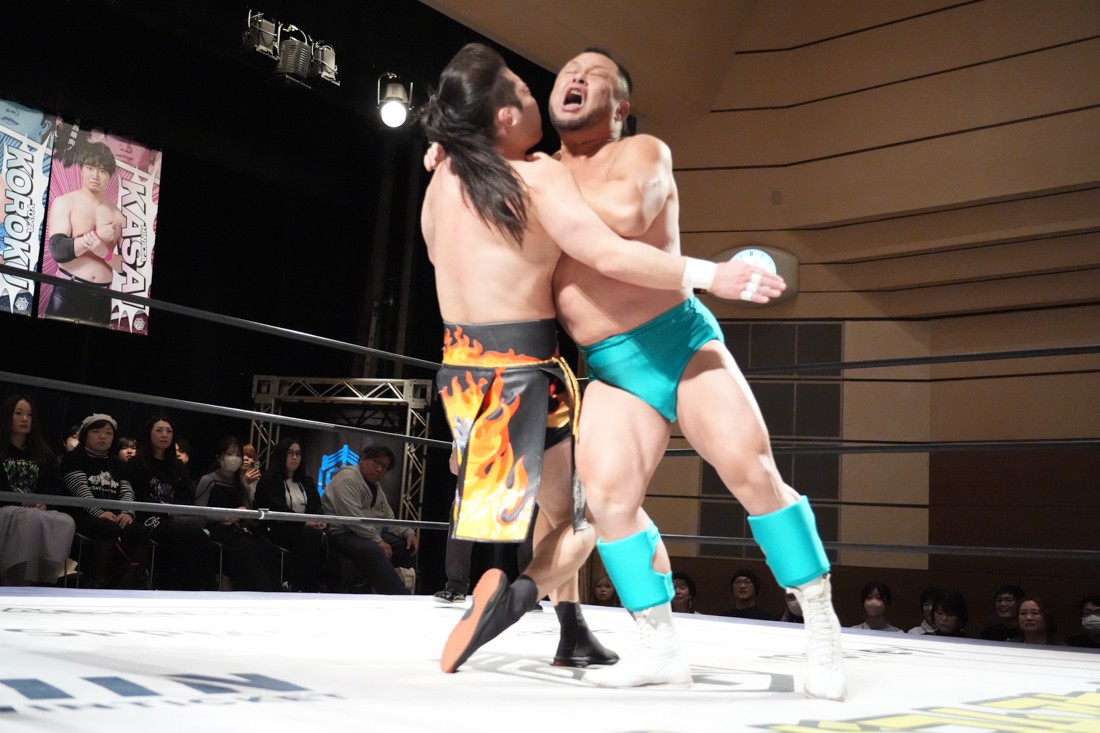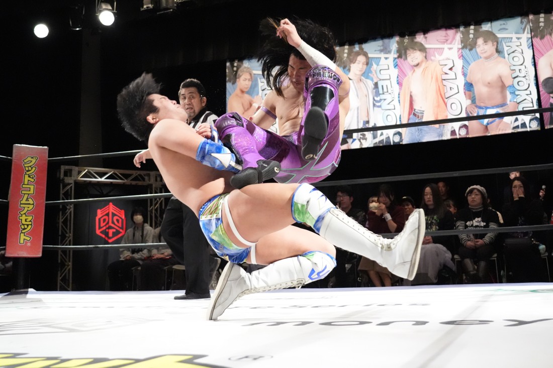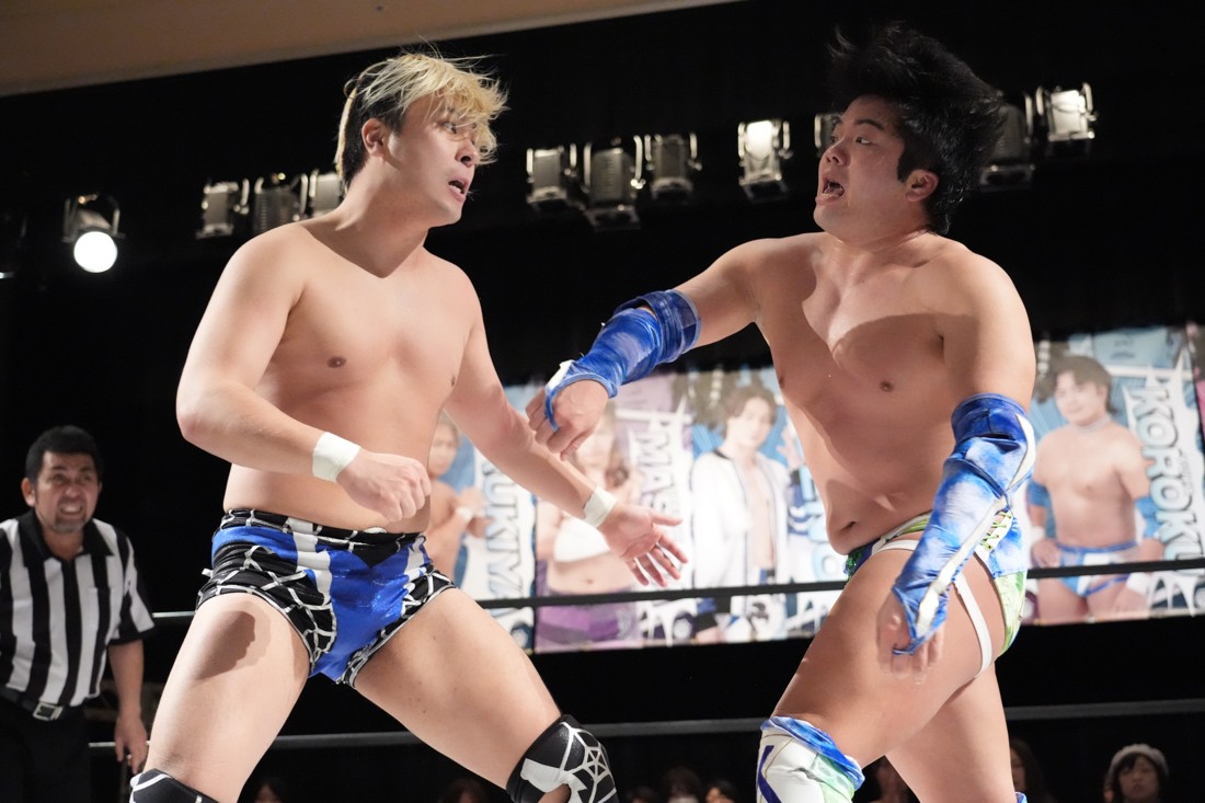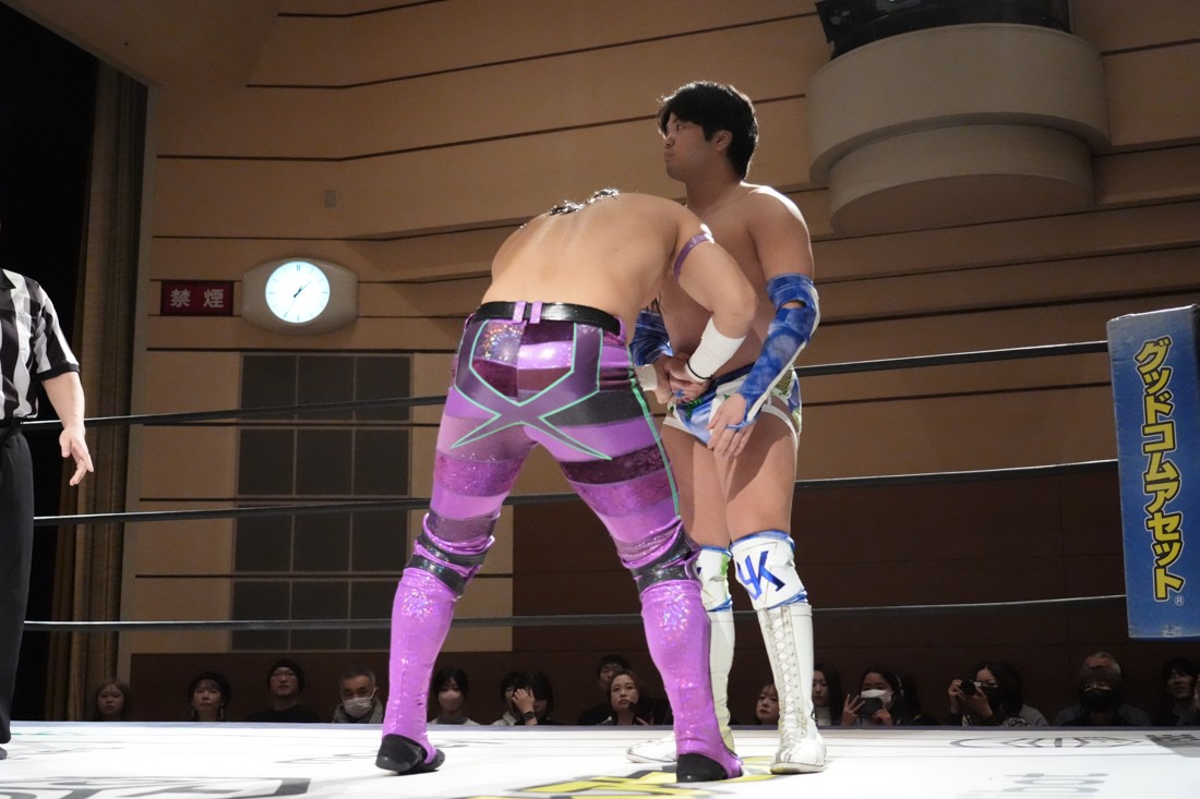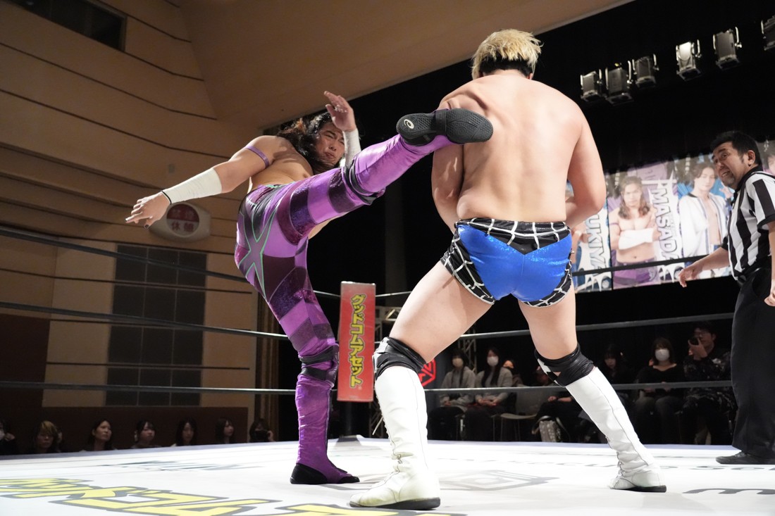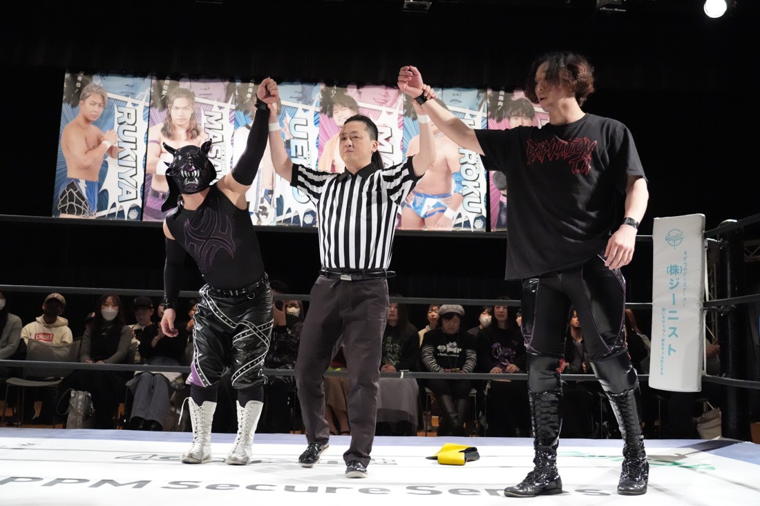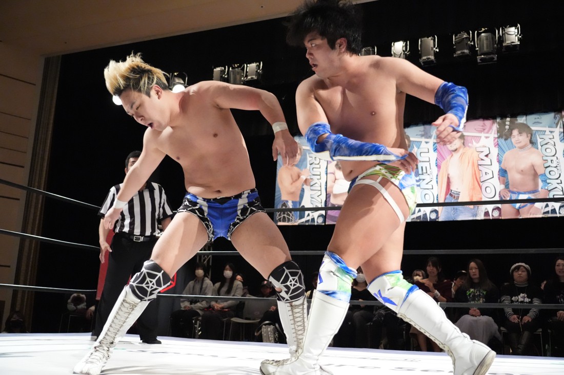 2月8日、愛知・今池ガスホールで「イマイケファイト・フィーバー 2026」が開催。新世代によるシングルNo.1決定リーグ戦「D GENERATIONS CUP 2026」Bブロックが最終戦を迎え、オープニングマッチで2勝1敗4点の瑠希也と3敗0点の葛西陽向が対戦。何としてでも1勝あげたい陽向は積極的に攻め込んでいくが、瑠希也がプロトボム2連発で勝利。陽向は全敗で公式戦を終えたが、瑠希也はメインの結果次第ではBブロック代表になる可能性が残された。