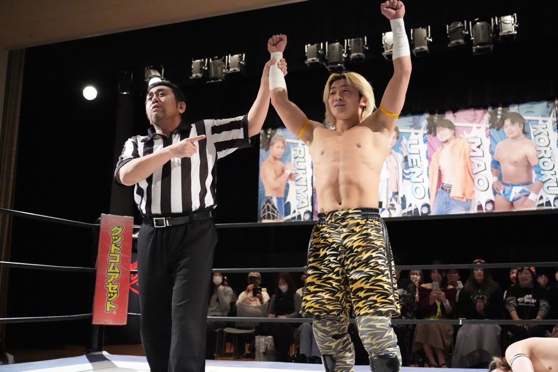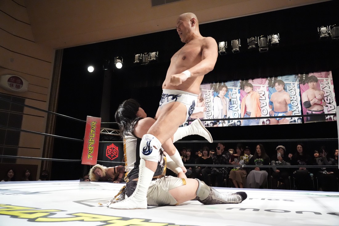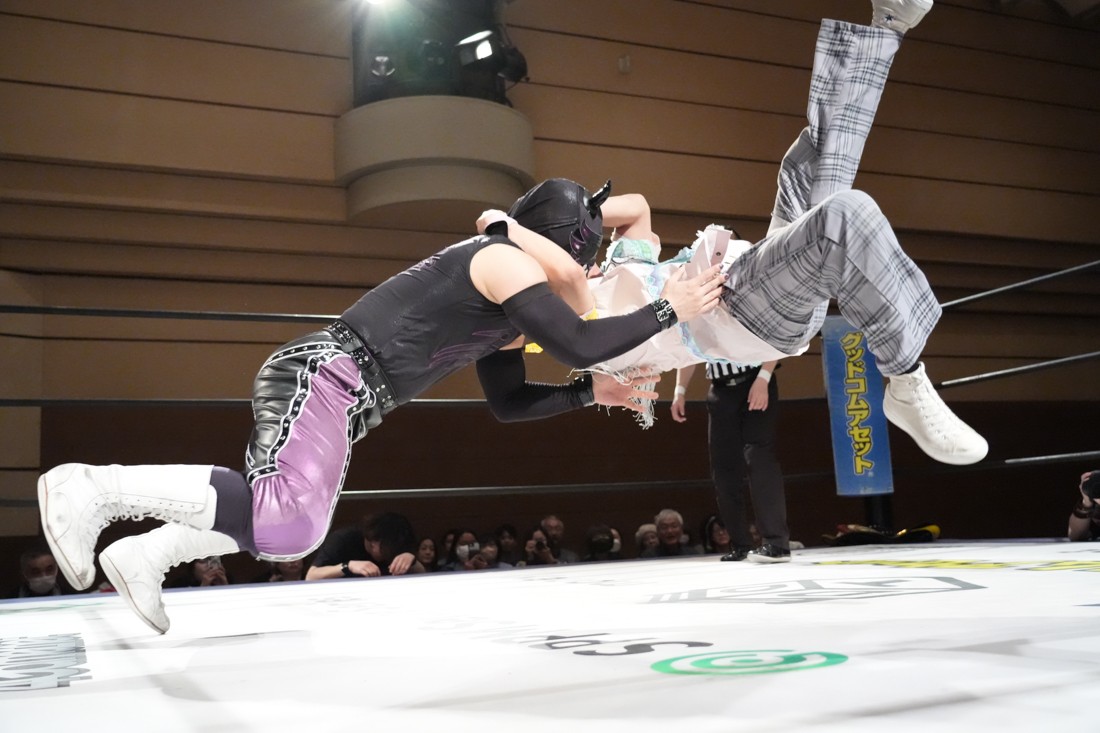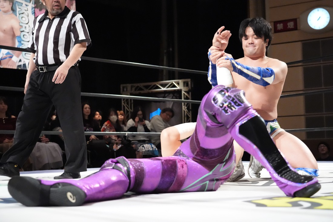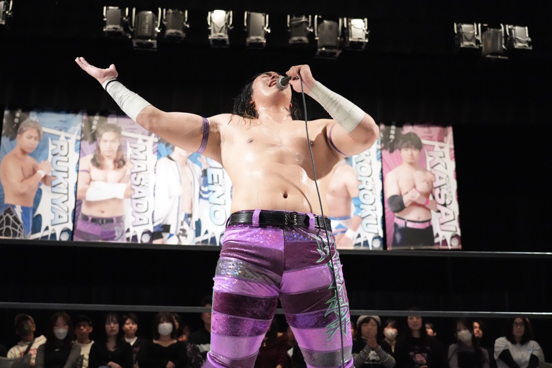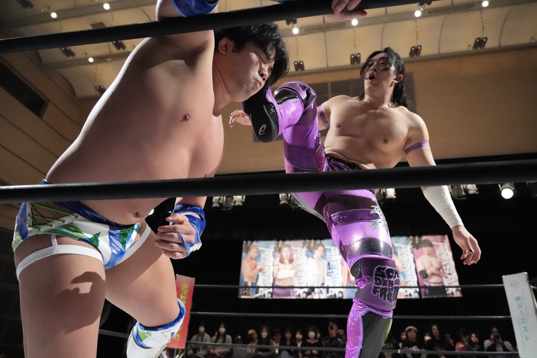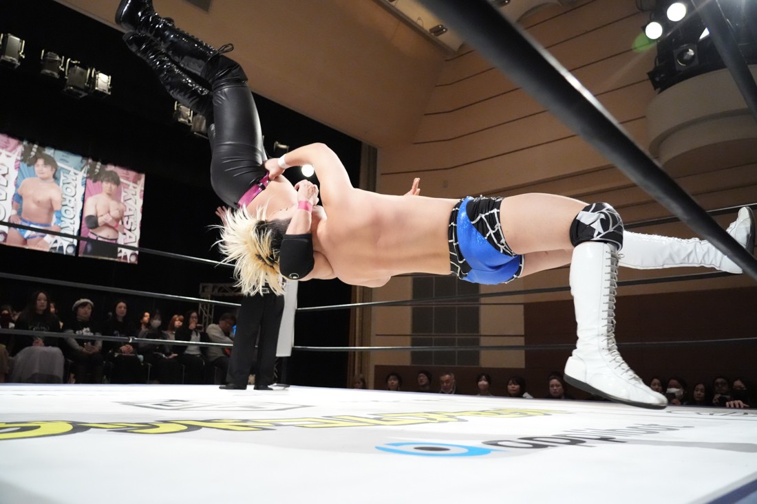 2月8日、愛知・今池ガスホールで「イマイケファイト・フィーバー 2026」が開催。新世代によるシングルNo.1決定リーグ戦「D GENERATIONS CUP 2026」Bブロックが最終戦を迎え、オープニングマッチで2勝1敗4点の瑠希也と3敗0点の葛西陽向が対戦。何としてでも1勝あげたい陽向は積極的に攻め込んでいくが、瑠希也がプロトボム2連発で勝利。陽向は全敗で公式戦を終えたが、瑠希也はメインの結果次第ではBブロック代表になる可能性が残された。