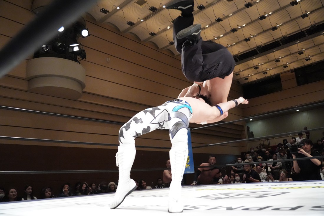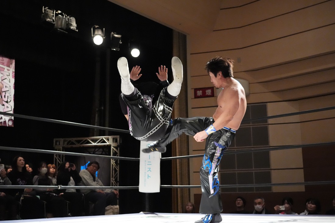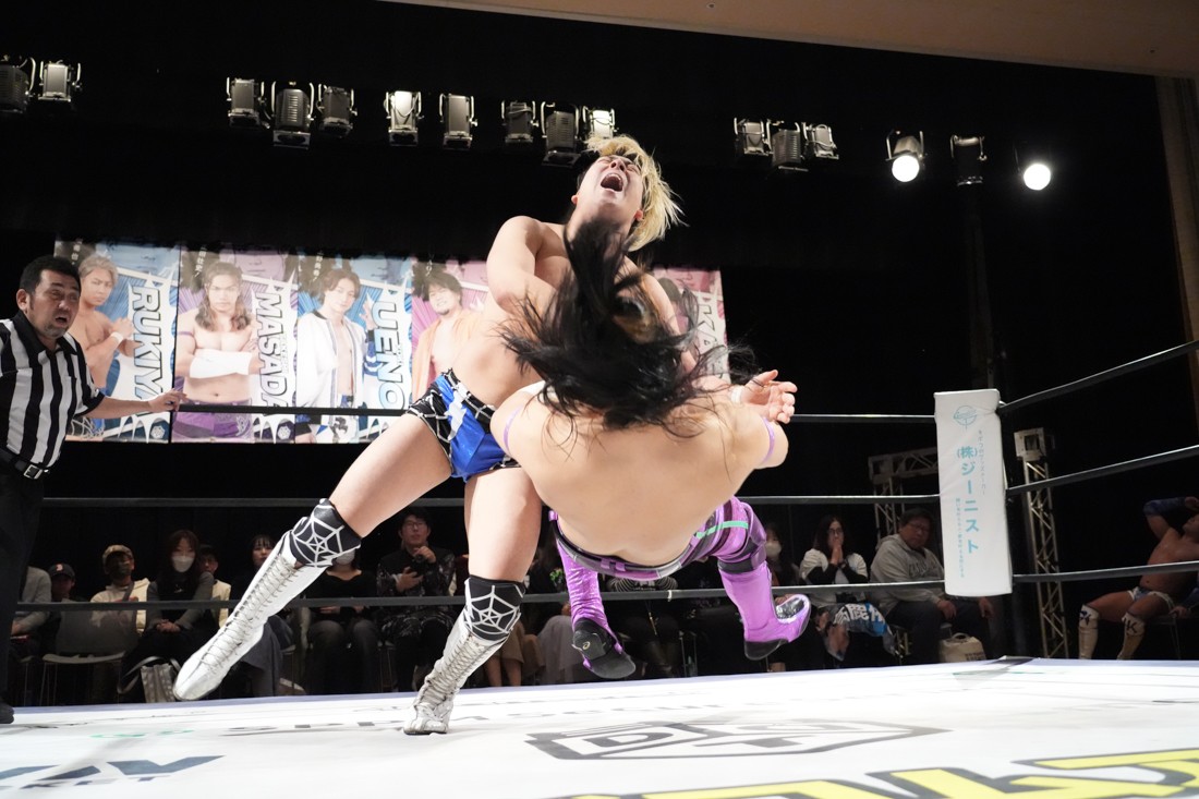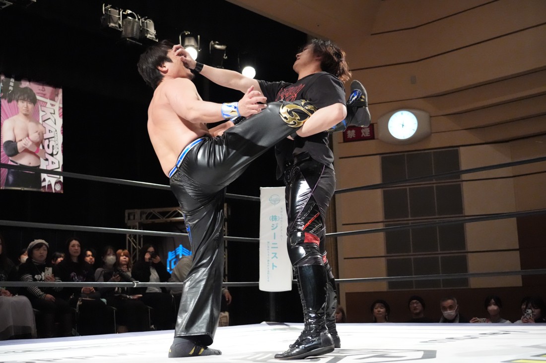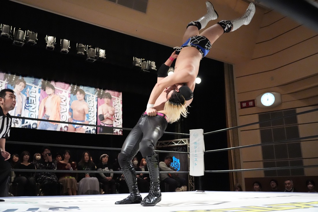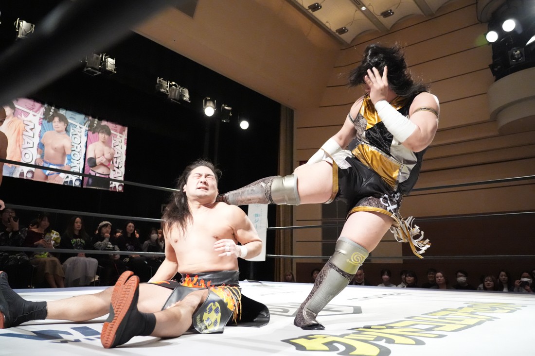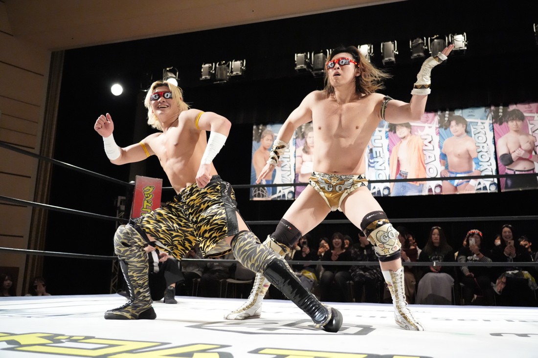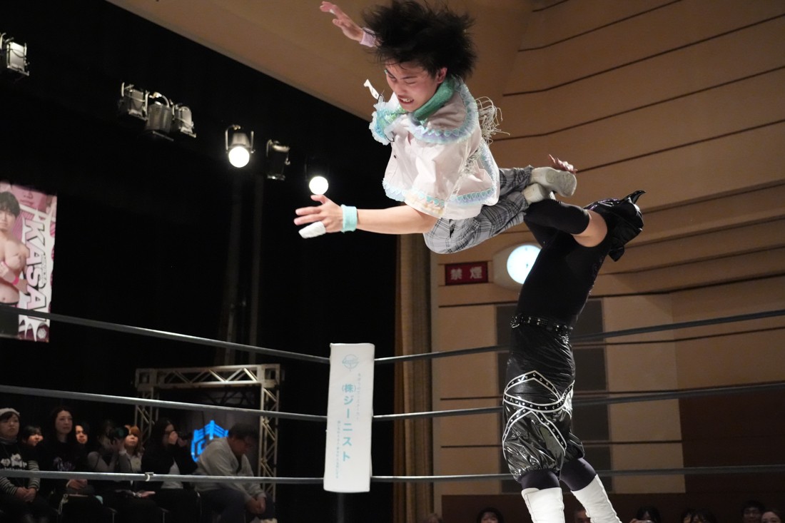 2月8日、愛知・今池ガスホールで「イマイケファイト・フィーバー 2026」が開催。新世代によるシングルNo.1決定リーグ戦「D GENERATIONS CUP 2026」Bブロックが最終戦を迎え、オープニングマッチで2勝1敗4点の瑠希也と3敗0点の葛西陽向が対戦。何としてでも1勝あげたい陽向は積極的に攻め込んでいくが、瑠希也がプロトボム2連発で勝利。陽向は全敗で公式戦を終えたが、瑠希也はメインの結果次第ではBブロック代表になる可能性が残された。