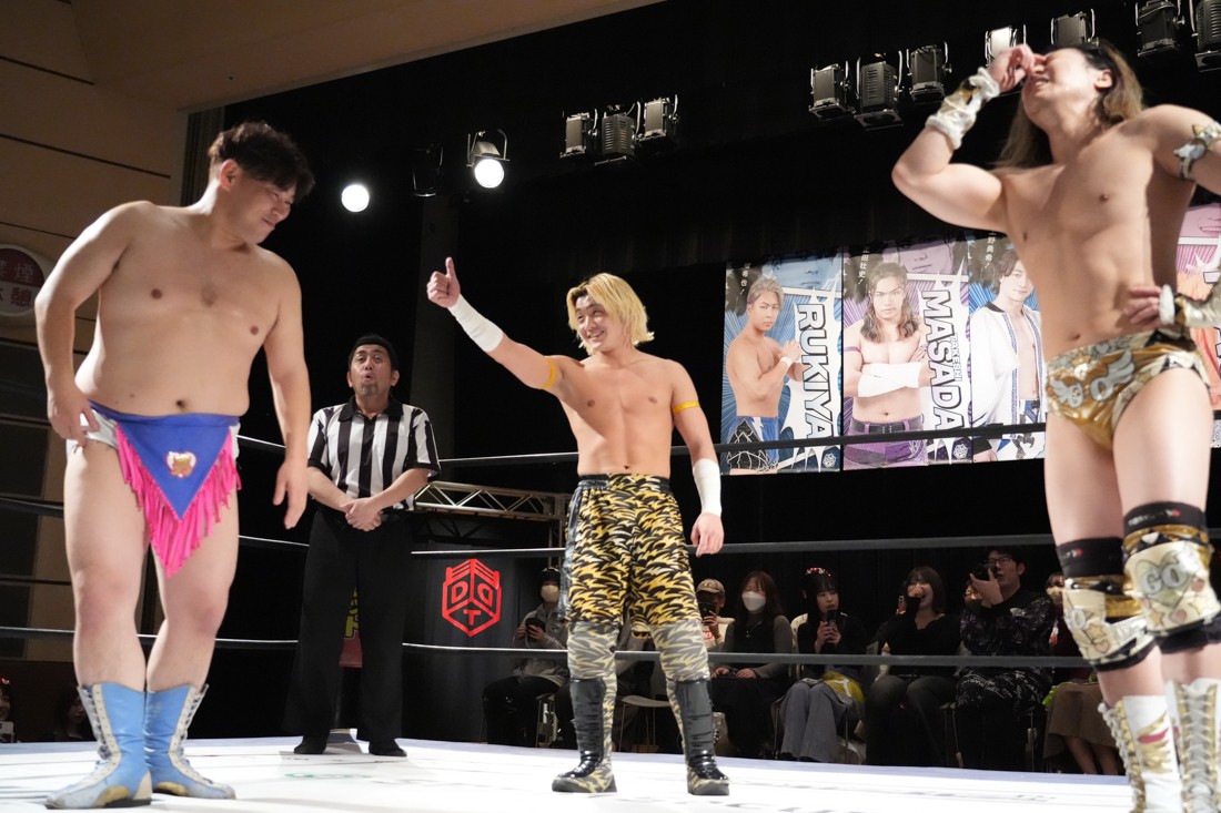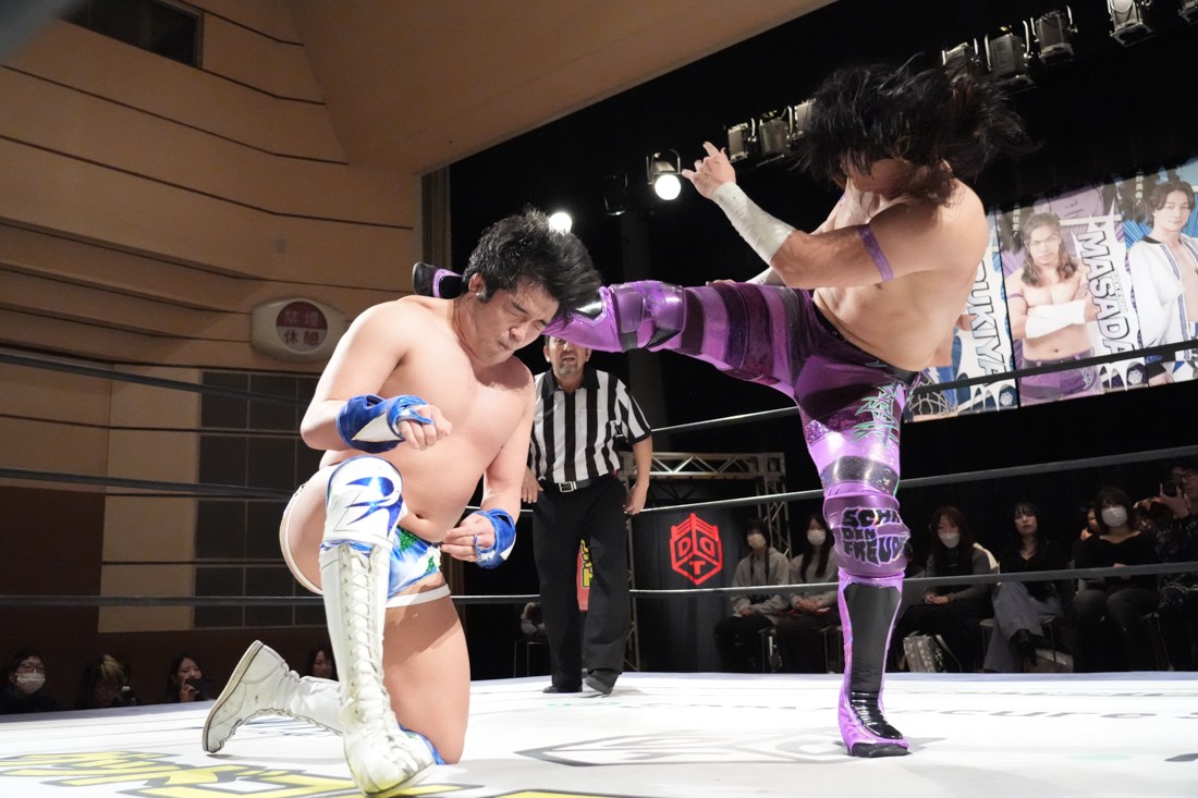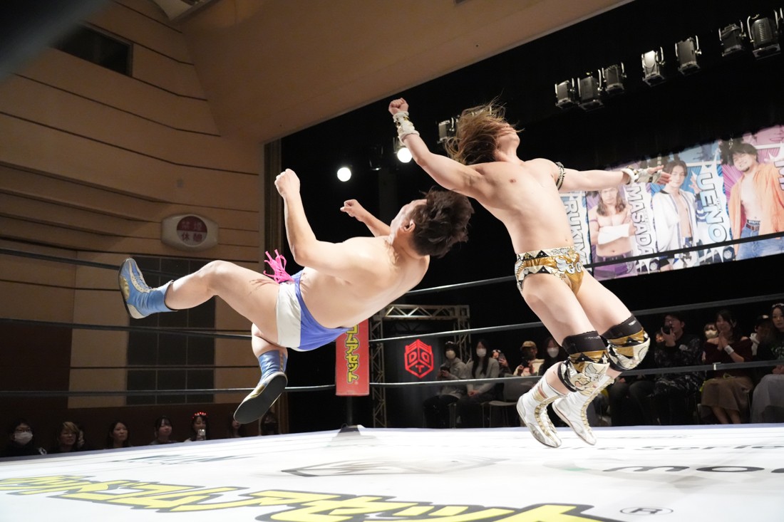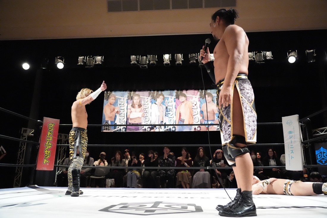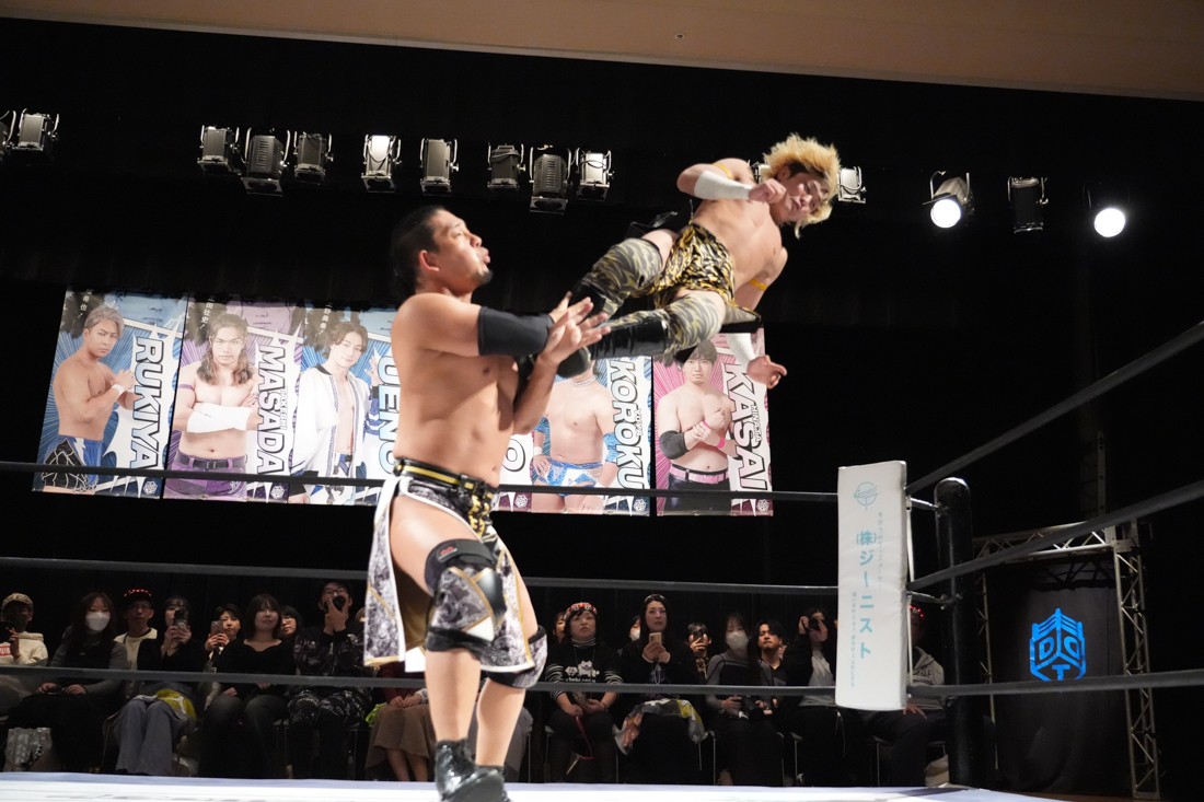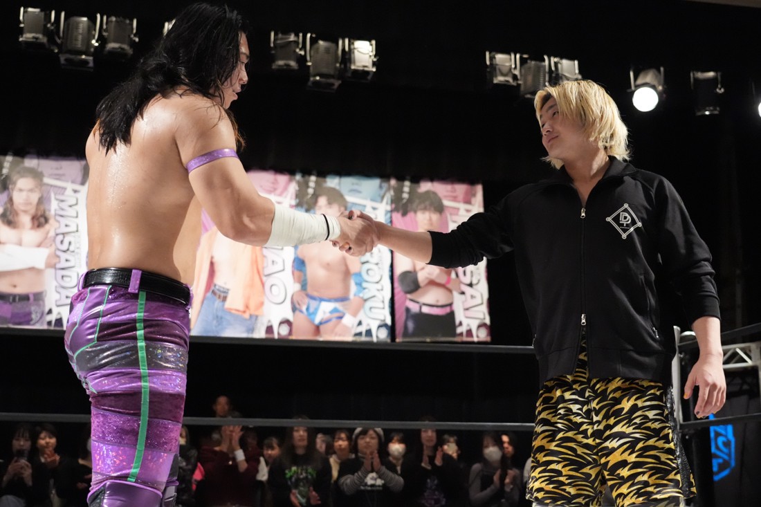 高鹿がリングを降りると、巴戦もリングサイドからずっと見ていた須見が入ってきて「やっと…やっと正田さんとシングルマッチが出来る日が来ましたね。俺と正田さんと瑠希也は同期で、一番先頭走っていたのが正田壮史だった。その背中を見て俺は必ず追いつこうと思っていた。その日は“来月”2月22日……」と言ったところで、正田が「今月やぞ」と突っ込む。須見は改めて「いま俺は最高に乗ってて、最高に面白いレスラーだからな! 正田を超える、そして俺が優勝してDDTのテッペン獲る! 後楽園で会おう」と宣戦布告。対する正田は背中を見せながら「どうや、須見和馬! 同期の背中は大きいやろ。俺は同期……俺はそんな次元じゃないぞ。俺はもうDDTの中で闘ってんねん! その格の違い、見せたるわ。楽しみにしてろよ!」と返した。須見と握手をしたあと、一人リングに残った正田は「Bブロック代表です。いつもの僕の計算だと全勝で難なく代表だったんですけど、ちょっと計算が間違えたようで。文系なんで。でもいまBブロック代表に選ばれて、答えは合っているんでこのままDGC優勝するのは、この俺です! 俺に任せてくださーい!」と叫んで今池大会を締めた。