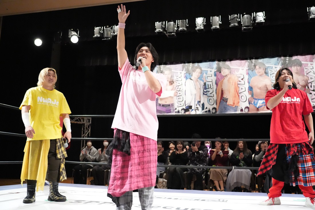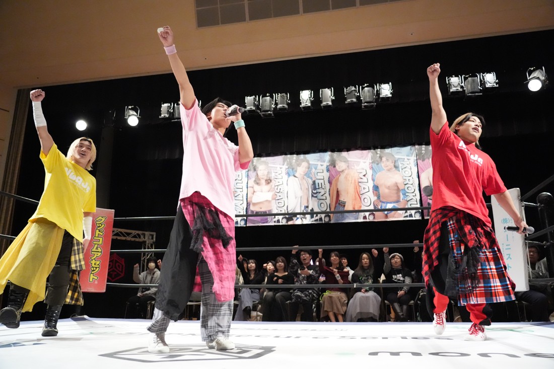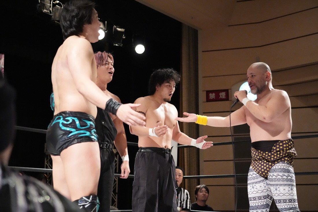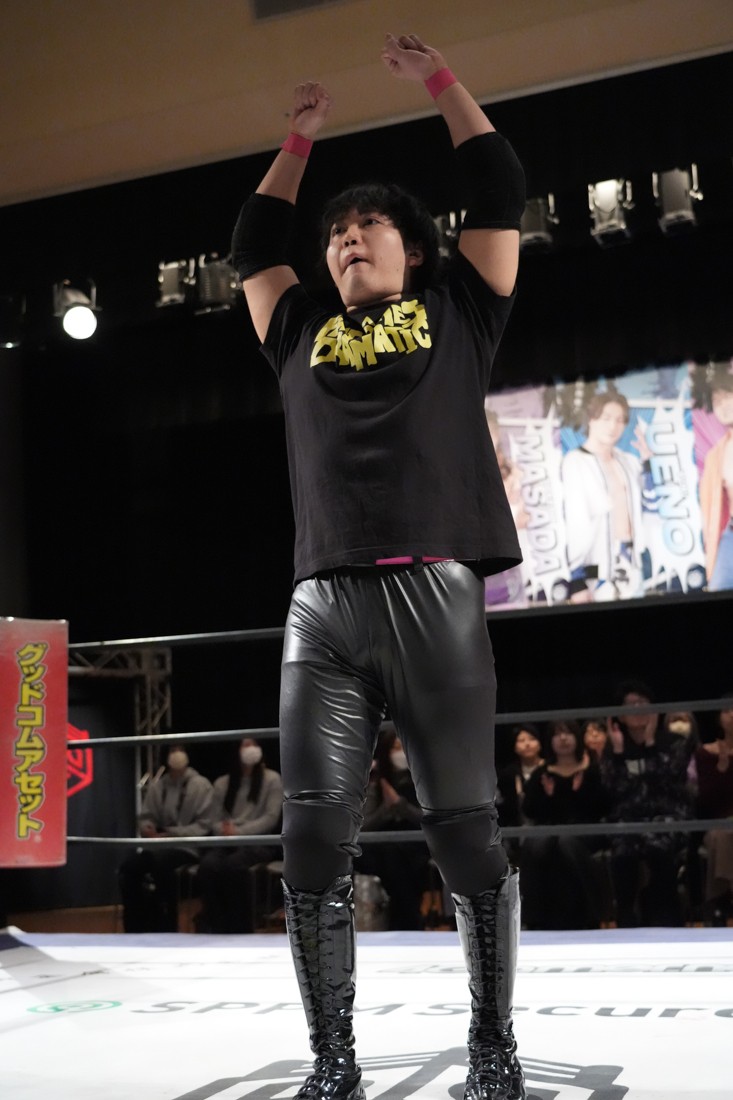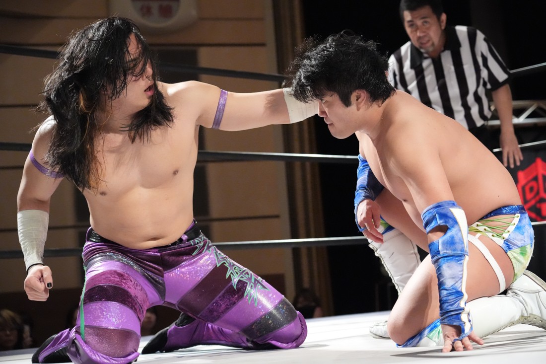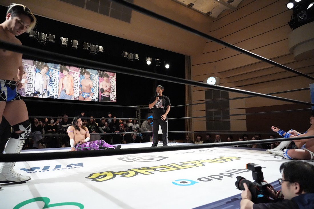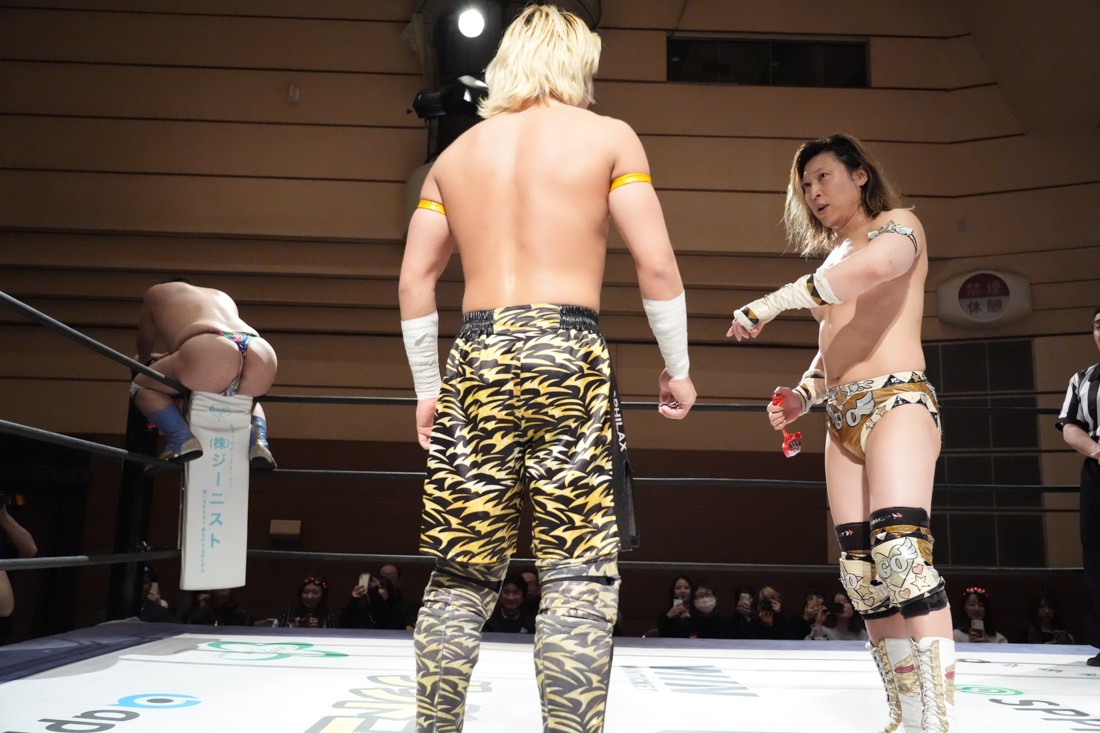 高鹿がリングを降りると、巴戦もリングサイドからずっと見ていた須見が入ってきて「やっと…やっと正田さんとシングルマッチが出来る日が来ましたね。俺と正田さんと瑠希也は同期で、一番先頭走っていたのが正田壮史だった。その背中を見て俺は必ず追いつこうと思っていた。その日は“来月”2月22日……」と言ったところで、正田が「今月やぞ」と突っ込む。須見は改めて「いま俺は最高に乗ってて、最高に面白いレスラーだからな! 正田を超える、そして俺が優勝してDDTのテッペン獲る! 後楽園で会おう」と宣戦布告。対する正田は背中を見せながら「どうや、須見和馬! 同期の背中は大きいやろ。俺は同期……俺はそんな次元じゃないぞ。俺はもうDDTの中で闘ってんねん! その格の違い、見せたるわ。楽しみにしてろよ!」と返した。須見と握手をしたあと、一人リングに残った正田は「Bブロック代表です。いつもの僕の計算だと全勝で難なく代表だったんですけど、ちょっと計算が間違えたようで。文系なんで。でもいまBブロック代表に選ばれて、答えは合っているんでこのままDGC優勝するのは、この俺です! 俺に任せてくださーい!」と叫んで今池大会を締めた。