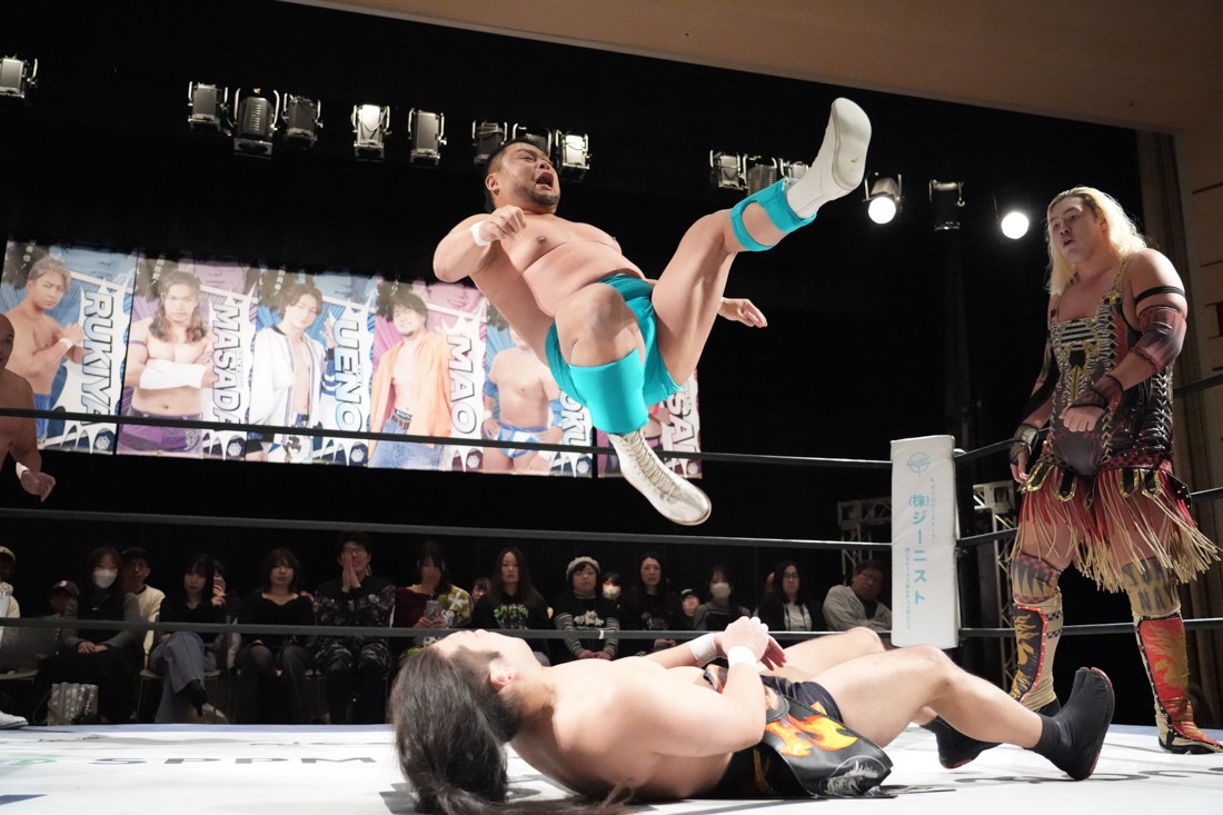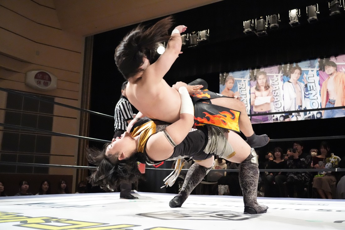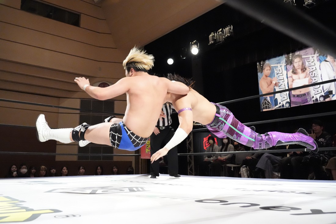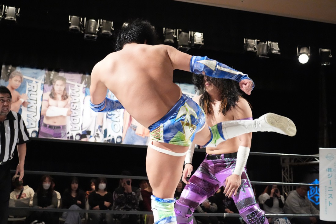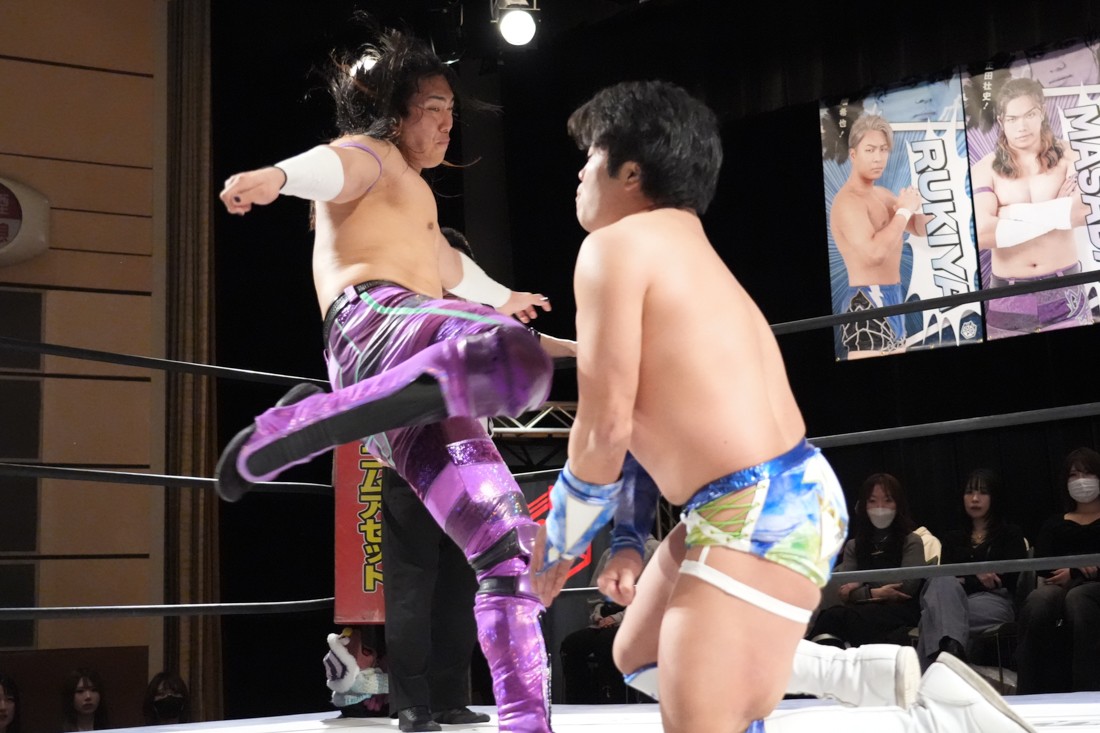 そのまま瑠希也は正田と対戦。若干ながら休憩できた正田は蹴りで応戦。瑠希也は高鹿から勝利した勢いそのままにエルボーを連打。さらにランニングエルボー、そして必殺のプロトボムで叩き付けたが、その直後、正田が首固めで丸め込んで勝利。