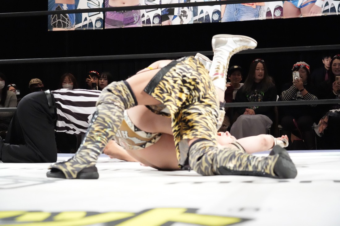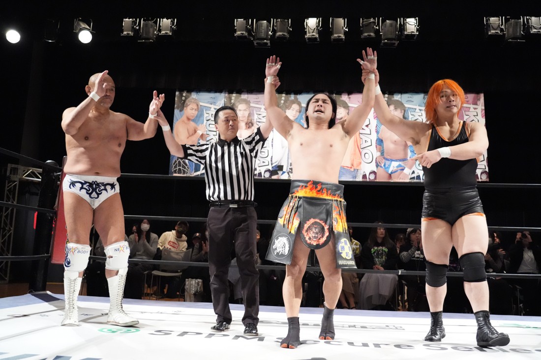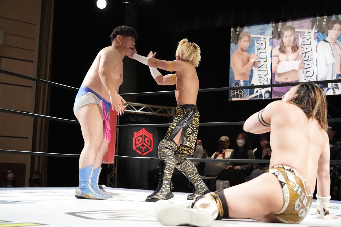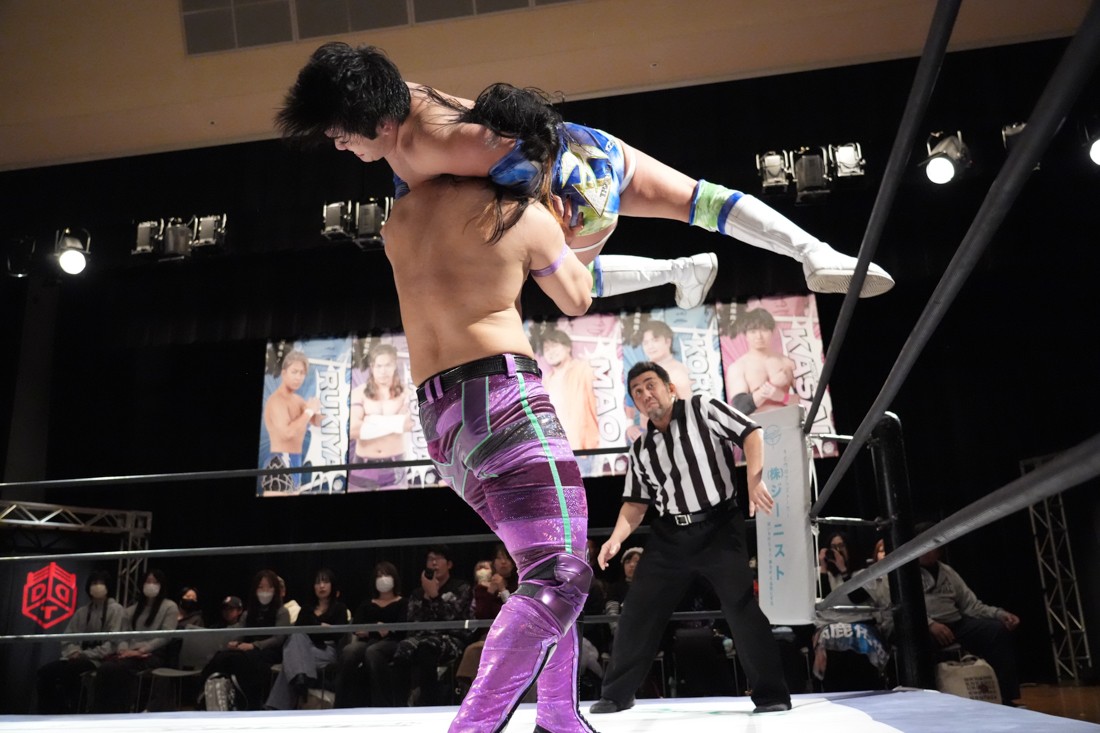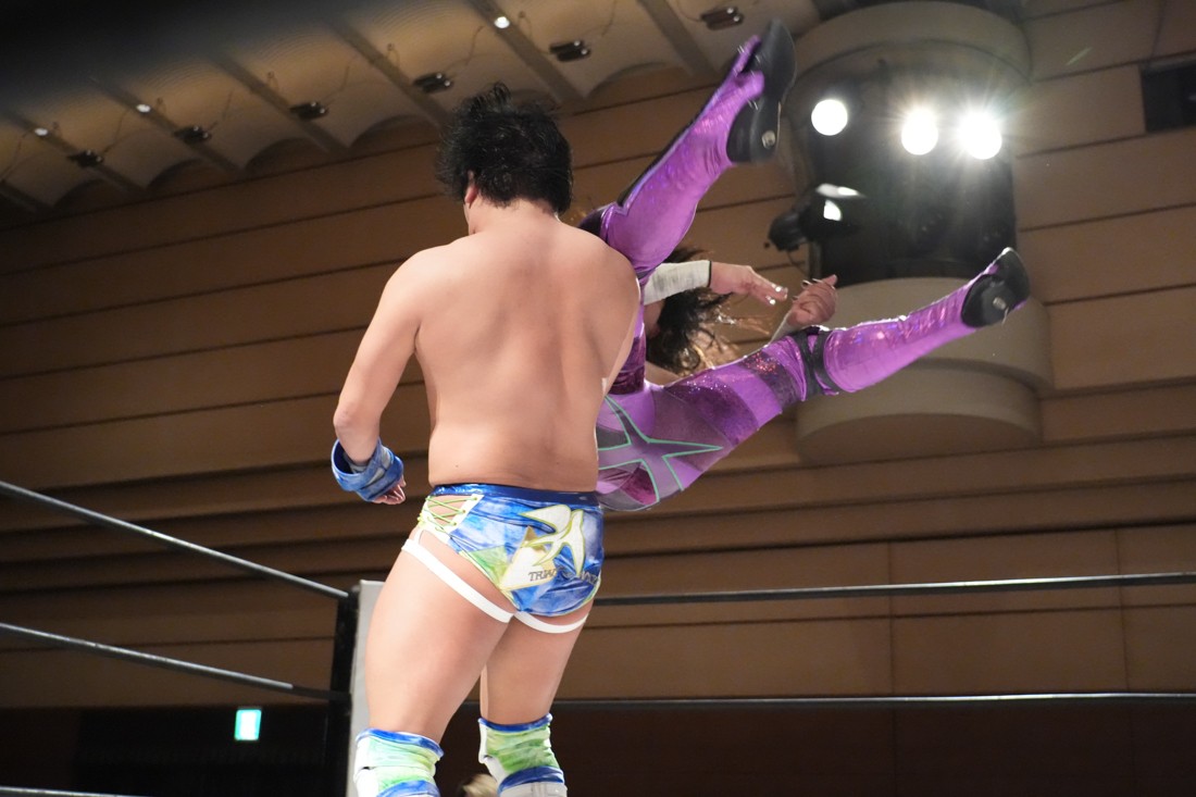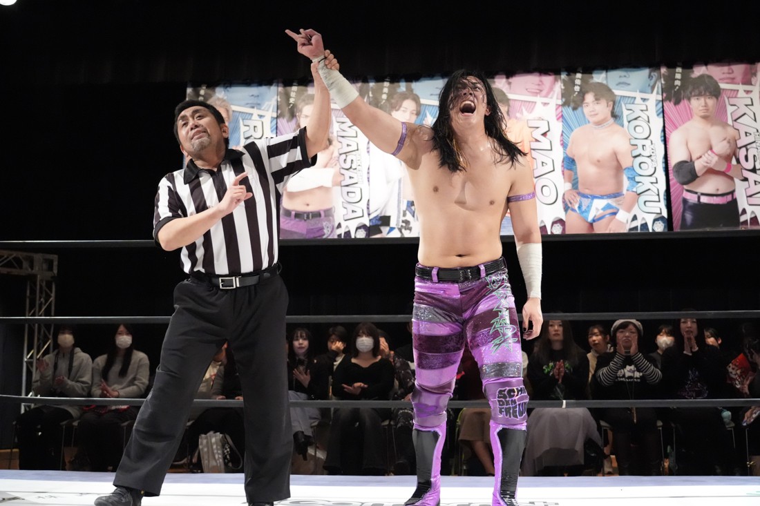 そのまま瑠希也は正田と対戦。若干ながら休憩できた正田は蹴りで応戦。瑠希也は高鹿から勝利した勢いそのままにエルボーを連打。さらにランニングエルボー、そして必殺のプロトボムで叩き付けたが、その直後、正田が首固めで丸め込んで勝利。