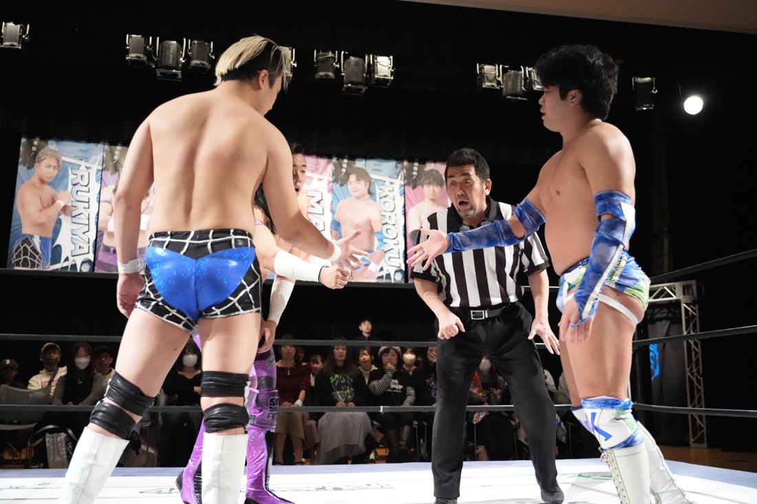 ここで彰人GM代行がリングに上がり、Bブロック代表者決定戦はじゃんけんでも3WAYマッチでもなく、せっかくシングルのリーグ戦なのだからシングルマッチで決着をつけようということで、三者による巴戦を行い、一番早く2勝した選手がBブロック代表となることを発表。グーパーで組み合わせを決めた結果、まずは高鹿vs瑠希也に。正田戦のダメージがほとんど回復していない高鹿に対し、第1試合だった瑠希也はここぞとばかりにエルボーを連打。何度もフラフラの高鹿をなぎ倒した上で、渾身のランニングエルボーを叩き込んで瑠希也が勝利。