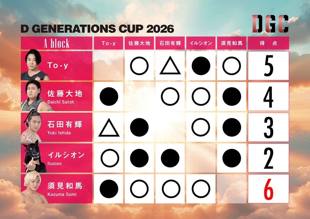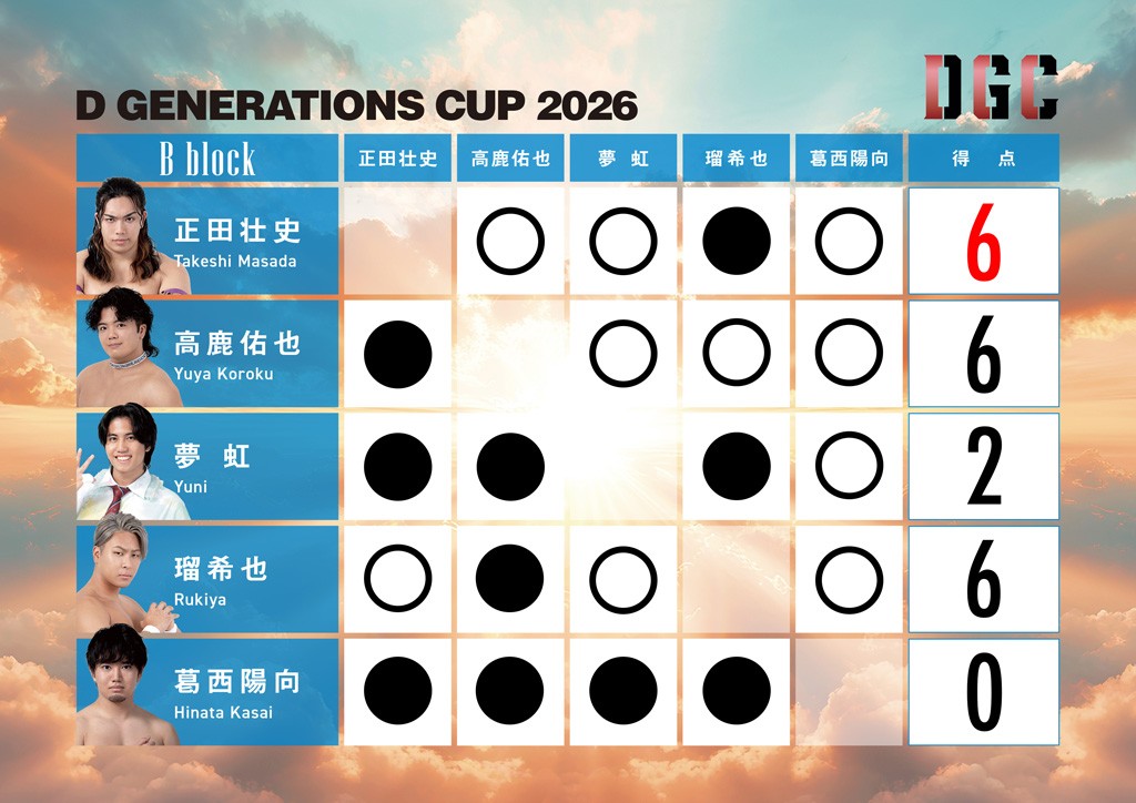 新世代No.1決定リーグ戦「D GENERATIONS CUP 2026」Bブロック最終公式戦! 陽向に勝った瑠希也、高鹿に勝った正田、さらに高鹿までが同点・同条件で並び代表決定巴戦が緊急決定! 過酷な巴戦を制した正田がBブロック代表に! Aブロック代表の須見は同期ながら先頭を走る正田を超えると宣言!