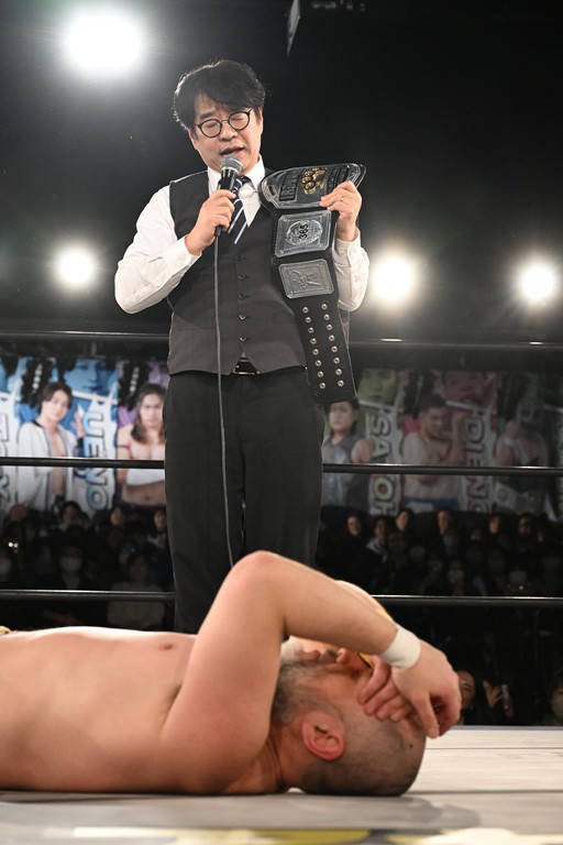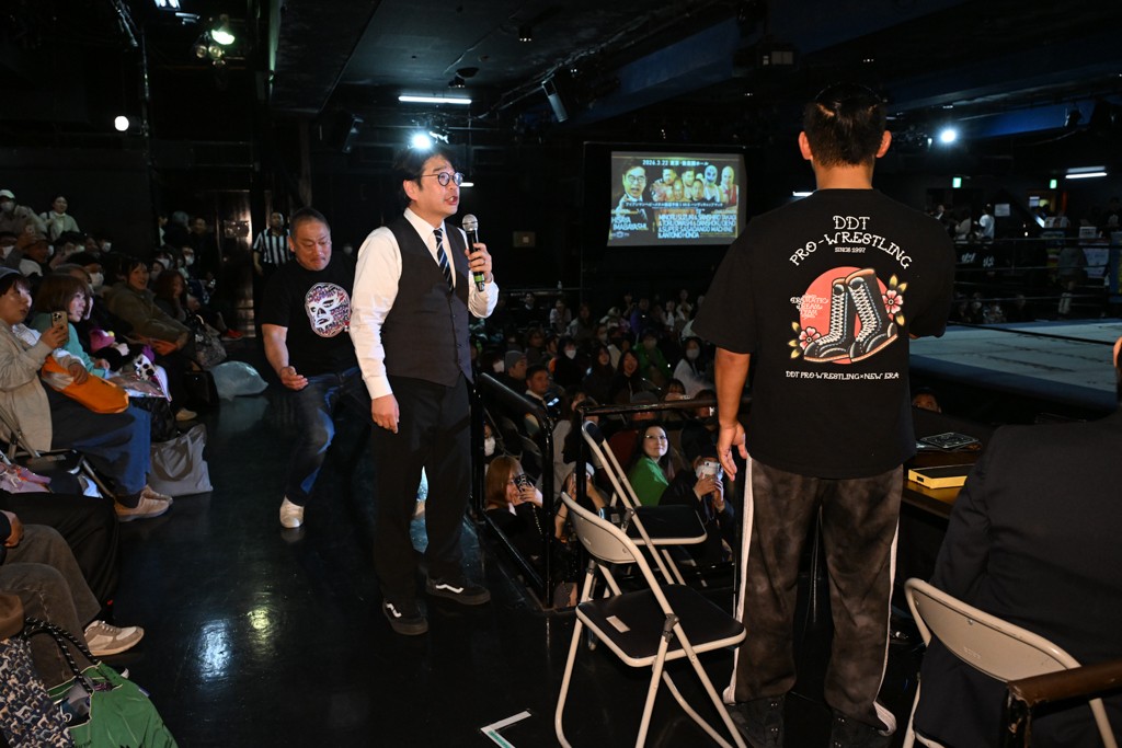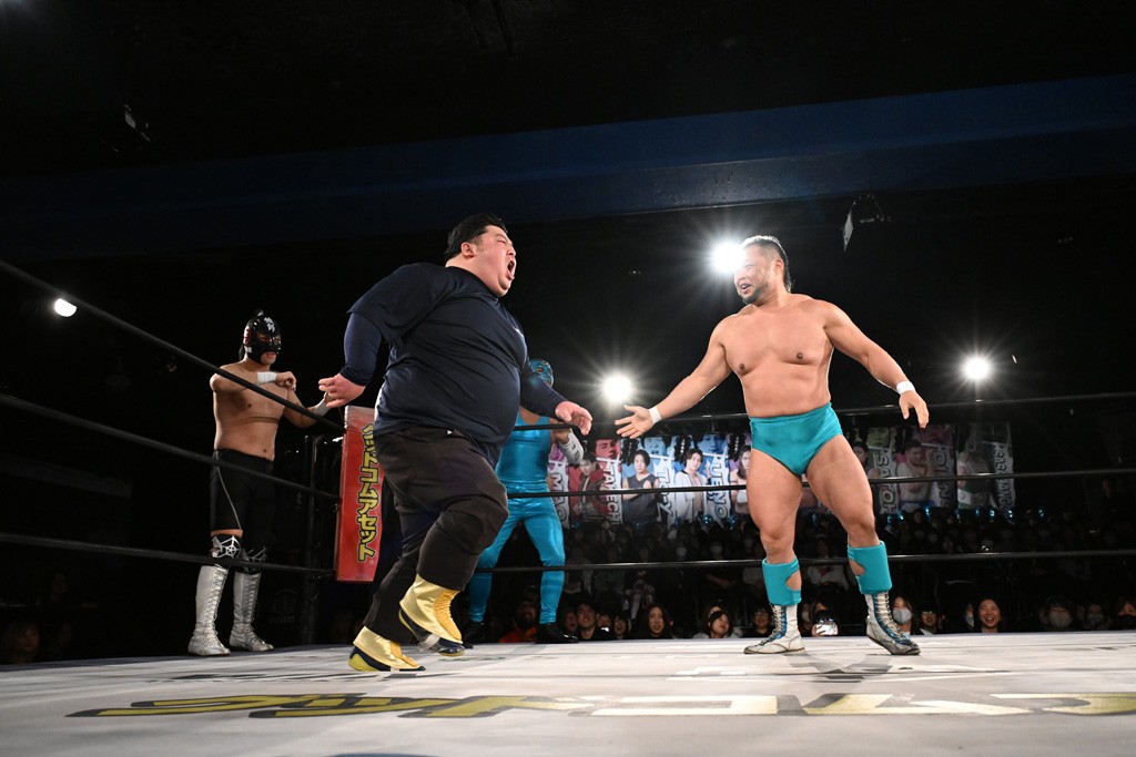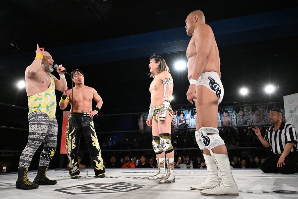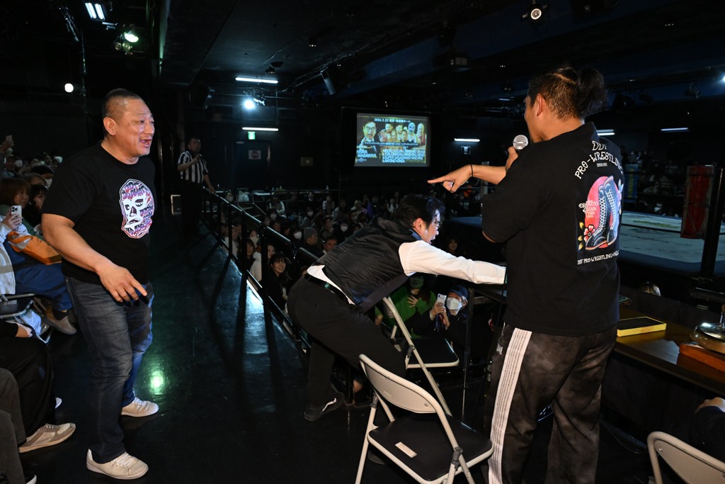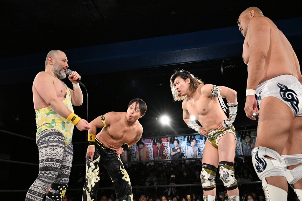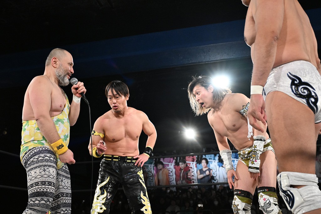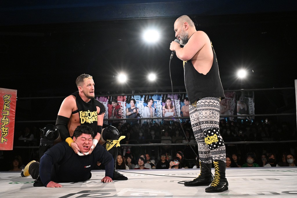 3・22後楽園大会の全カード発表が行われるも、アイアンマン王座防衛戦が勝手に組まれていた今林GMが彰人にブチギレ! 髙木がアイアンマンを狙い奇襲も、彰人のカットで今林GMは命拾い!
