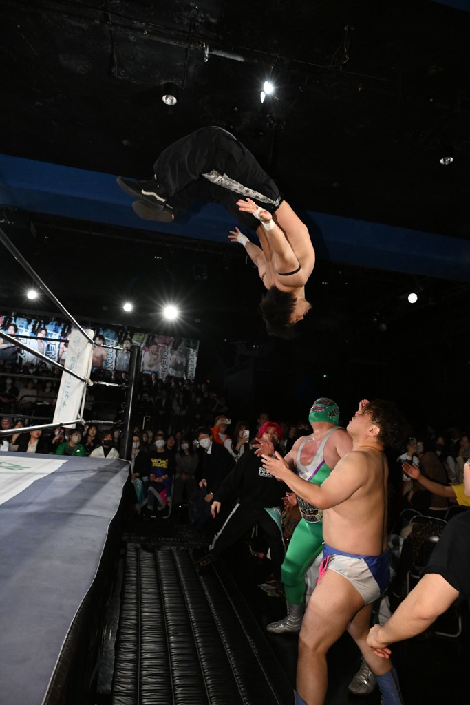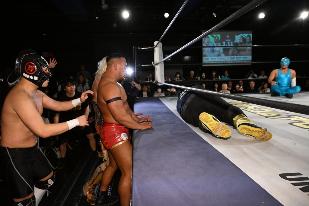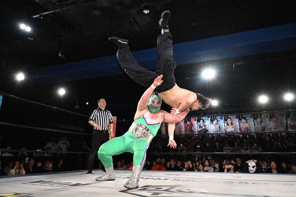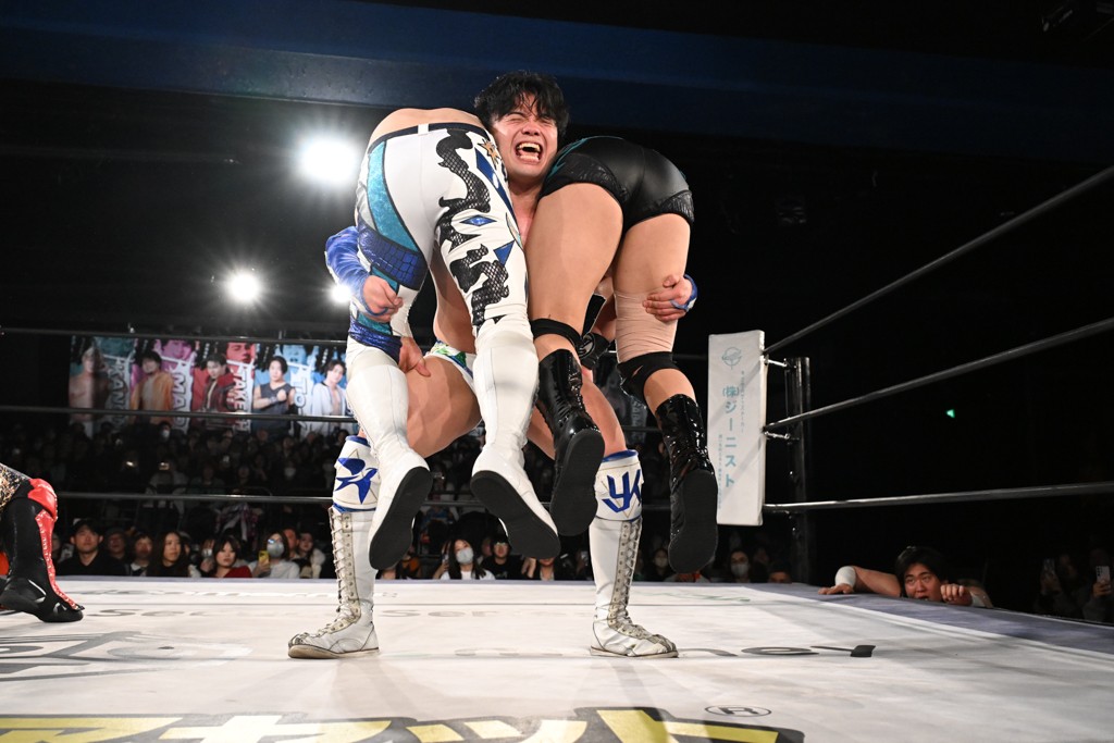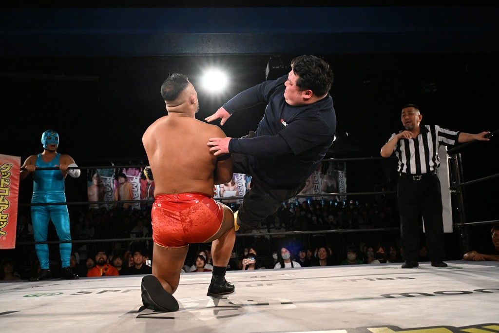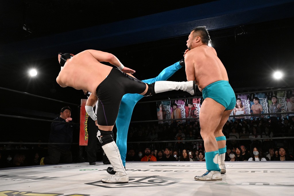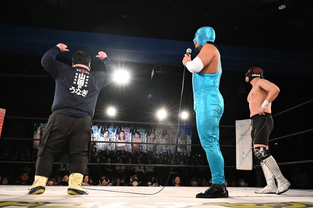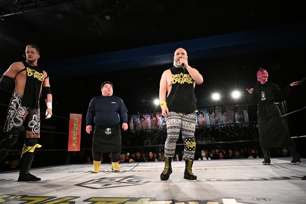 3・22後楽園大会の全カード発表が行われるも、アイアンマン王座防衛戦が勝手に組まれていた今林GMが彰人にブチギレ! 髙木がアイアンマンを狙い奇襲も、彰人のカットで今林GMは命拾い!