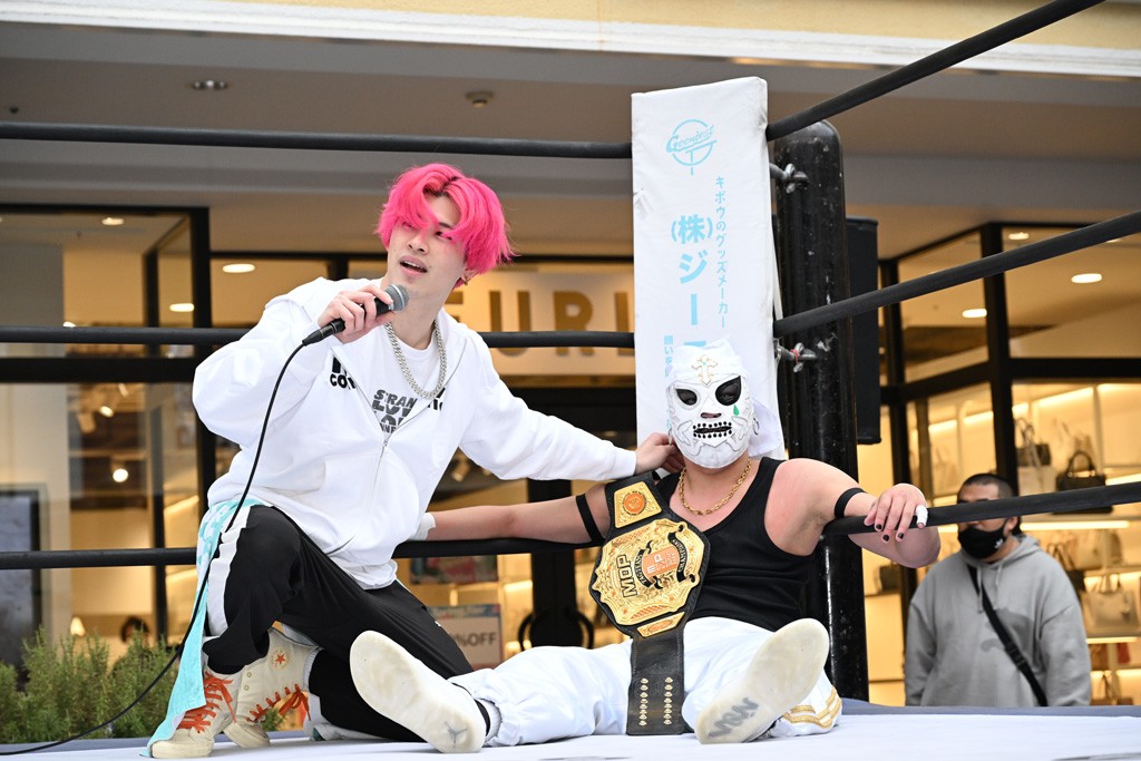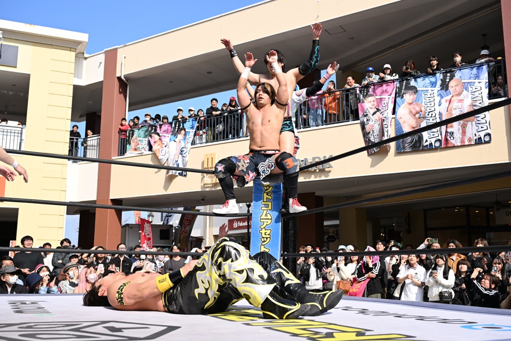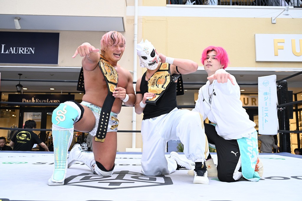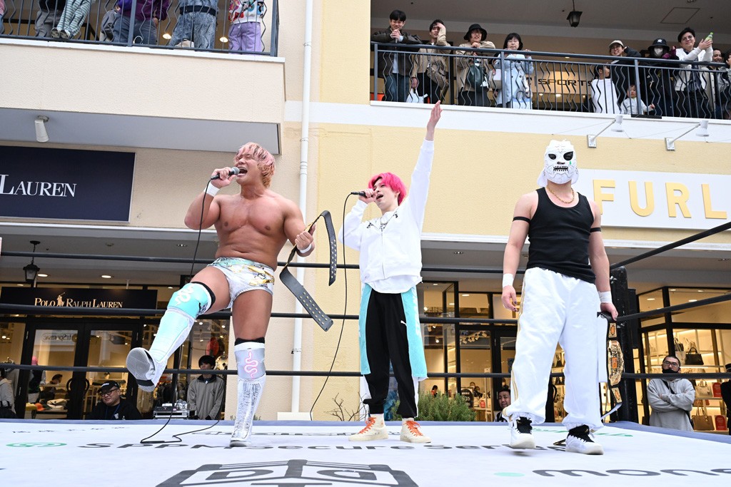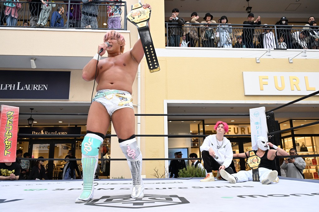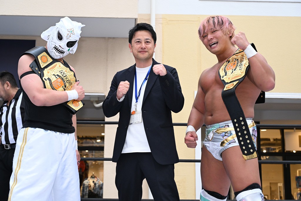 2人がベルトを受け取ると、KANONがマイク。KANONは「オッケー! 初代MOPタッグ王者になりましたー(会場拍手)! ビエント、来日して初めてのベルト奪取です! おめでとう! 彼の気持ちを聞いてみたいので、KIMIちゃん通訳をお願いします!」と言うと、マリグノはKIMIHIROの通訳で「ここ日本に来てベルトが獲れて嬉しい。全員タイトルホルダー、目指してこう」と力強いコメント。するとKANONは「去年STRANGE LOVE CONNECTION出来たばかりですけど、勢いに乗ってるんでこれからも頑張っていきたいと思います。そして、このMOPのベルトはこの後も4月、神戸と富山(小矢部)でもちろん防衛戦あります! このベルトを死守して、KANONとビエントがどんどんこのベルトの価値を高めて、いつか、三井アウトレットパークのCMに出たい!(会場拍手&笑い)夢は大きく持ちましょう! 今日は日曜日のこんな昼間に……(場内ざわつく)土曜日の! こんな昼間にこんなにたくさんの人が見てくれました。ありがとうございます! 僕たちDDTプロレスは、普段、東京、そして全国津々浦々、試合してますが、是非今日初めてプロレス見た方、初めてDDT見た方、もし興味あったら会場まで足をお運びください! 皆さんの応援がパワーになってます! ヤバい、ちょっと頭が回らなくなってきたので、締めたいと思います! このあとも三井アウトレットパークでお買い物をお楽しみください! 今日はありがとうございました!」と大会を締めくくった。なお、「DDT×MOP Wrestle Tour 2026 in 三井アウトレットパーク」としては4月11日三井アウトレットパーク マリンピア神戸大会、4月12日三井アウトレットパーク 北陸小矢部大会(両大会共に観戦無料)が予定されている。お近くの方はぜひ会場に足をお運びください。