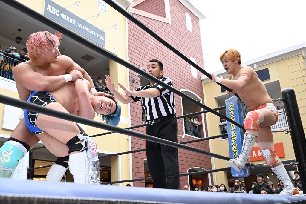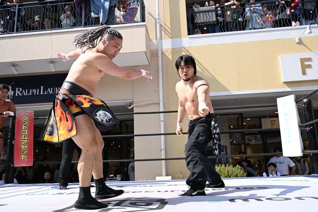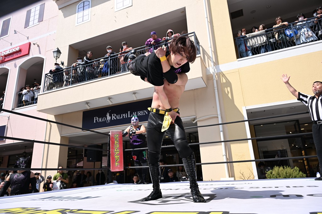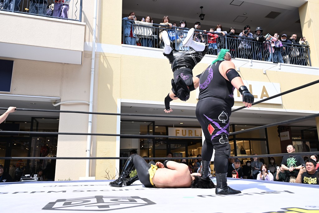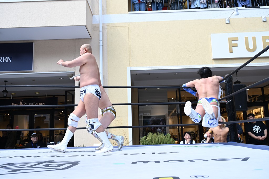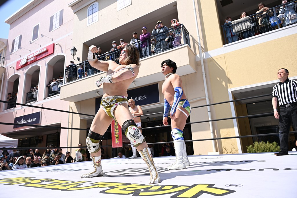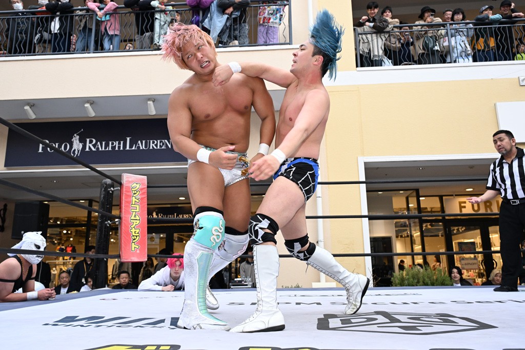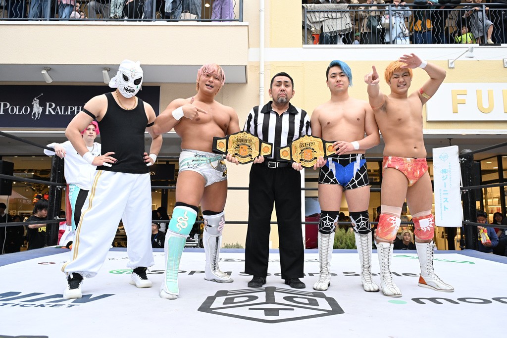 3月28日「DDT×MOP Wrestle Tour 2026 in 三井アウトレットパーク 多摩南大沢」東京・三井アウトレットパーク 多摩南大沢大会が開催。DDTと三井アウトレットパークがタッグを組んで行われたコラボレーション大会。朝早くから沢山のお客さんが駆け付け大盛況となった。メインにはこのコラボ大会のために新設されたMOPタッグ王座の初代王者を決める一戦、KANON&ビエント・マリグノ with KIMIHIROvs宮脇純太&瑠希也がラインナップされた。ゴングが鳴るとまずはマリグノと宮脇が一進一退のルチャの攻防。続いてKANONと瑠希也に代わると、瑠希也がKANONに真っ向勝負を挑むが次第に劣勢に陥ってしまう。これを耐えた瑠希也が逆転に成功し宮脇にタッチを繋ぐと、宮脇は三角飛びプランチャを決め一気にペースを引き戻す。宮脇が瑠希也に試合を託すと、瑠希也はエルボーで果敢に攻め込み、得意のプロトボムも決めて見せる。さらに丸め込みであわや3カウント、という場面を何度も作るがKANONがクリア。KANONがブレーンバスターからスリーピー・ホロウを決めて勝利を確信するも、瑠希也はこれをカウント2でクリア。KANONのショートレンジ・ラリアットもカウント2で返すなど、驚異的な粘りを見せる瑠希也。しかしそんな瑠希也の思いを断ち切るように、KANONがラリアットをぶち込むと、瑠希也も返せず3カウント。KANON&マリグノが初代MOPタッグ王者に輝いた。