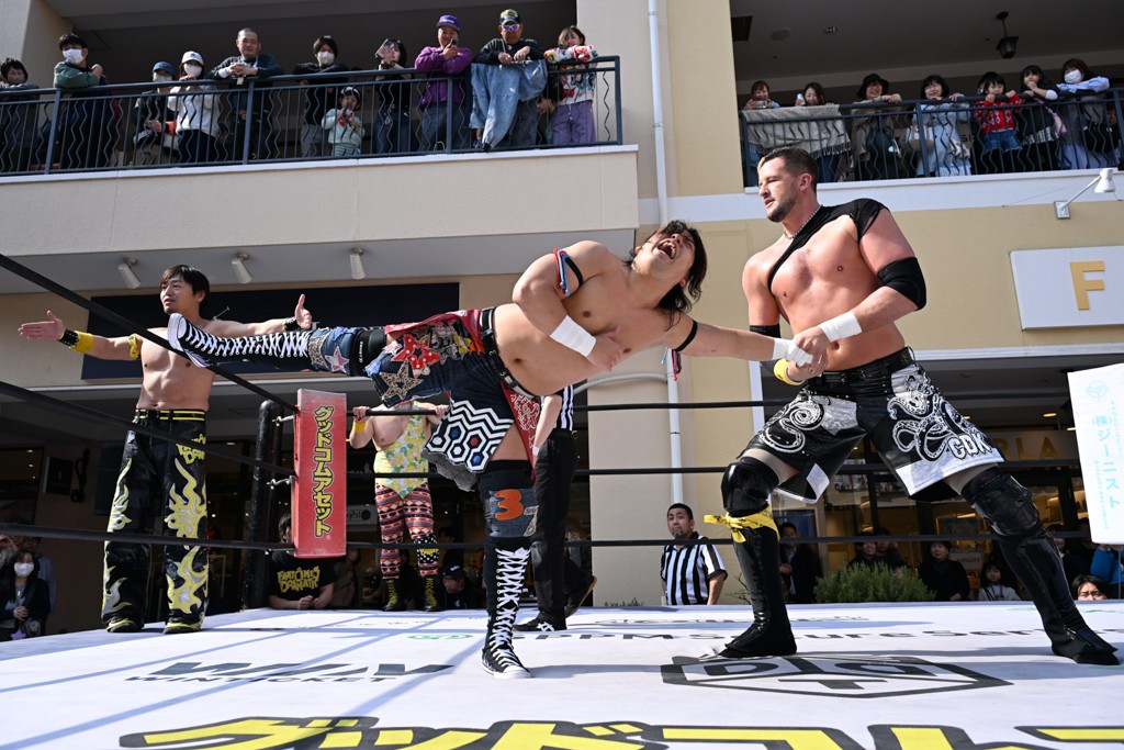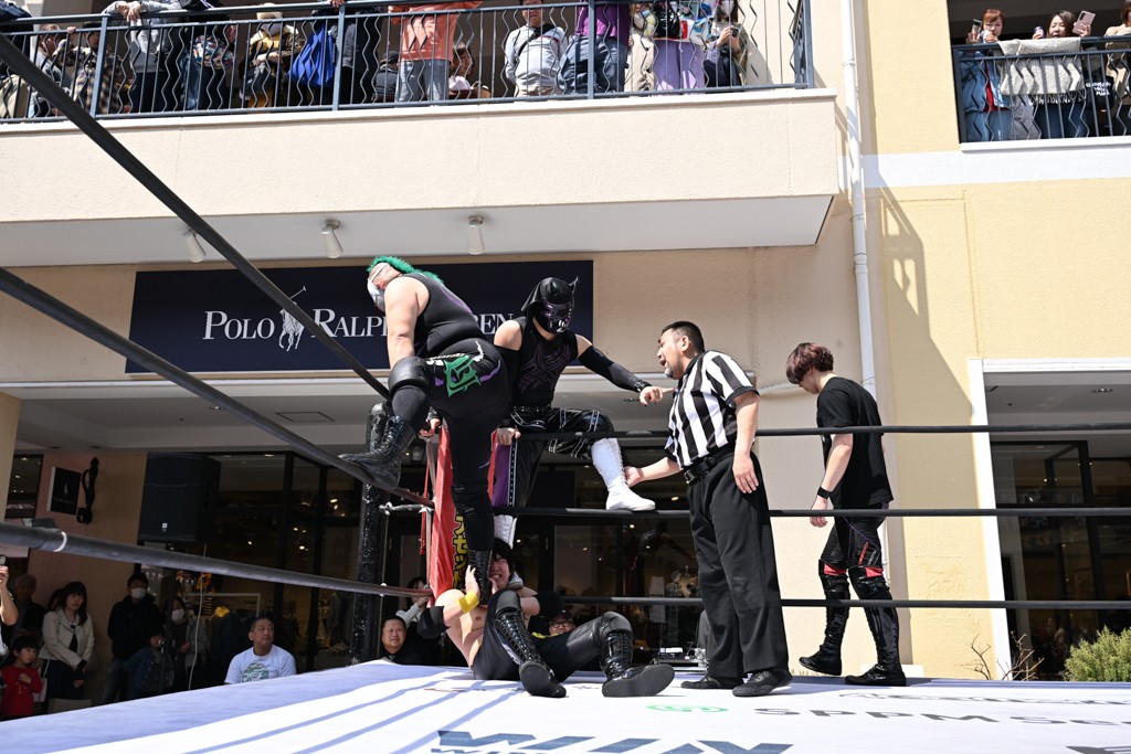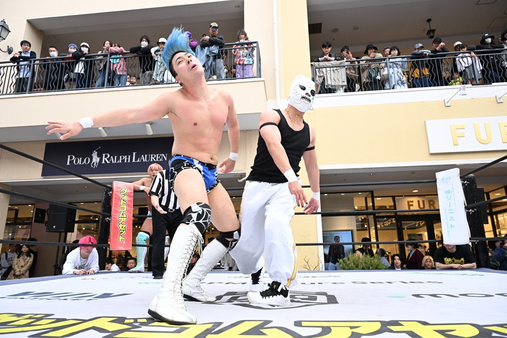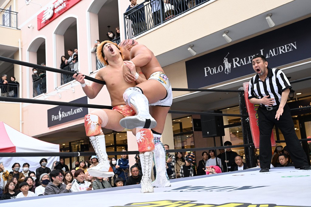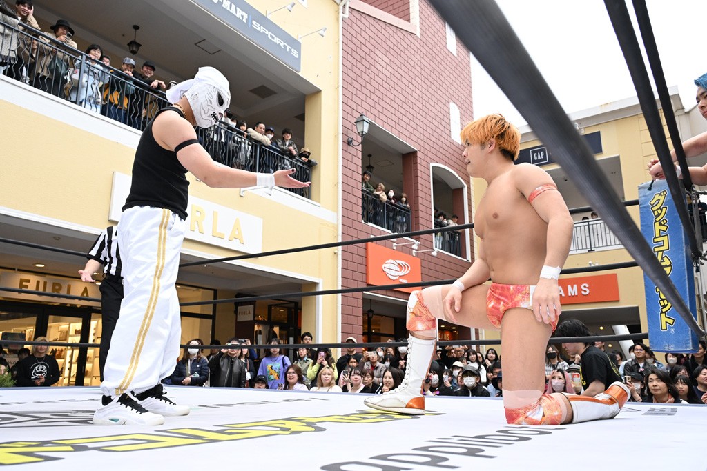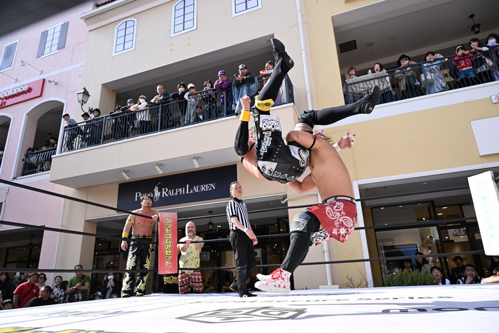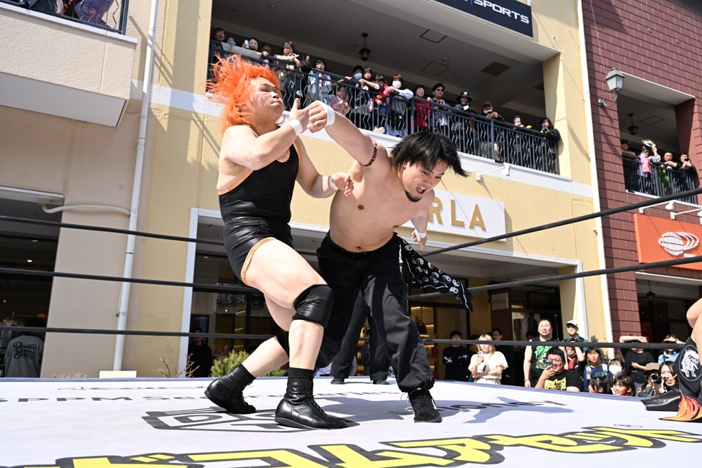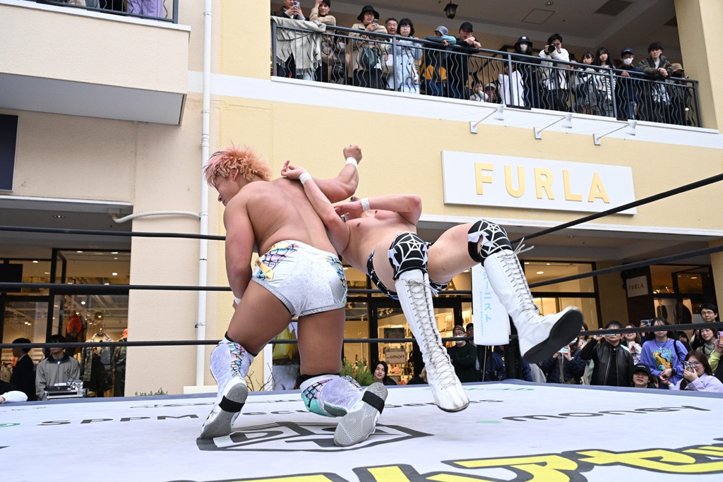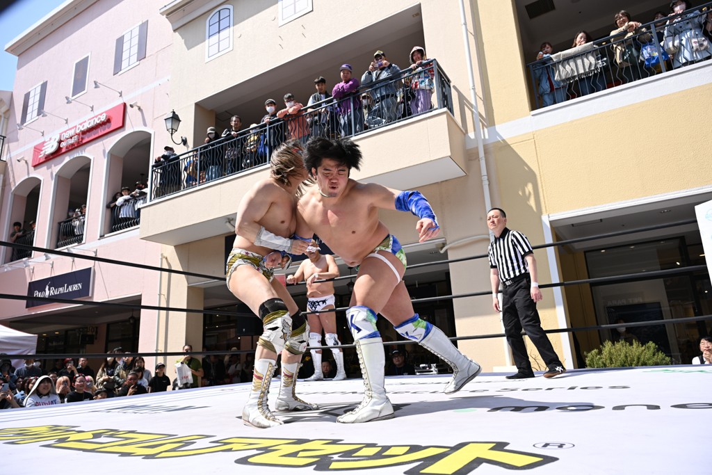 3月28日「DDT×MOP Wrestle Tour 2026 in 三井アウトレットパーク 多摩南大沢」東京・三井アウトレットパーク 多摩南大沢大会が開催。DDTと三井アウトレットパークがタッグを組んで行われたコラボレーション大会。朝早くから沢山のお客さんが駆け付け大盛況となった。メインにはこのコラボ大会のために新設されたMOPタッグ王座の初代王者を決める一戦、KANON&ビエント・マリグノ with KIMIHIROvs宮脇純太&瑠希也がラインナップされた。ゴングが鳴るとまずはマリグノと宮脇が一進一退のルチャの攻防。続いてKANONと瑠希也に代わると、瑠希也がKANONに真っ向勝負を挑むが次第に劣勢に陥ってしまう。これを耐えた瑠希也が逆転に成功し宮脇にタッチを繋ぐと、宮脇は三角飛びプランチャを決め一気にペースを引き戻す。宮脇が瑠希也に試合を託すと、瑠希也はエルボーで果敢に攻め込み、得意のプロトボムも決めて見せる。さらに丸め込みであわや3カウント、という場面を何度も作るがKANONがクリア。KANONがブレーンバスターからスリーピー・ホロウを決めて勝利を確信するも、瑠希也はこれをカウント2でクリア。KANONのショートレンジ・ラリアットもカウント2で返すなど、驚異的な粘りを見せる瑠希也。しかしそんな瑠希也の思いを断ち切るように、KANONがラリアットをぶち込むと、瑠希也も返せず3カウント。KANON&マリグノが初代MOPタッグ王者に輝いた。