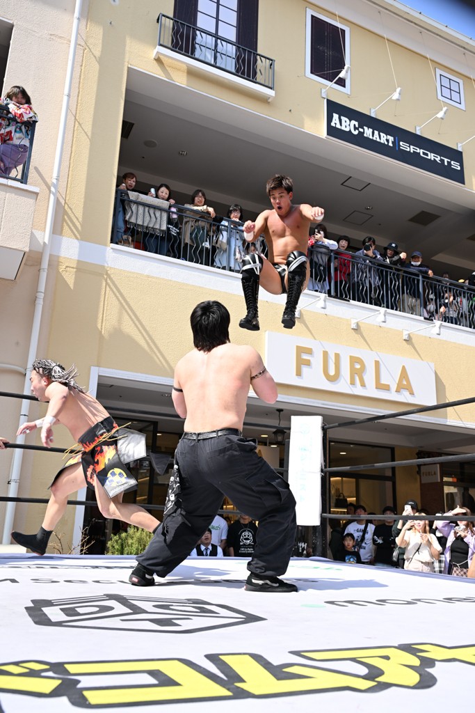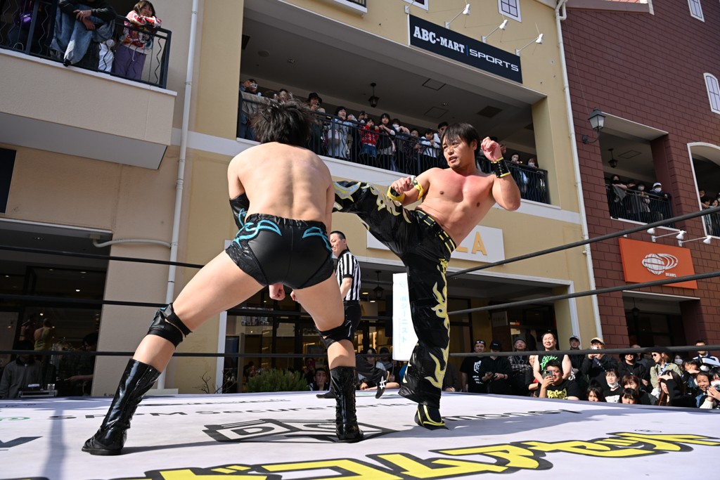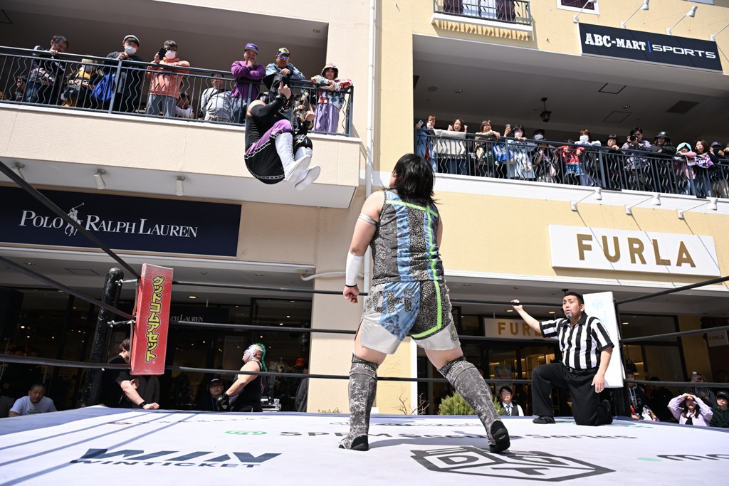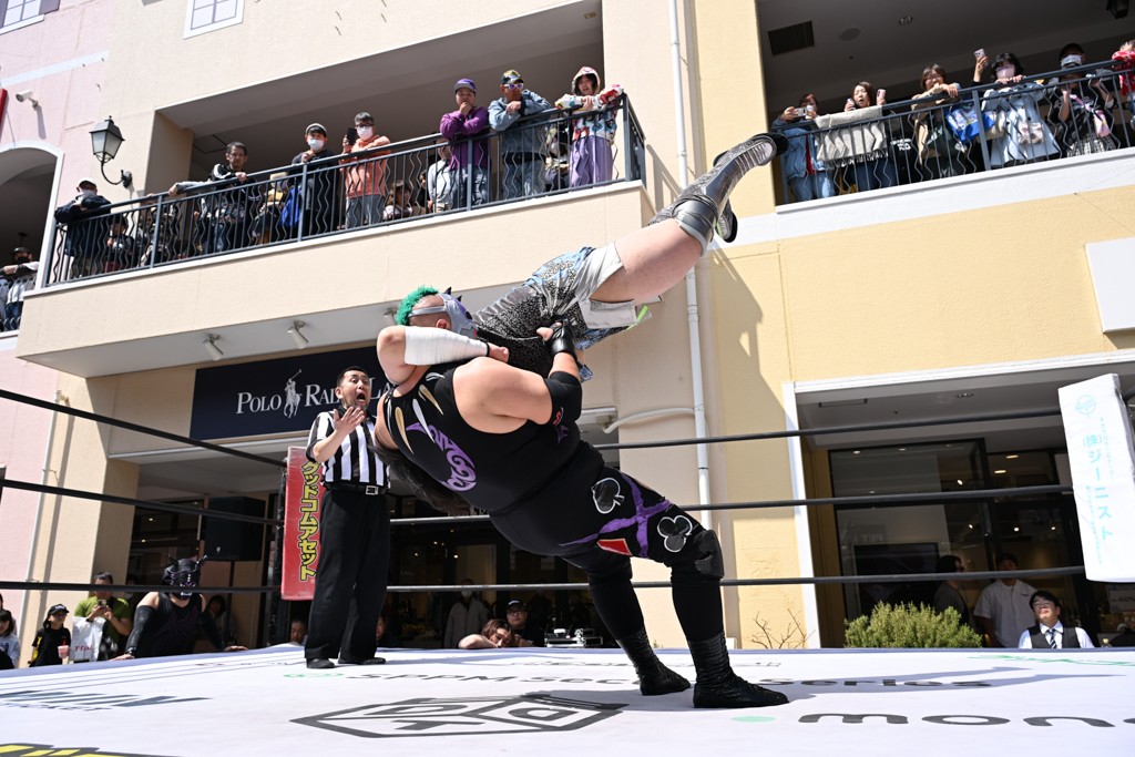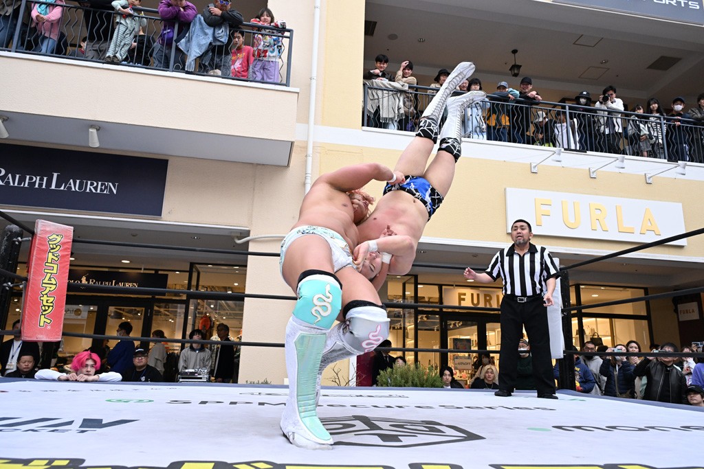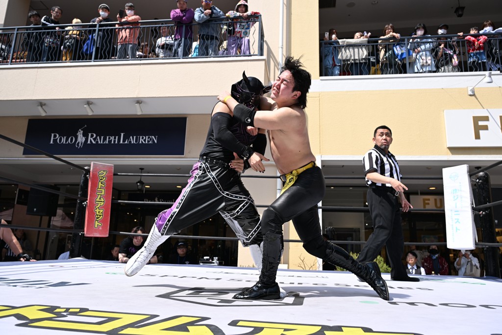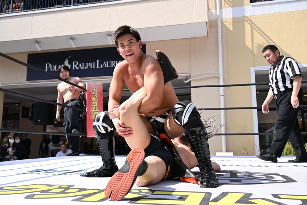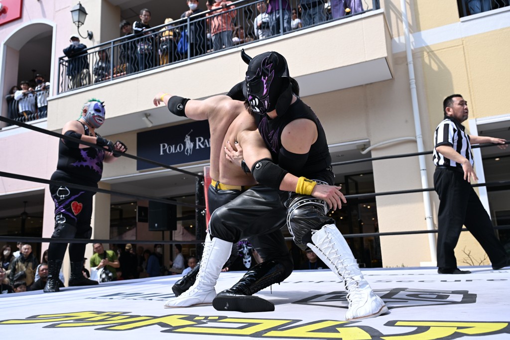 3月28日「DDT×MOP Wrestle Tour 2026 in 三井アウトレットパーク 多摩南大沢」東京・三井アウトレットパーク 多摩南大沢大会が開催。DDTと三井アウトレットパークがタッグを組んで行われたコラボレーション大会。朝早くから沢山のお客さんが駆け付け大盛況となった。メインにはこのコラボ大会のために新設されたMOPタッグ王座の初代王者を決める一戦、KANON&ビエント・マリグノ with KIMIHIROvs宮脇純太&瑠希也がラインナップされた。ゴングが鳴るとまずはマリグノと宮脇が一進一退のルチャの攻防。続いてKANONと瑠希也に代わると、瑠希也がKANONに真っ向勝負を挑むが次第に劣勢に陥ってしまう。これを耐えた瑠希也が逆転に成功し宮脇にタッチを繋ぐと、宮脇は三角飛びプランチャを決め一気にペースを引き戻す。宮脇が瑠希也に試合を託すと、瑠希也はエルボーで果敢に攻め込み、得意のプロトボムも決めて見せる。さらに丸め込みであわや3カウント、という場面を何度も作るがKANONがクリア。KANONがブレーンバスターからスリーピー・ホロウを決めて勝利を確信するも、瑠希也はこれをカウント2でクリア。KANONのショートレンジ・ラリアットもカウント2で返すなど、驚異的な粘りを見せる瑠希也。しかしそんな瑠希也の思いを断ち切るように、KANONがラリアットをぶち込むと、瑠希也も返せず3カウント。KANON&マリグノが初代MOPタッグ王者に輝いた。
