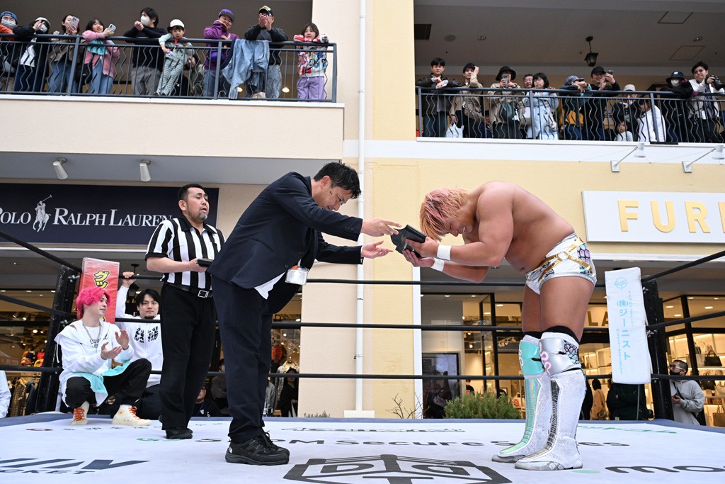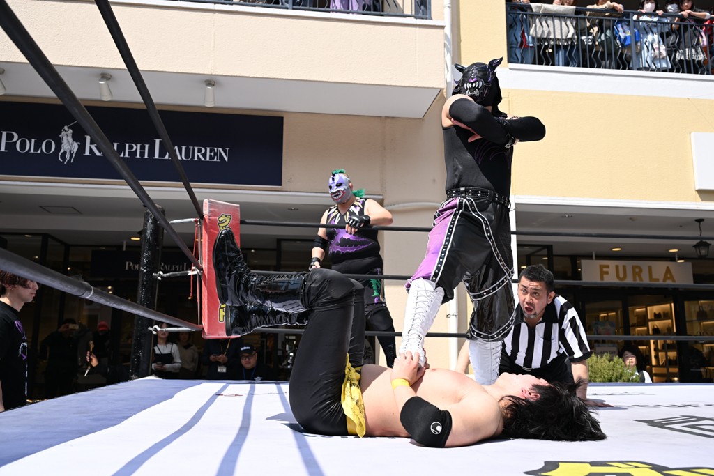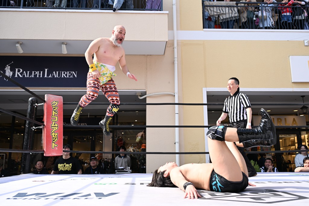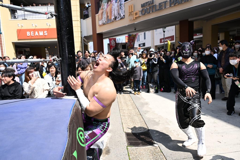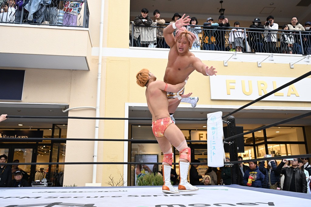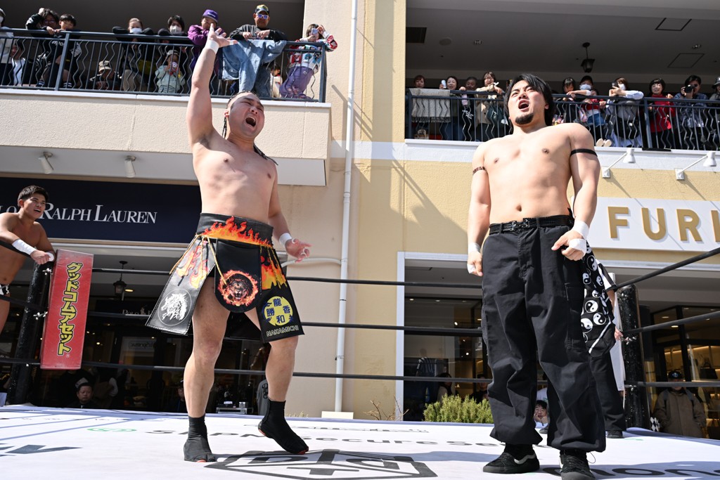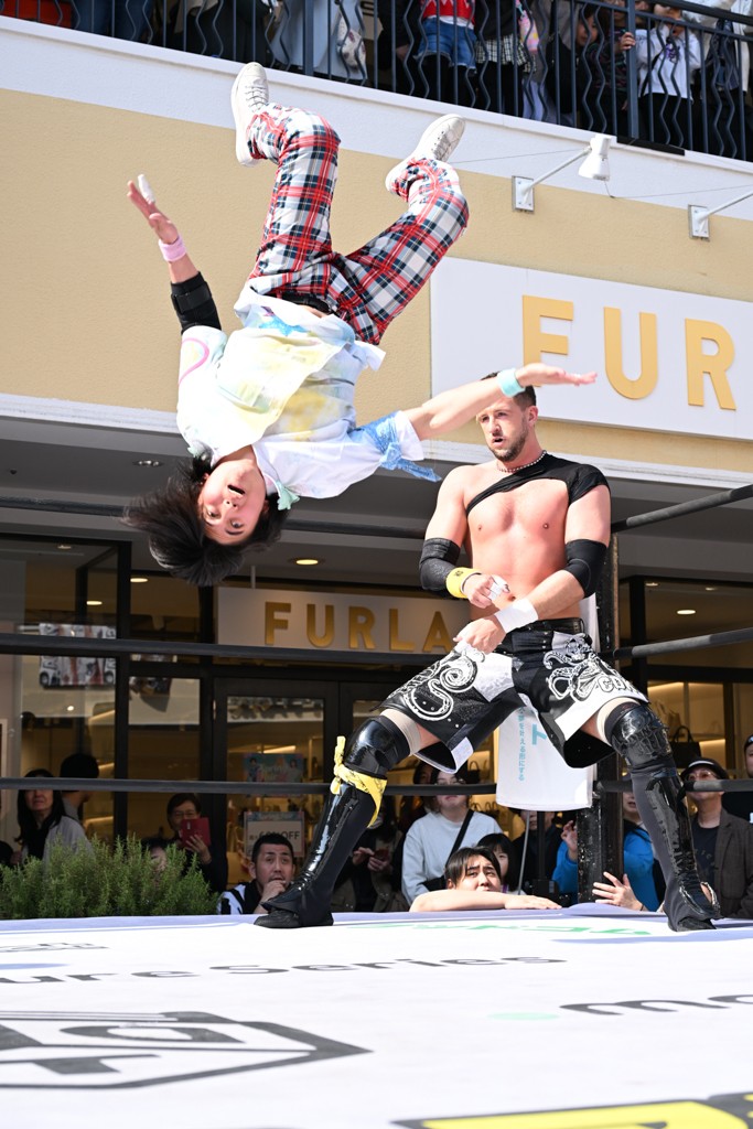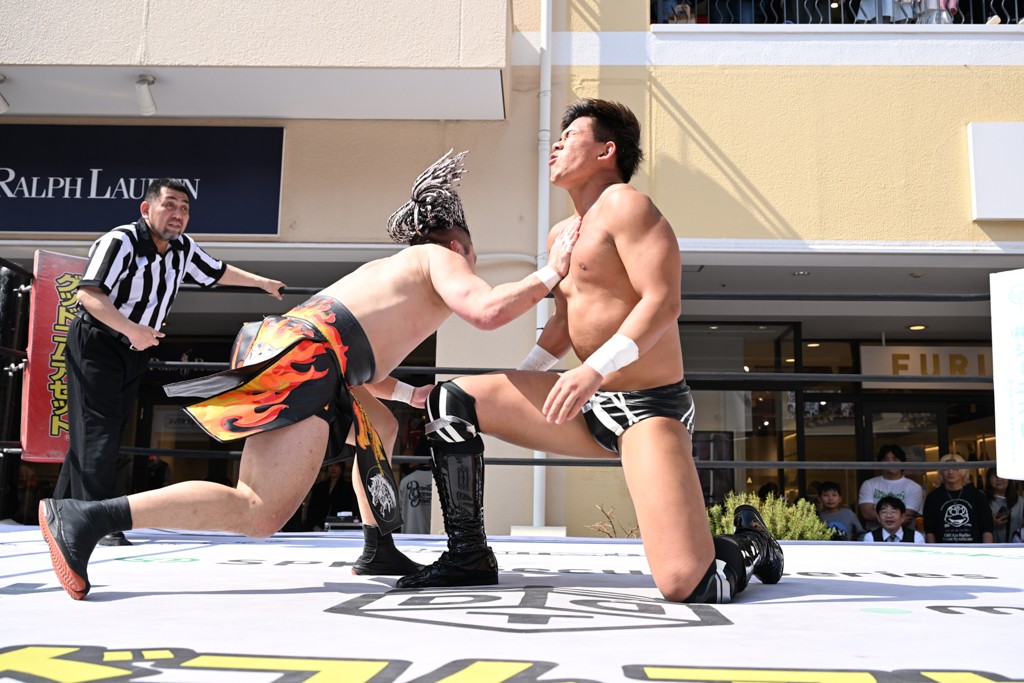 3月28日「DDT×MOP Wrestle Tour 2026 in 三井アウトレットパーク 多摩南大沢」東京・三井アウトレットパーク 多摩南大沢大会が開催。DDTと三井アウトレットパークがタッグを組んで行われたコラボレーション大会。朝早くから沢山のお客さんが駆け付け大盛況となった。メインにはこのコラボ大会のために新設されたMOPタッグ王座の初代王者を決める一戦、KANON&ビエント・マリグノ with KIMIHIROvs宮脇純太&瑠希也がラインナップされた。ゴングが鳴るとまずはマリグノと宮脇が一進一退のルチャの攻防。続いてKANONと瑠希也に代わると、瑠希也がKANONに真っ向勝負を挑むが次第に劣勢に陥ってしまう。これを耐えた瑠希也が逆転に成功し宮脇にタッチを繋ぐと、宮脇は三角飛びプランチャを決め一気にペースを引き戻す。宮脇が瑠希也に試合を託すと、瑠希也はエルボーで果敢に攻め込み、得意のプロトボムも決めて見せる。さらに丸め込みであわや3カウント、という場面を何度も作るがKANONがクリア。KANONがブレーンバスターからスリーピー・ホロウを決めて勝利を確信するも、瑠希也はこれをカウント2でクリア。KANONのショートレンジ・ラリアットもカウント2で返すなど、驚異的な粘りを見せる瑠希也。しかしそんな瑠希也の思いを断ち切るように、KANONがラリアットをぶち込むと、瑠希也も返せず3カウント。KANON&マリグノが初代MOPタッグ王者に輝いた。