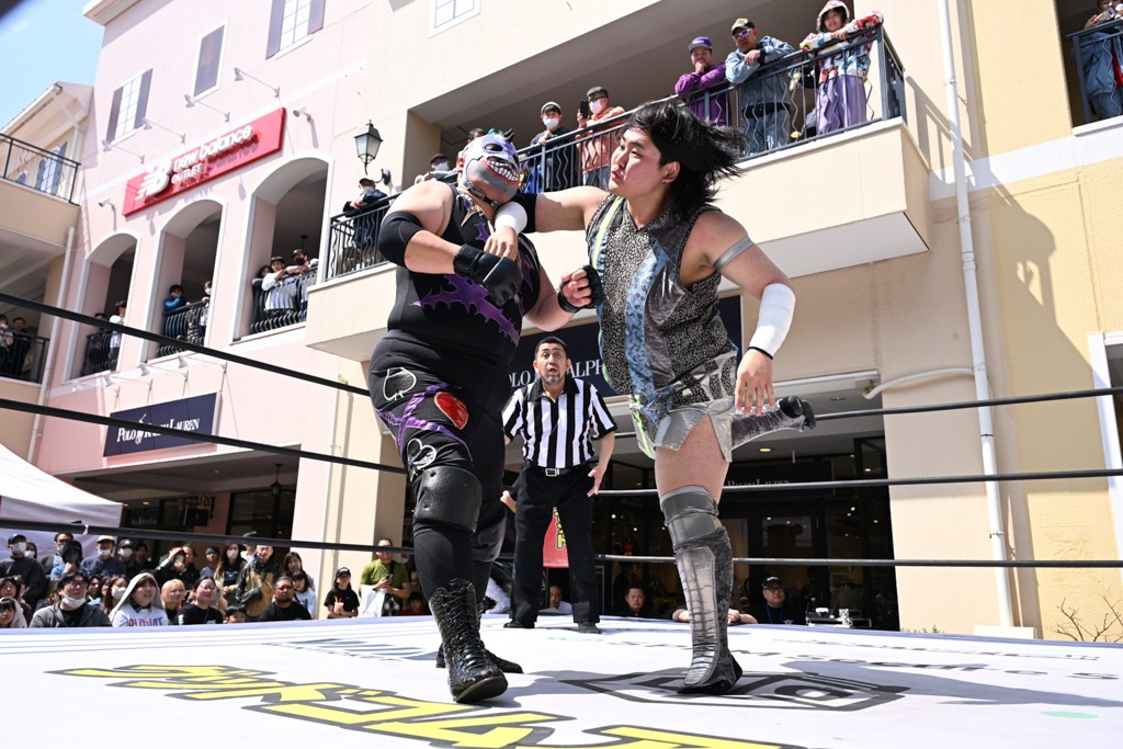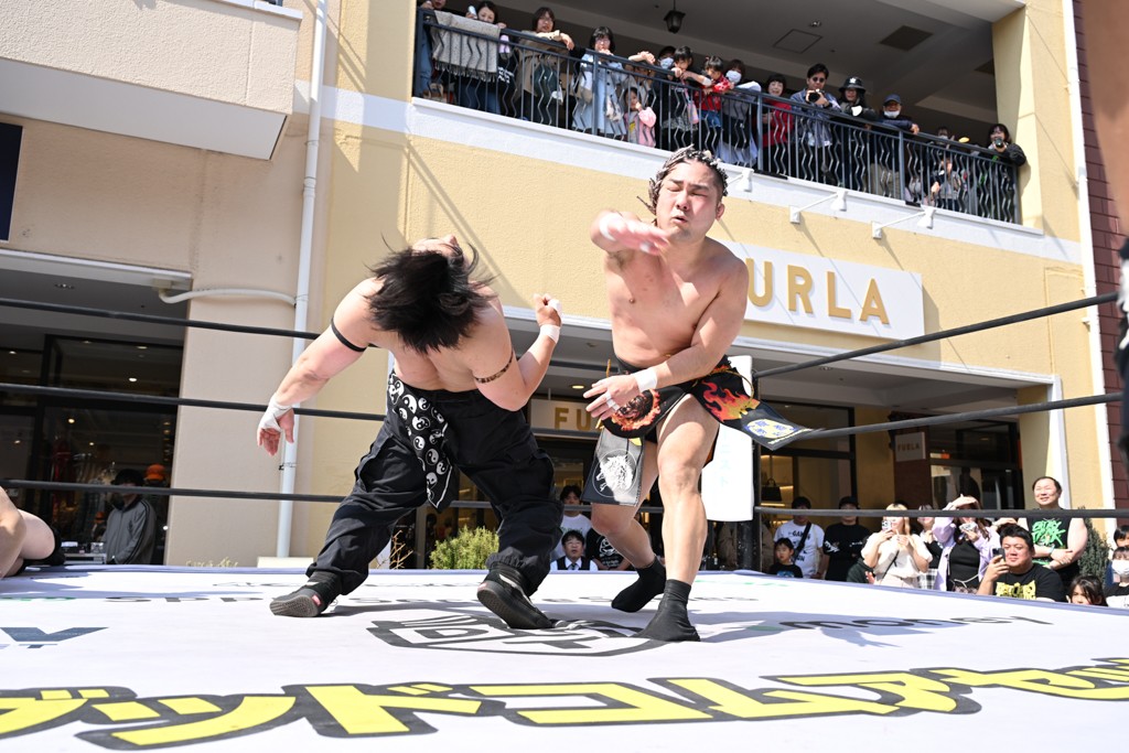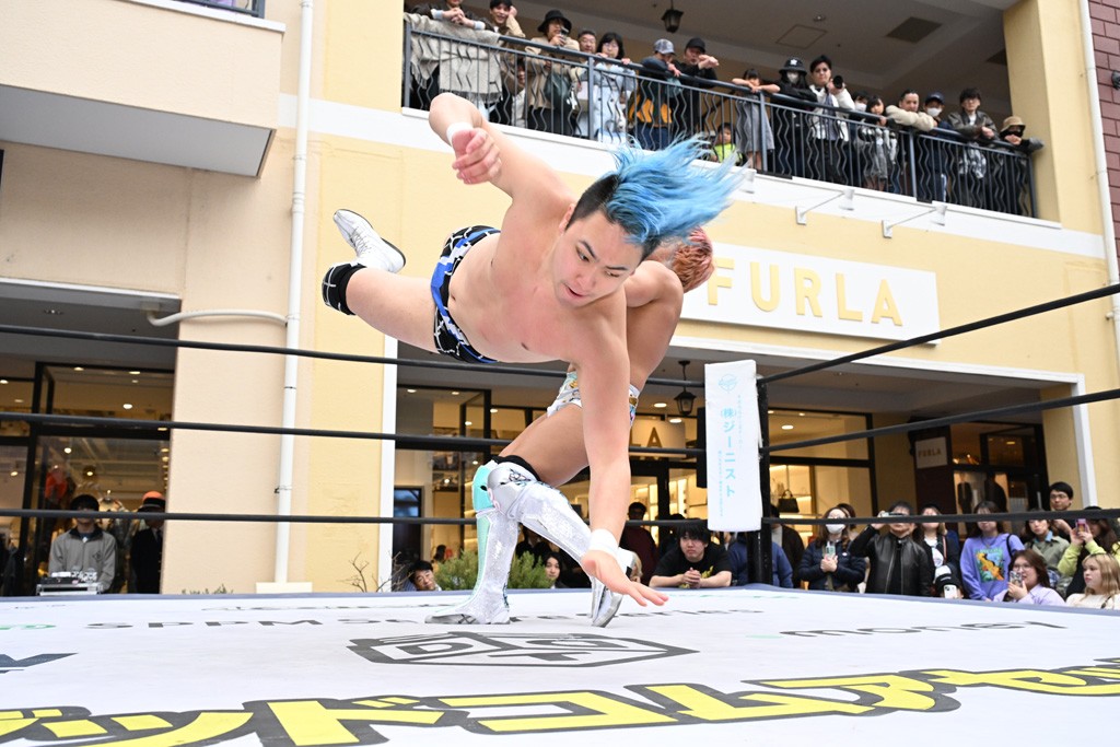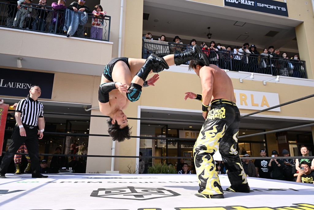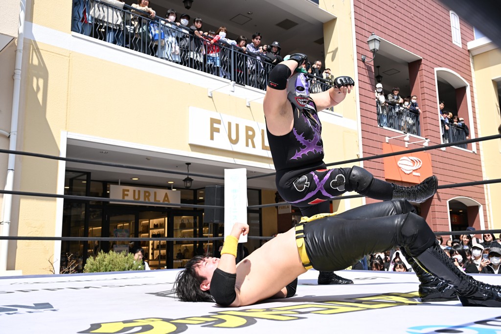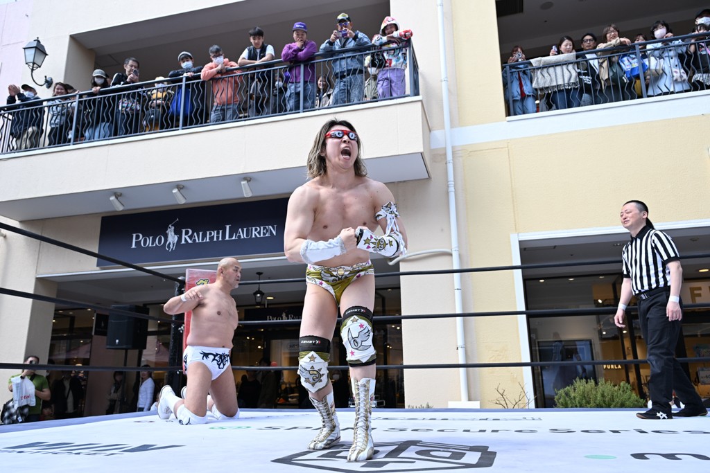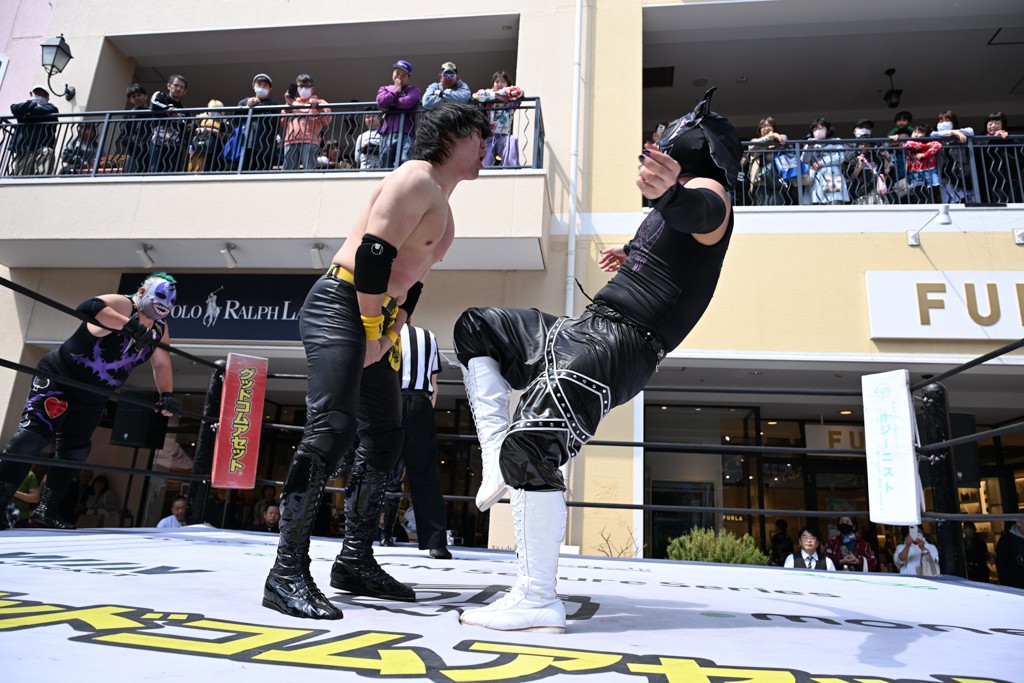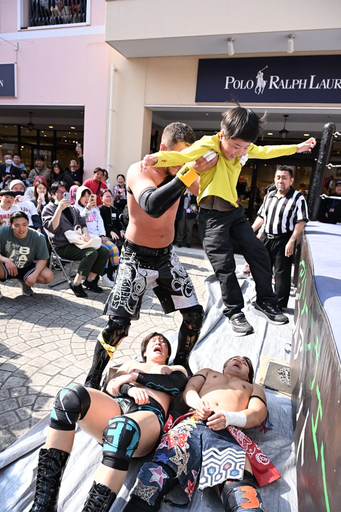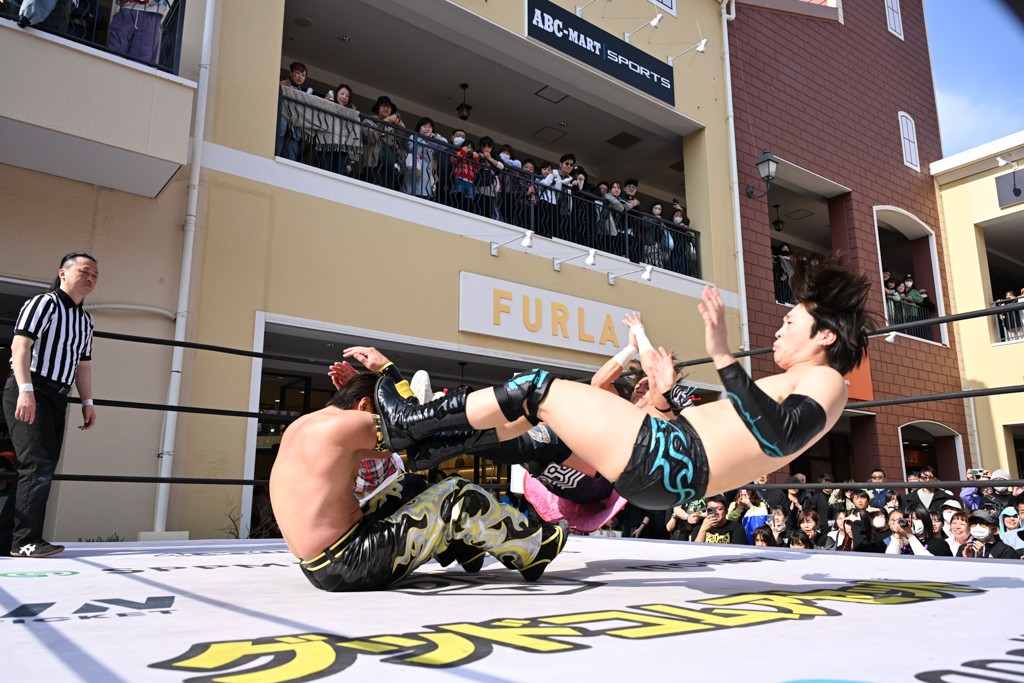 3月28日「DDT×MOP Wrestle Tour 2026 in 三井アウトレットパーク 多摩南大沢」東京・三井アウトレットパーク 多摩南大沢大会が開催。DDTと三井アウトレットパークがタッグを組んで行われたコラボレーション大会。朝早くから沢山のお客さんが駆け付け大盛況となった。メインにはこのコラボ大会のために新設されたMOPタッグ王座の初代王者を決める一戦、KANON&ビエント・マリグノ with KIMIHIROvs宮脇純太&瑠希也がラインナップされた。ゴングが鳴るとまずはマリグノと宮脇が一進一退のルチャの攻防。続いてKANONと瑠希也に代わると、瑠希也がKANONに真っ向勝負を挑むが次第に劣勢に陥ってしまう。これを耐えた瑠希也が逆転に成功し宮脇にタッチを繋ぐと、宮脇は三角飛びプランチャを決め一気にペースを引き戻す。宮脇が瑠希也に試合を託すと、瑠希也はエルボーで果敢に攻め込み、得意のプロトボムも決めて見せる。さらに丸め込みであわや3カウント、という場面を何度も作るがKANONがクリア。KANONがブレーンバスターからスリーピー・ホロウを決めて勝利を確信するも、瑠希也はこれをカウント2でクリア。KANONのショートレンジ・ラリアットもカウント2で返すなど、驚異的な粘りを見せる瑠希也。しかしそんな瑠希也の思いを断ち切るように、KANONがラリアットをぶち込むと、瑠希也も返せず3カウント。KANON&マリグノが初代MOPタッグ王者に輝いた。