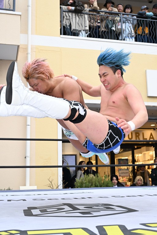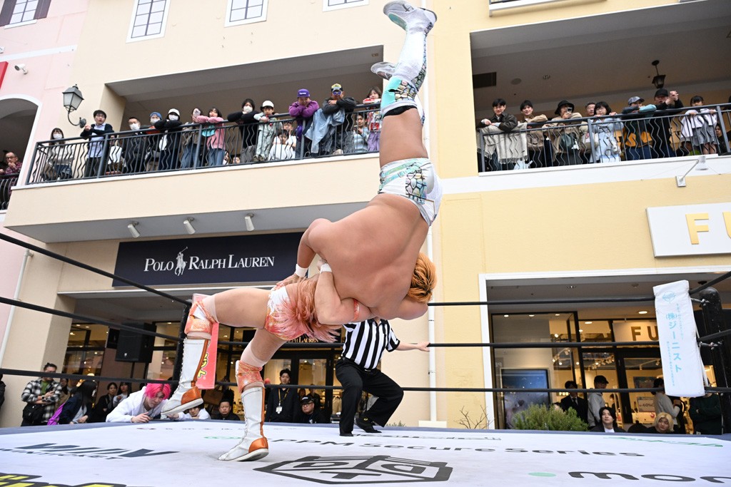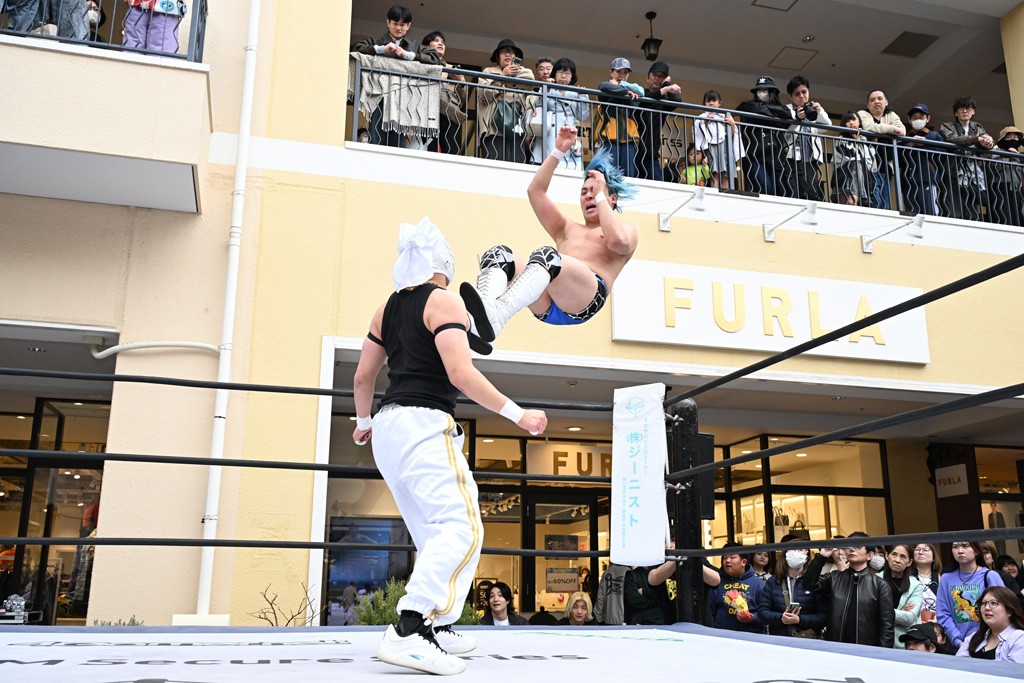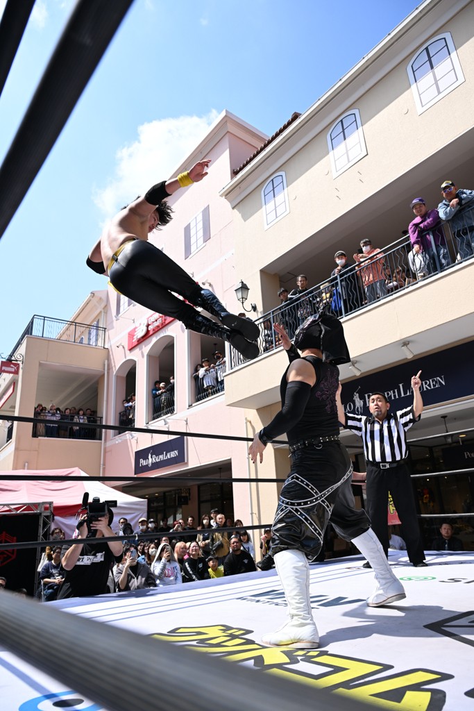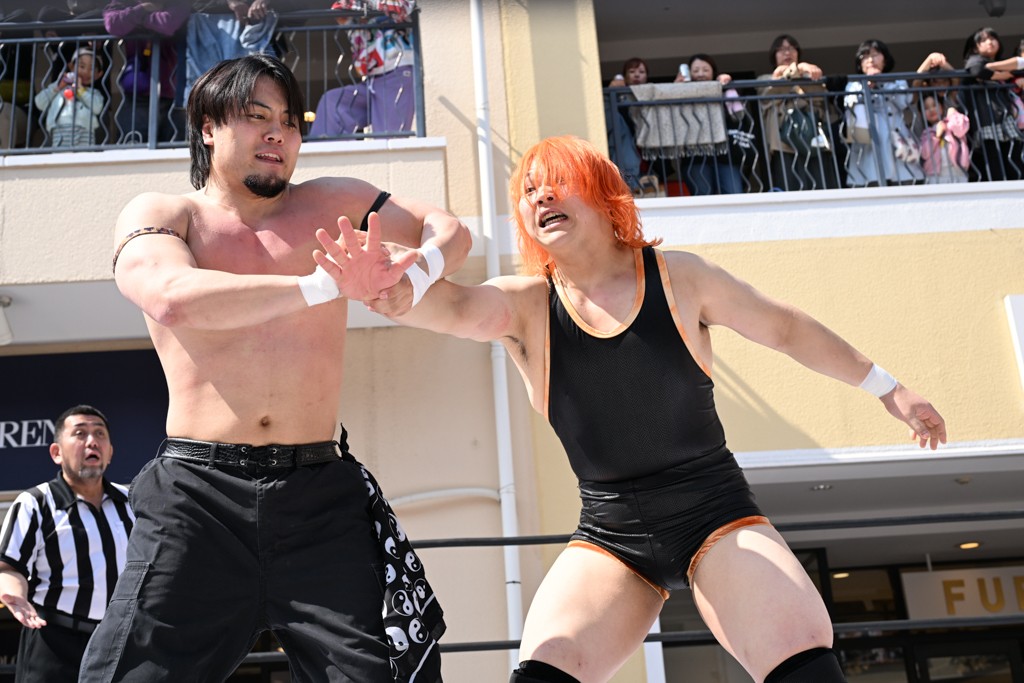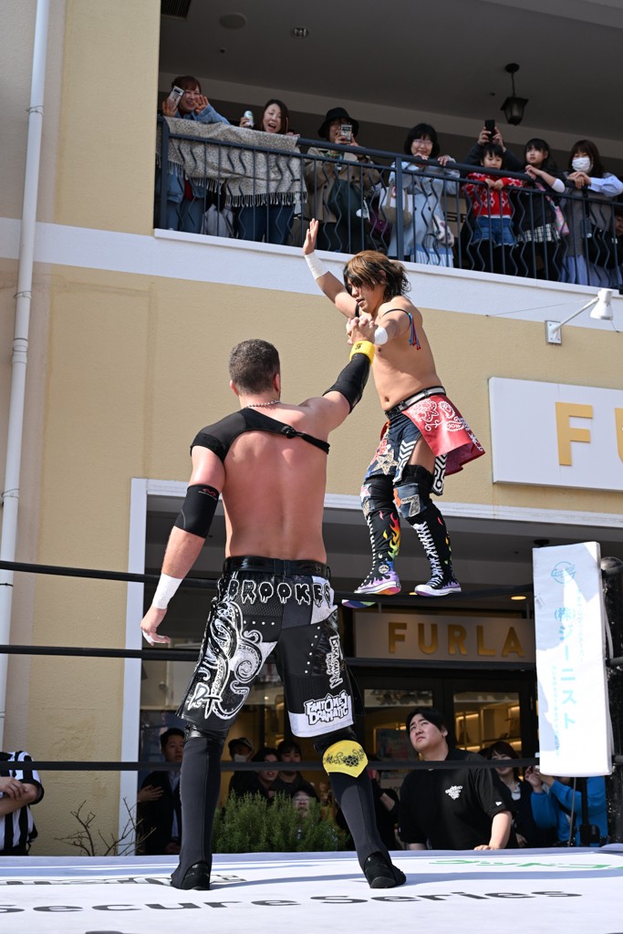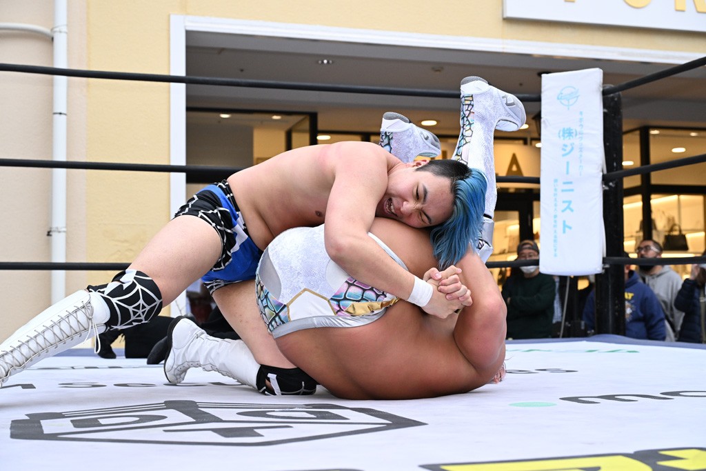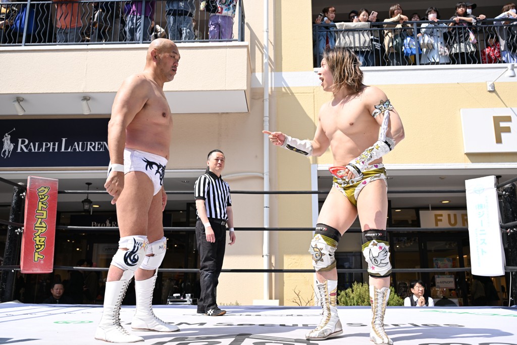 3月28日「DDT×MOP Wrestle Tour 2026 in 三井アウトレットパーク 多摩南大沢」東京・三井アウトレットパーク 多摩南大沢大会が開催。DDTと三井アウトレットパークがタッグを組んで行われたコラボレーション大会。朝早くから沢山のお客さんが駆け付け大盛況となった。メインにはこのコラボ大会のために新設されたMOPタッグ王座の初代王者を決める一戦、KANON&ビエント・マリグノ with KIMIHIROvs宮脇純太&瑠希也がラインナップされた。ゴングが鳴るとまずはマリグノと宮脇が一進一退のルチャの攻防。続いてKANONと瑠希也に代わると、瑠希也がKANONに真っ向勝負を挑むが次第に劣勢に陥ってしまう。これを耐えた瑠希也が逆転に成功し宮脇にタッチを繋ぐと、宮脇は三角飛びプランチャを決め一気にペースを引き戻す。宮脇が瑠希也に試合を託すと、瑠希也はエルボーで果敢に攻め込み、得意のプロトボムも決めて見せる。さらに丸め込みであわや3カウント、という場面を何度も作るがKANONがクリア。KANONがブレーンバスターからスリーピー・ホロウを決めて勝利を確信するも、瑠希也はこれをカウント2でクリア。KANONのショートレンジ・ラリアットもカウント2で返すなど、驚異的な粘りを見せる瑠希也。しかしそんな瑠希也の思いを断ち切るように、KANONがラリアットをぶち込むと、瑠希也も返せず3カウント。KANON&マリグノが初代MOPタッグ王者に輝いた。