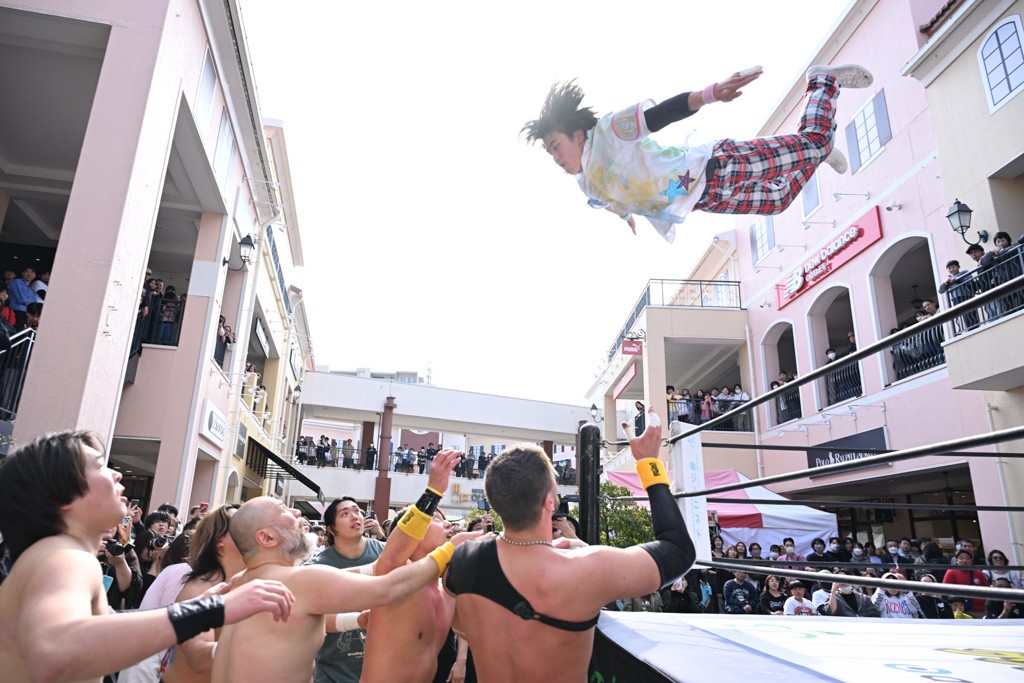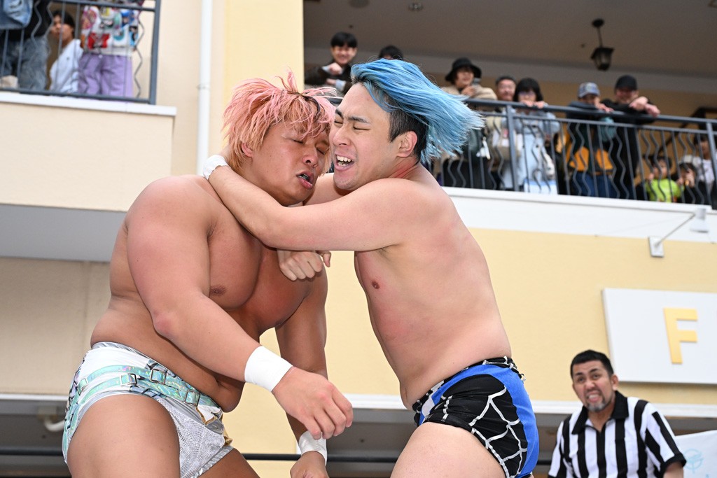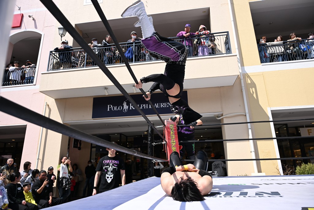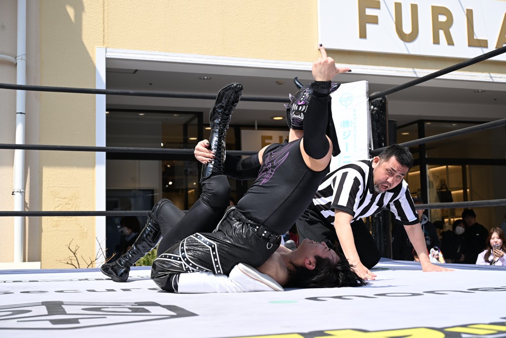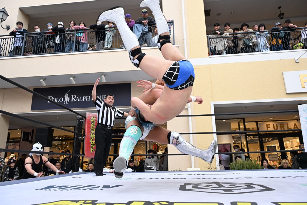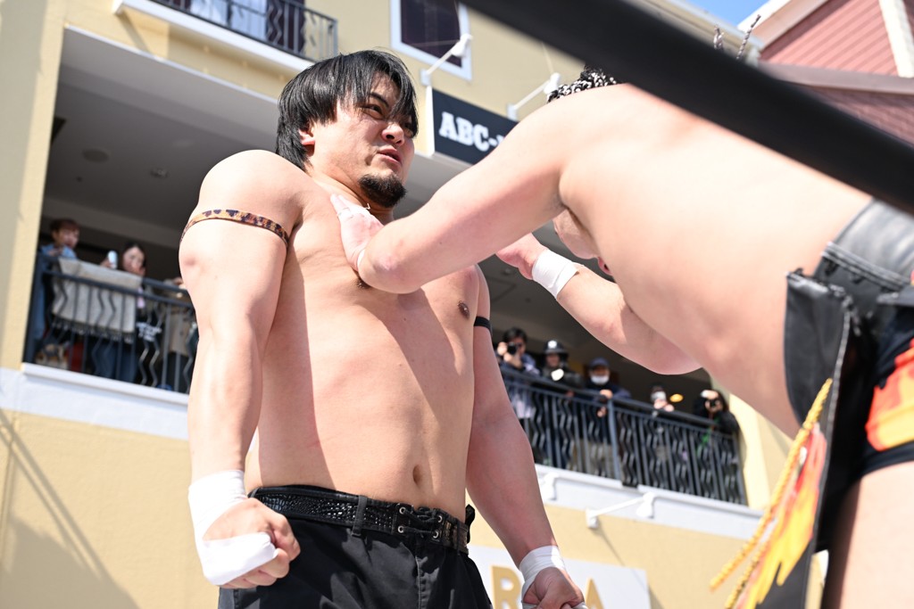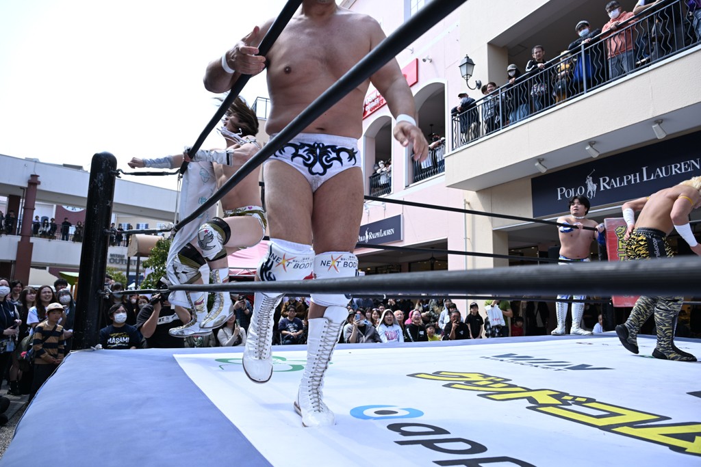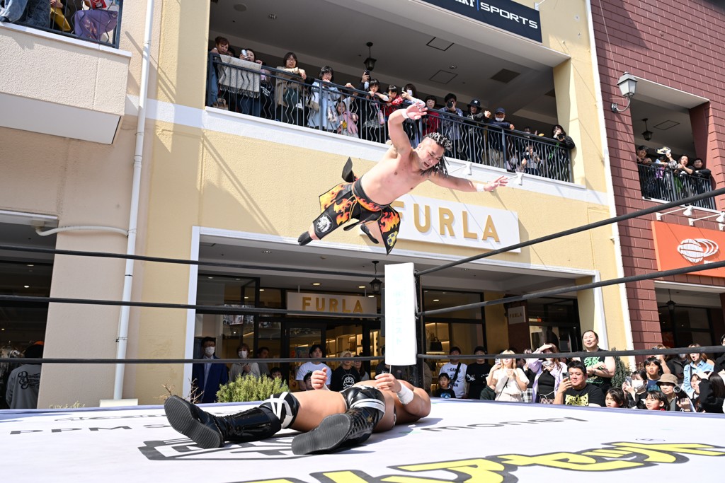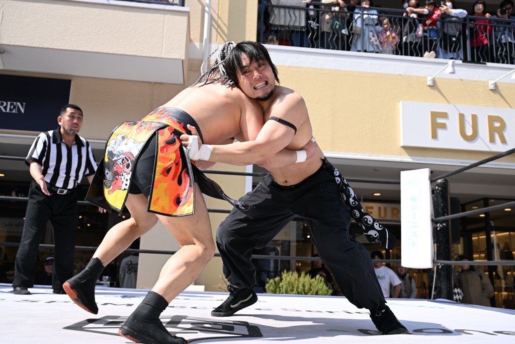 3月28日「DDT×MOP Wrestle Tour 2026 in 三井アウトレットパーク 多摩南大沢」東京・三井アウトレットパーク 多摩南大沢大会が開催。DDTと三井アウトレットパークがタッグを組んで行われたコラボレーション大会。朝早くから沢山のお客さんが駆け付け大盛況となった。メインにはこのコラボ大会のために新設されたMOPタッグ王座の初代王者を決める一戦、KANON&ビエント・マリグノ with KIMIHIROvs宮脇純太&瑠希也がラインナップされた。ゴングが鳴るとまずはマリグノと宮脇が一進一退のルチャの攻防。続いてKANONと瑠希也に代わると、瑠希也がKANONに真っ向勝負を挑むが次第に劣勢に陥ってしまう。これを耐えた瑠希也が逆転に成功し宮脇にタッチを繋ぐと、宮脇は三角飛びプランチャを決め一気にペースを引き戻す。宮脇が瑠希也に試合を託すと、瑠希也はエルボーで果敢に攻め込み、得意のプロトボムも決めて見せる。さらに丸め込みであわや3カウント、という場面を何度も作るがKANONがクリア。KANONがブレーンバスターからスリーピー・ホロウを決めて勝利を確信するも、瑠希也はこれをカウント2でクリア。KANONのショートレンジ・ラリアットもカウント2で返すなど、驚異的な粘りを見せる瑠希也。しかしそんな瑠希也の思いを断ち切るように、KANONがラリアットをぶち込むと、瑠希也も返せず3カウント。KANON&マリグノが初代MOPタッグ王者に輝いた。