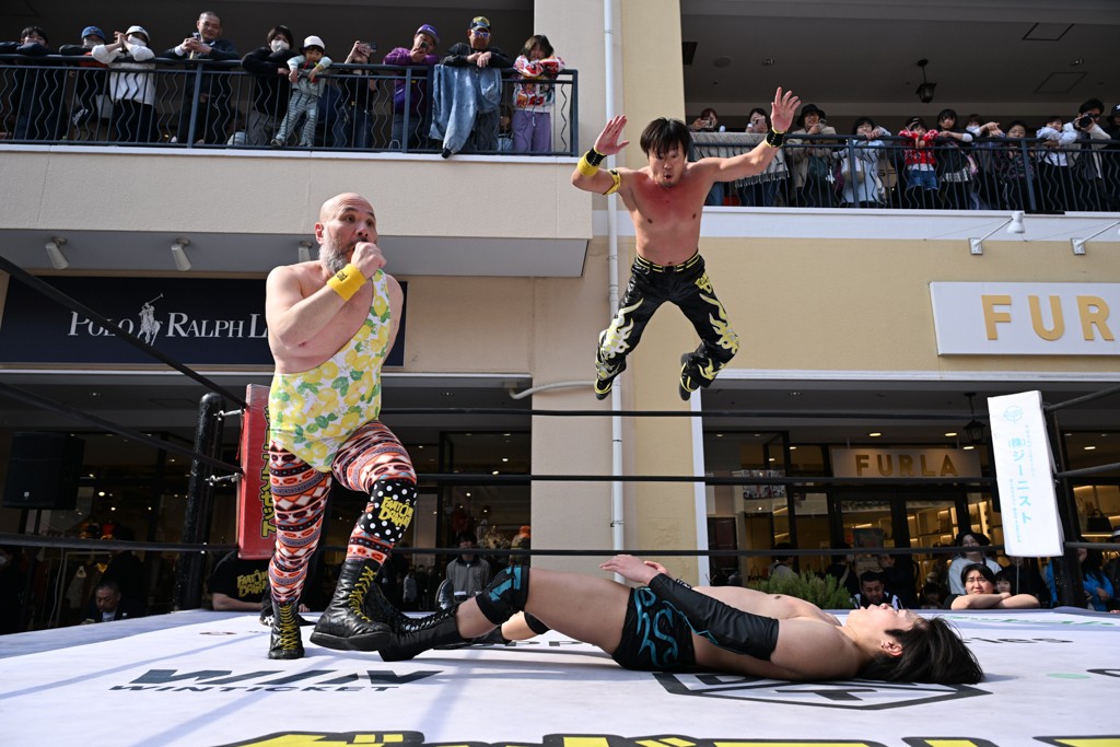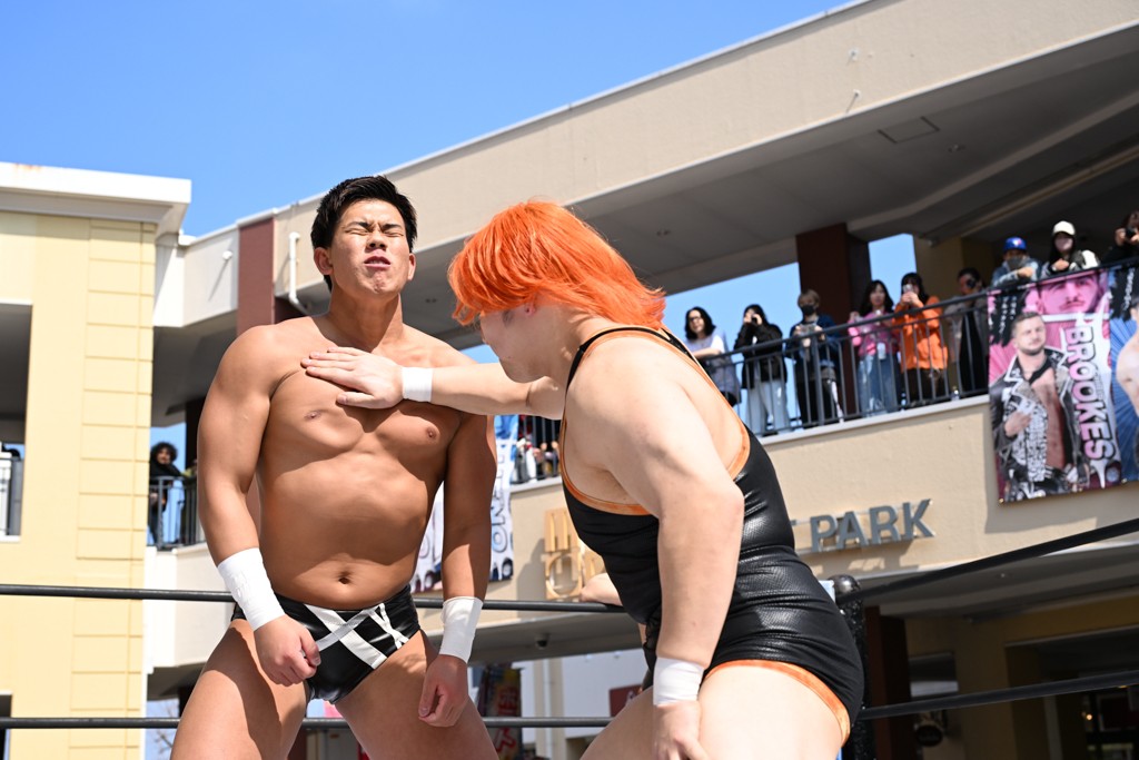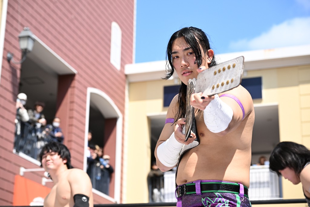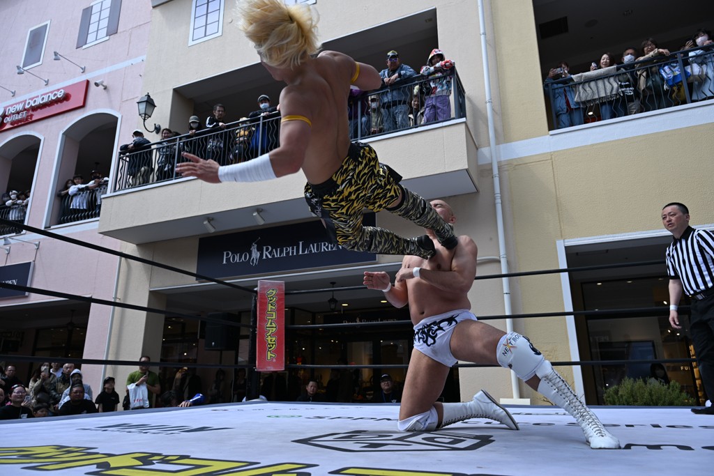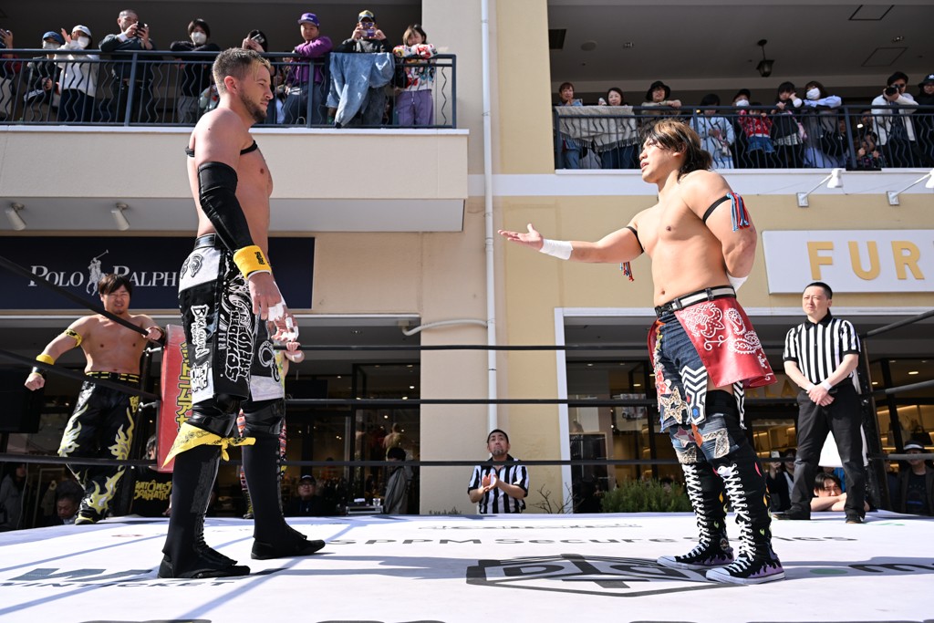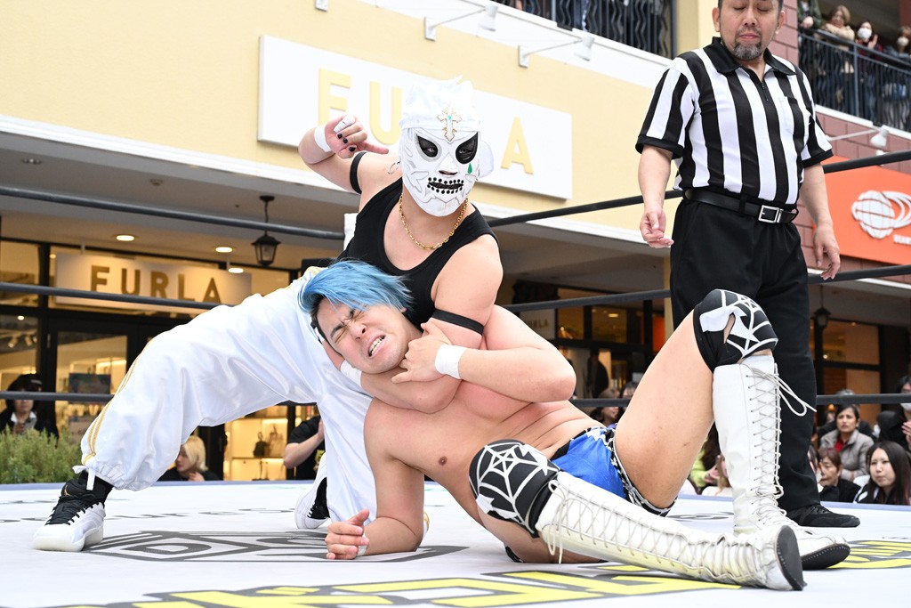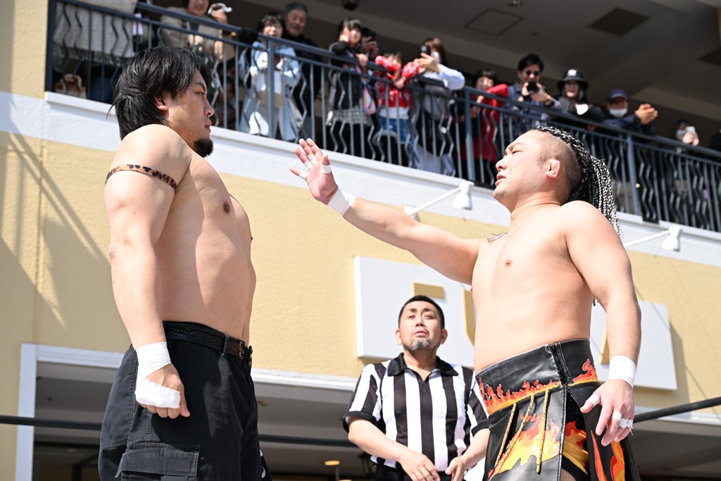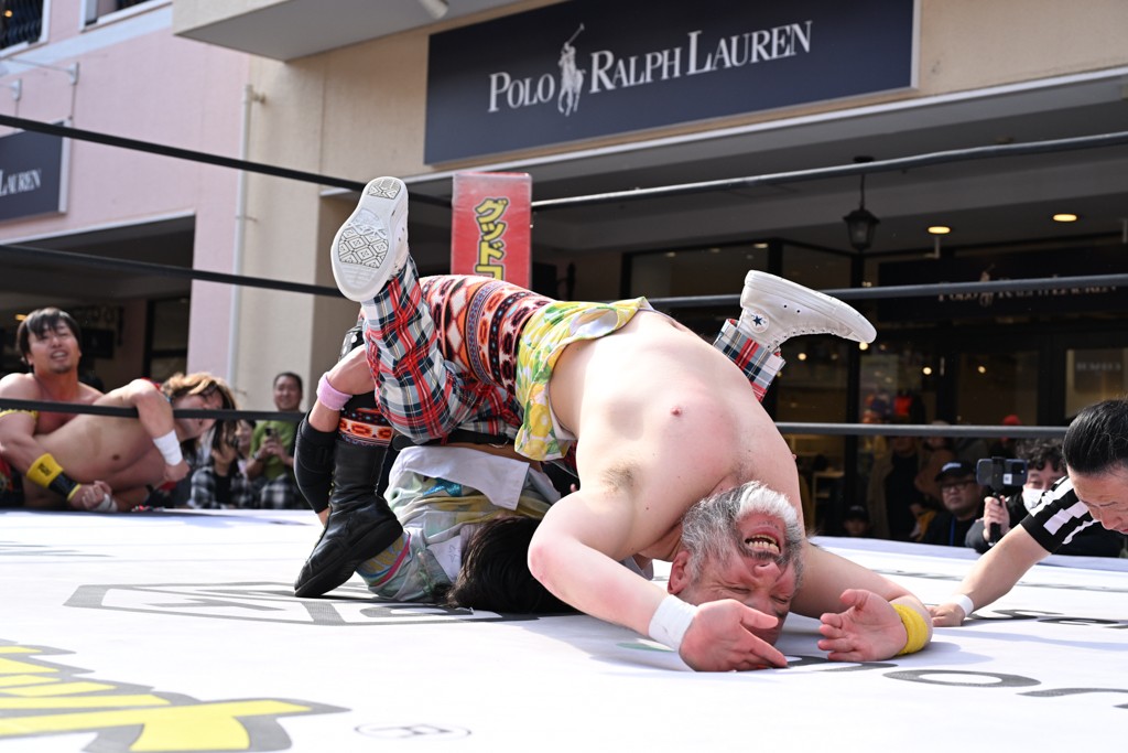 3月28日「DDT×MOP Wrestle Tour 2026 in 三井アウトレットパーク 多摩南大沢」東京・三井アウトレットパーク 多摩南大沢大会が開催。DDTと三井アウトレットパークがタッグを組んで行われたコラボレーション大会。朝早くから沢山のお客さんが駆け付け大盛況となった。メインにはこのコラボ大会のために新設されたMOPタッグ王座の初代王者を決める一戦、KANON&ビエント・マリグノ with KIMIHIROvs宮脇純太&瑠希也がラインナップされた。ゴングが鳴るとまずはマリグノと宮脇が一進一退のルチャの攻防。続いてKANONと瑠希也に代わると、瑠希也がKANONに真っ向勝負を挑むが次第に劣勢に陥ってしまう。これを耐えた瑠希也が逆転に成功し宮脇にタッチを繋ぐと、宮脇は三角飛びプランチャを決め一気にペースを引き戻す。宮脇が瑠希也に試合を託すと、瑠希也はエルボーで果敢に攻め込み、得意のプロトボムも決めて見せる。さらに丸め込みであわや3カウント、という場面を何度も作るがKANONがクリア。KANONがブレーンバスターからスリーピー・ホロウを決めて勝利を確信するも、瑠希也はこれをカウント2でクリア。KANONのショートレンジ・ラリアットもカウント2で返すなど、驚異的な粘りを見せる瑠希也。しかしそんな瑠希也の思いを断ち切るように、KANONがラリアットをぶち込むと、瑠希也も返せず3カウント。KANON&マリグノが初代MOPタッグ王者に輝いた。