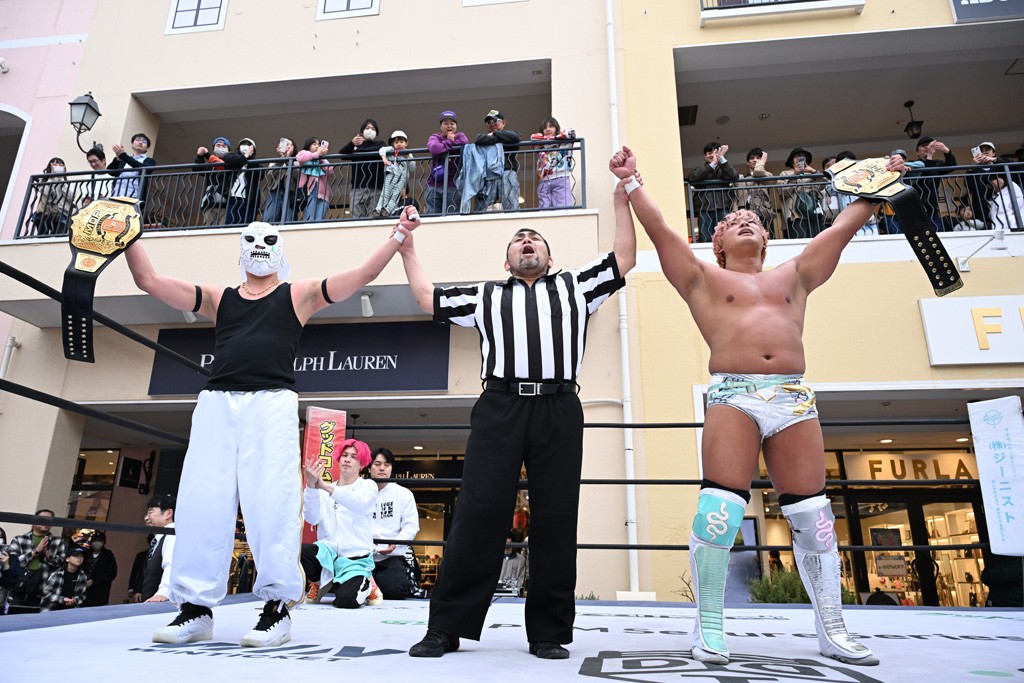DDTと三井アウトレットパークの初コラボ大会は大盛況! 宮脇&瑠希也を破り初代MOPタッグ王者に輝いたKANON&マリグノに大きな野望「このベルトの価値を高めて、三井アウトレットパークのCMに出たい!」