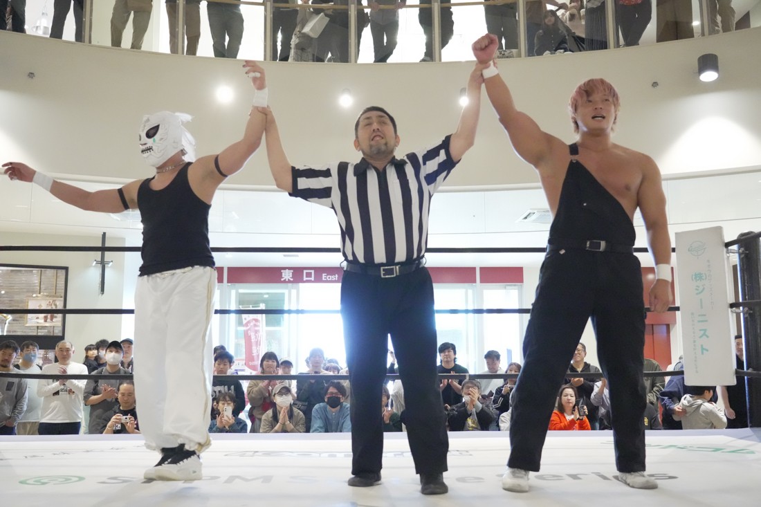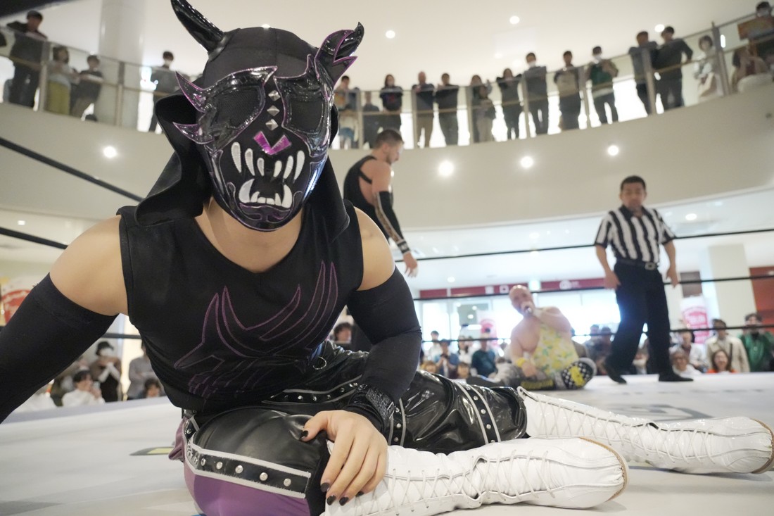 プロレス初観戦のお客さんも多い中、秋山はさすがの大人気! 夢虹も奮闘したが、HARASHIMA&稲畑がMOPタッグ初防衛に成功!